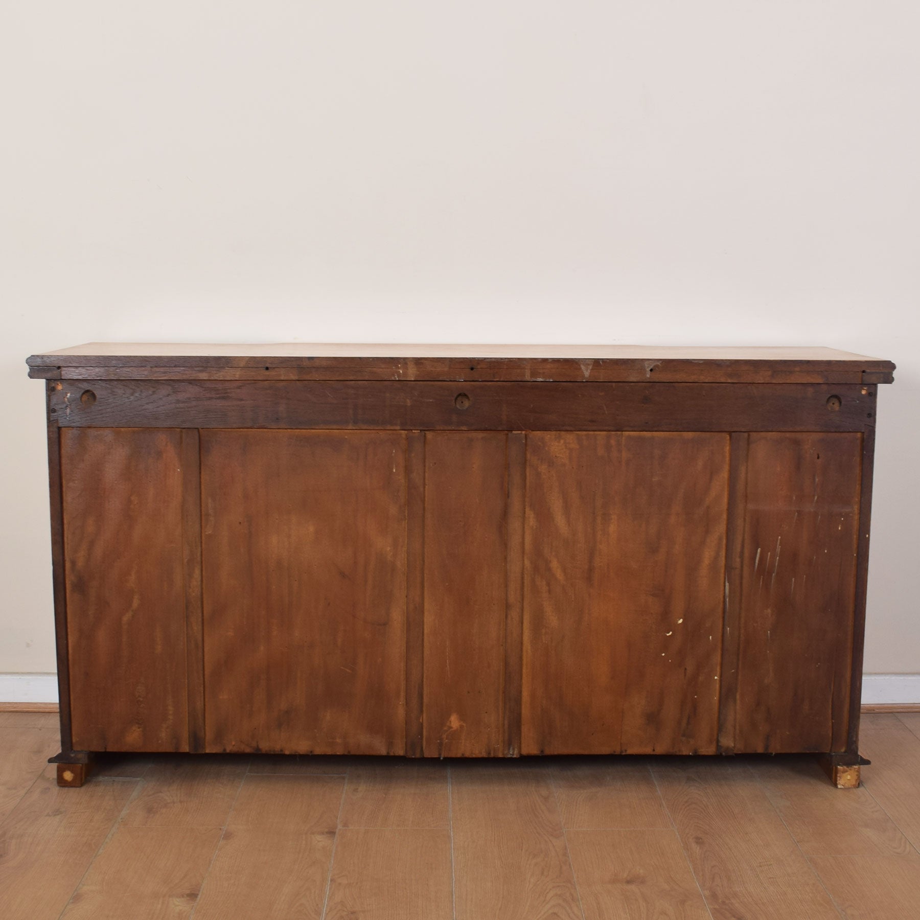 Our restoration workshop has carefully stripped the original varnish from this sideboard before finishing with a professional matt lacquer. The dimensions show the maximum depth of this sideboard measured from back to front in the centre, followed in brackets by the depth measured at the side. It should be noted from the photographs that there are some historic marks on the top of this sideboard. We have also refitted supports under the base.