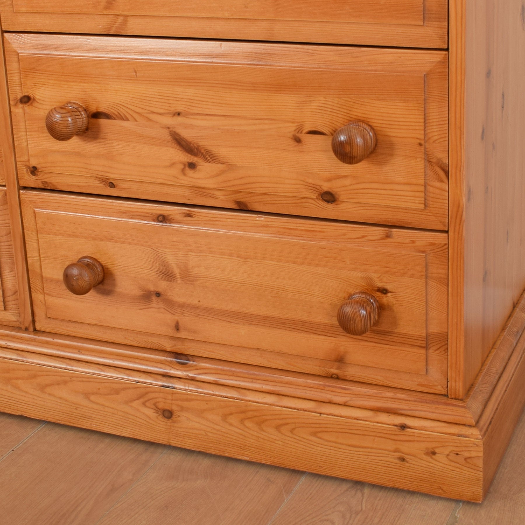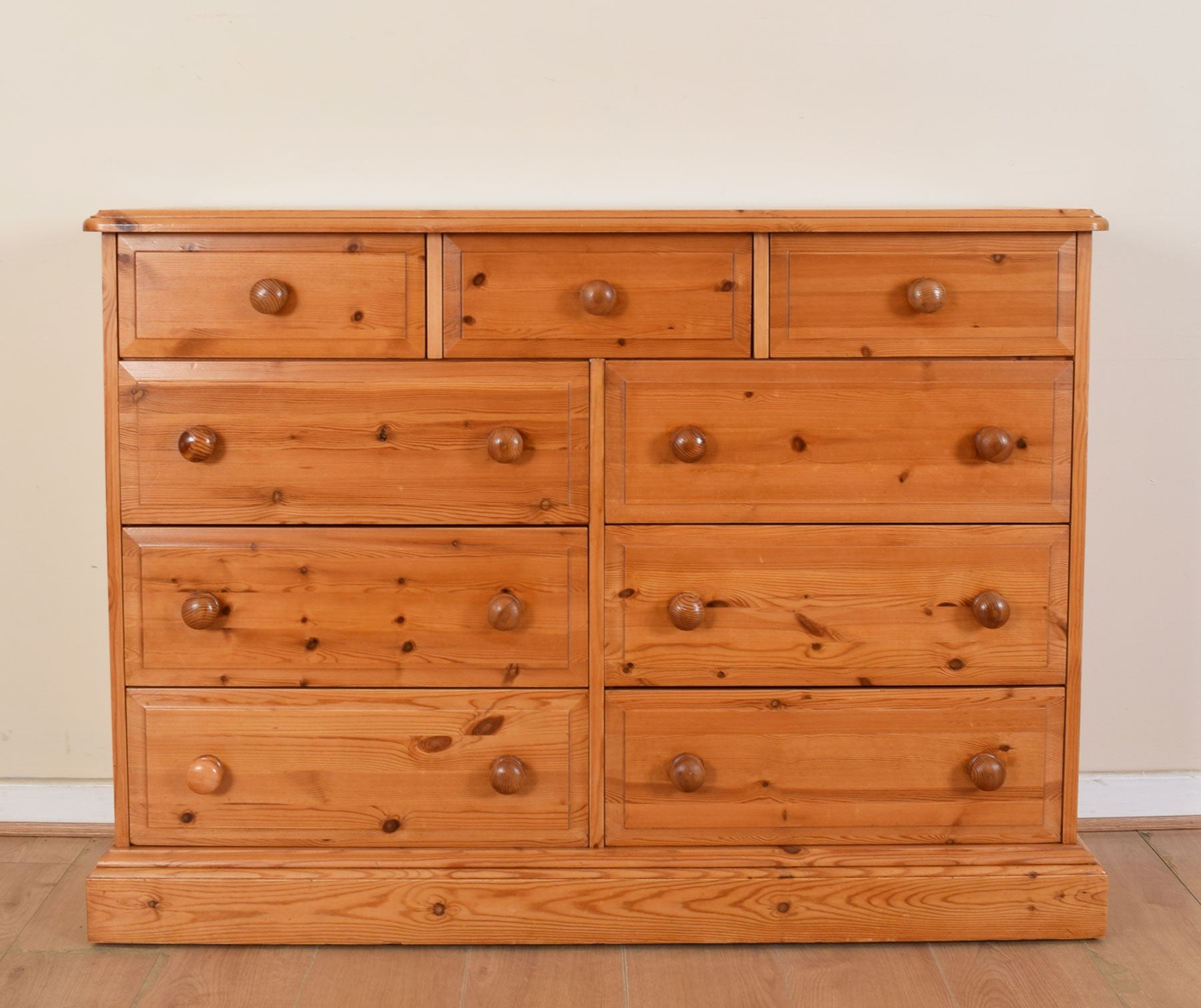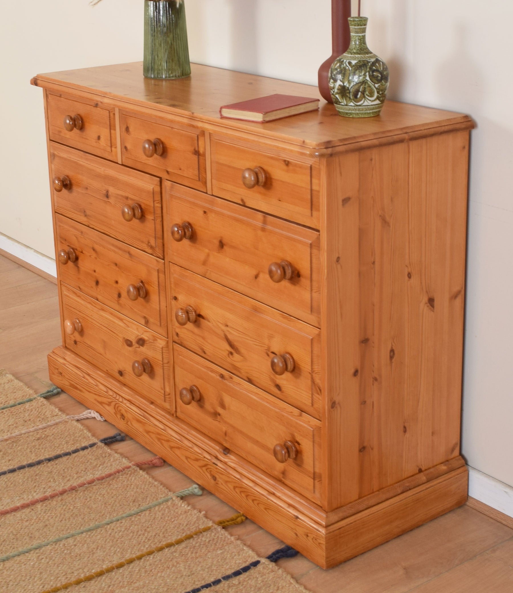 The beautiful pine top is a great place for your favourite ornaments and photographs. Three-quarter-width drawers over six half-width drawers provide plenty of storage space for clothes and other household items. The hand-turned pine handles really enhance the charm of this chest of drawers.