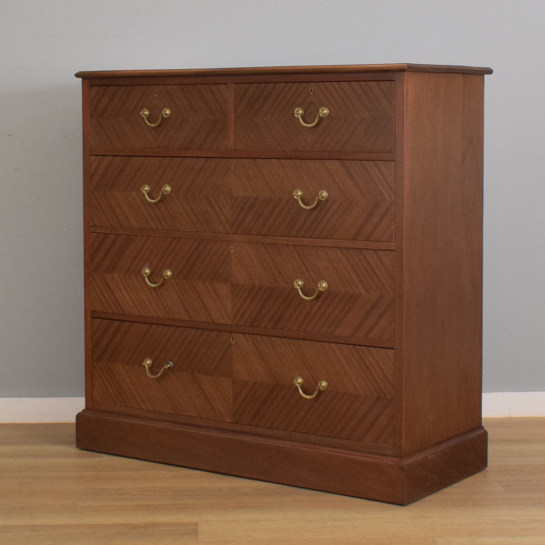 This chest of drawers features two short drawers above three full-width drawers, all fitted with elegant swan-neck brass handles. The drawer fronts are finished in bookmatched mahogany veneer, creating a striking chevron pattern that adds visual interest and a sense of symmetry. The solid top has a finely moulded edge, and the plinth base gives the piece a strong, well-balanced foundation.