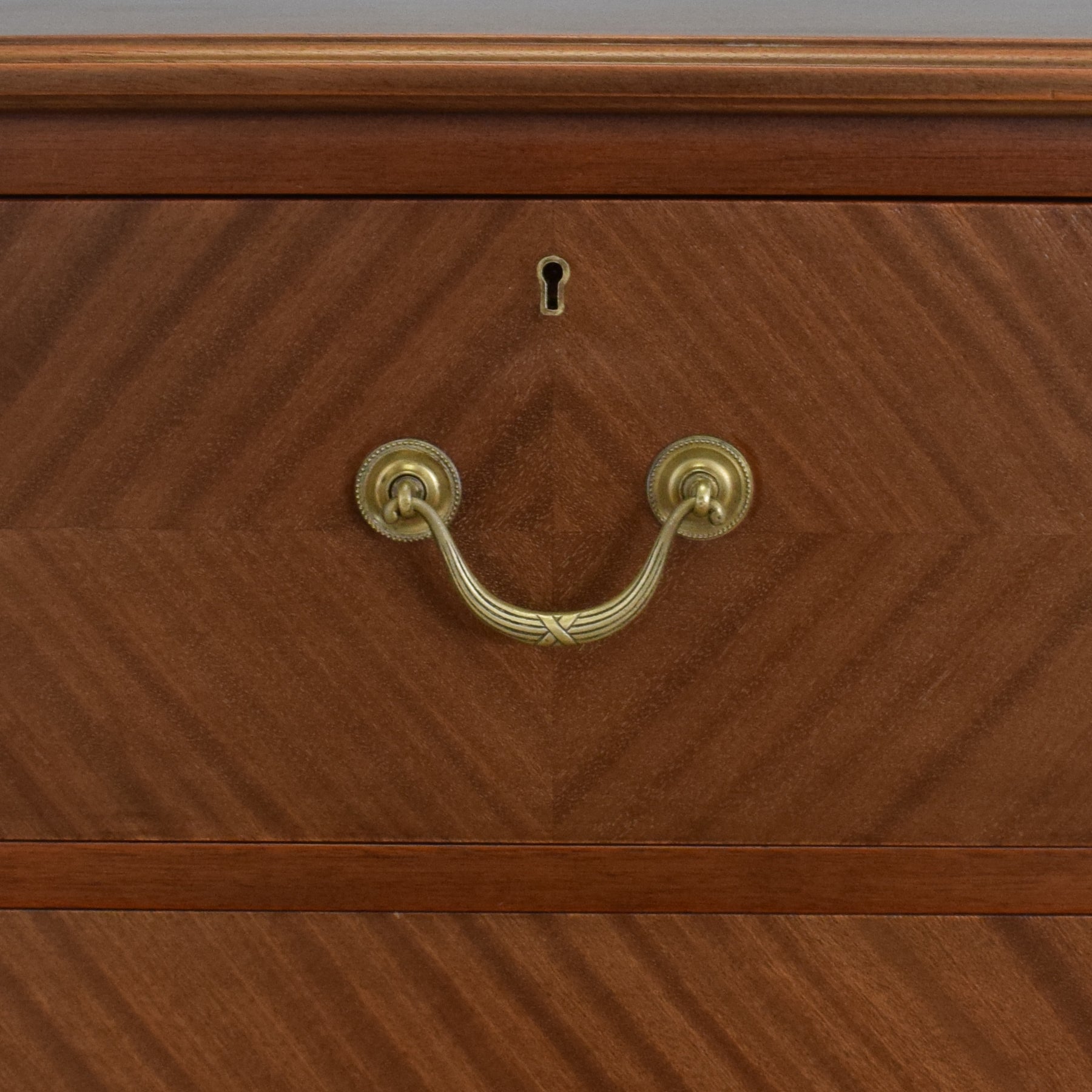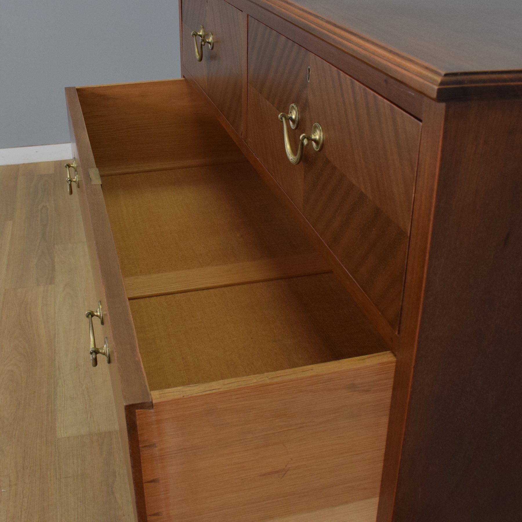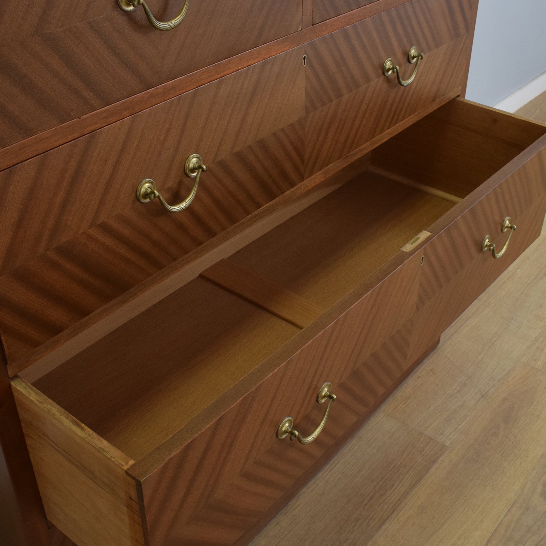 The previous finish has been stripped, and multiple coats of hard-wearing matte lacquer have been applied, offering a durable surface that enhances the warm tones and distinctive grain patterns of the mahogany. The chest is constructed using a mixture of solid mahogany and mahogany veneer. Pine has been used for the rear panels and drawer bases.