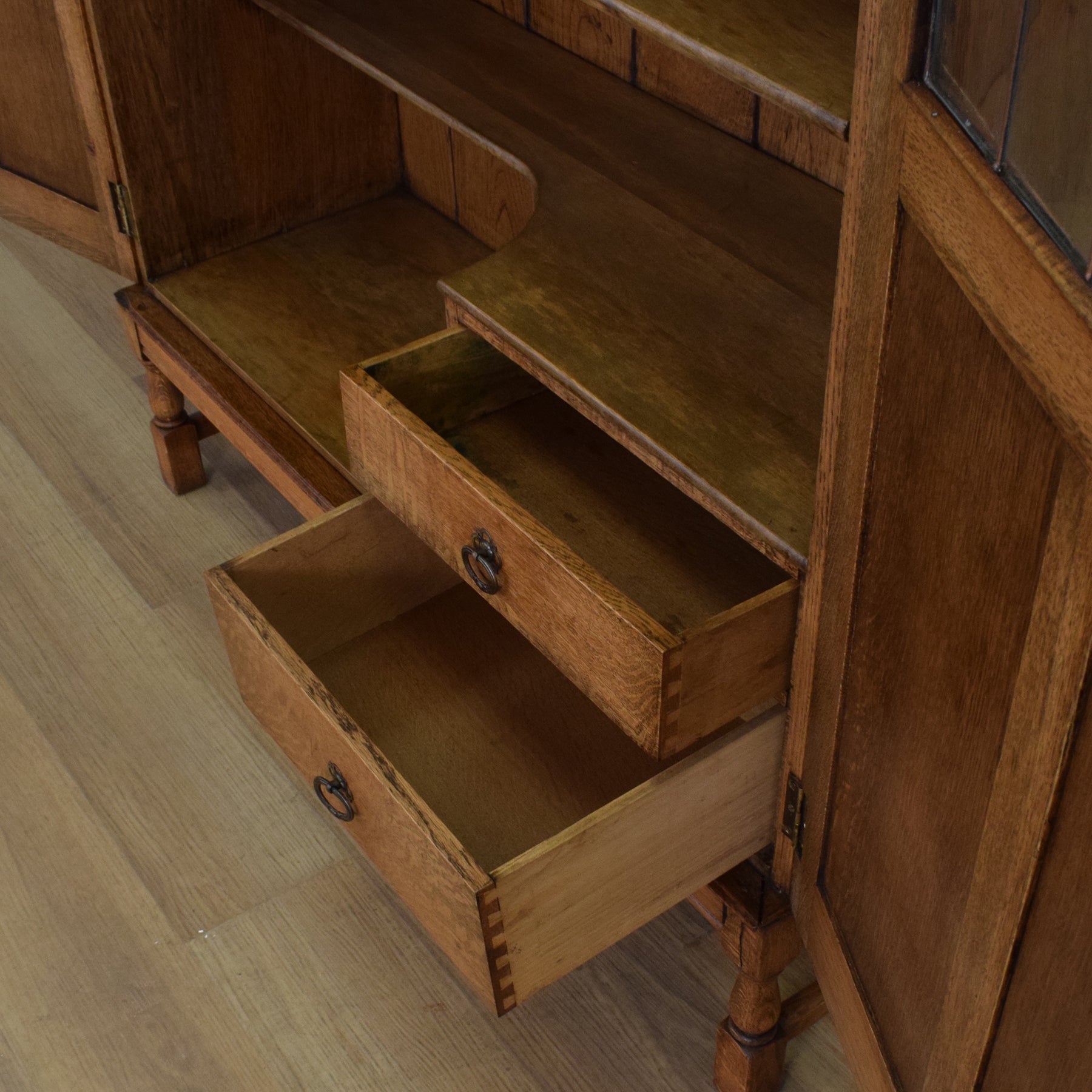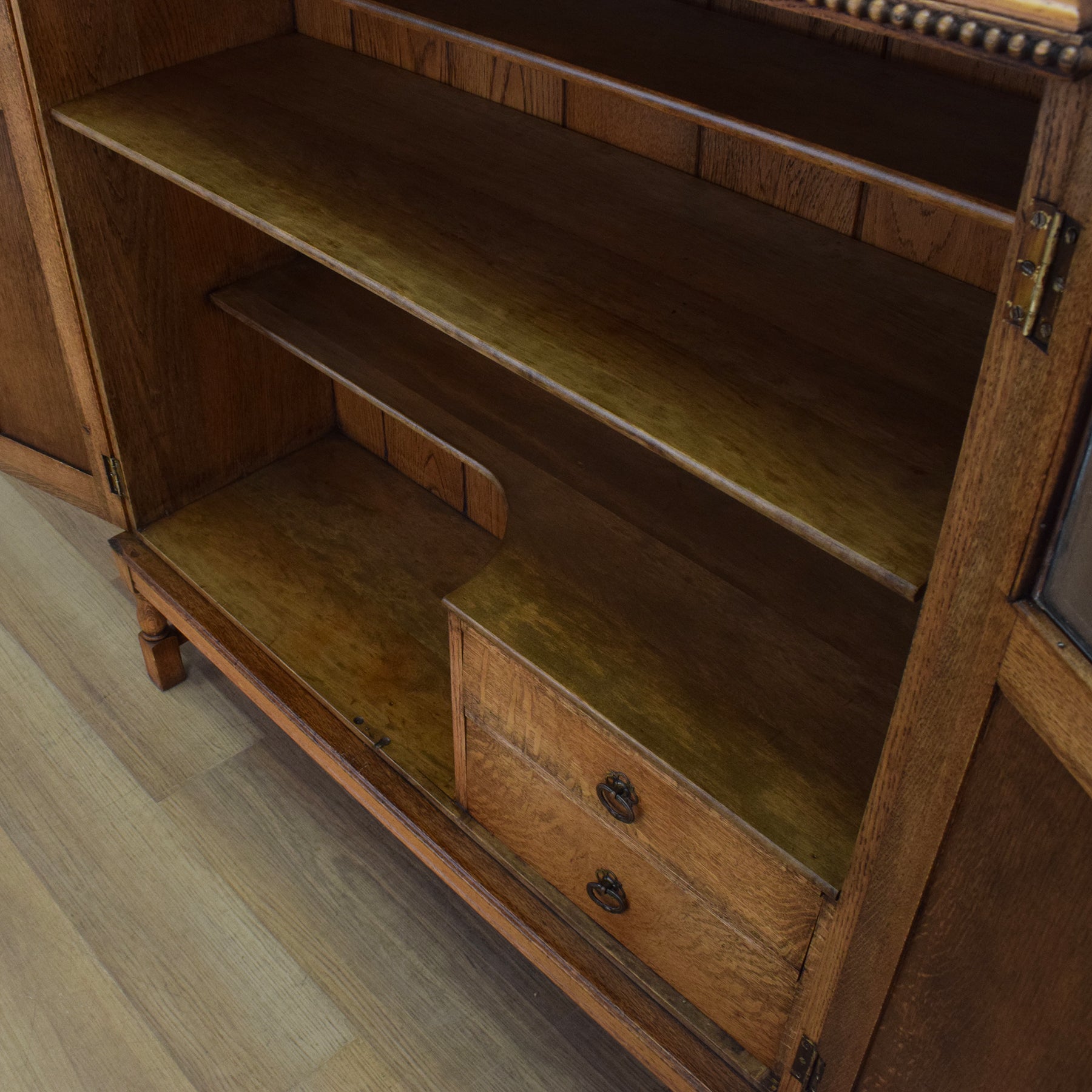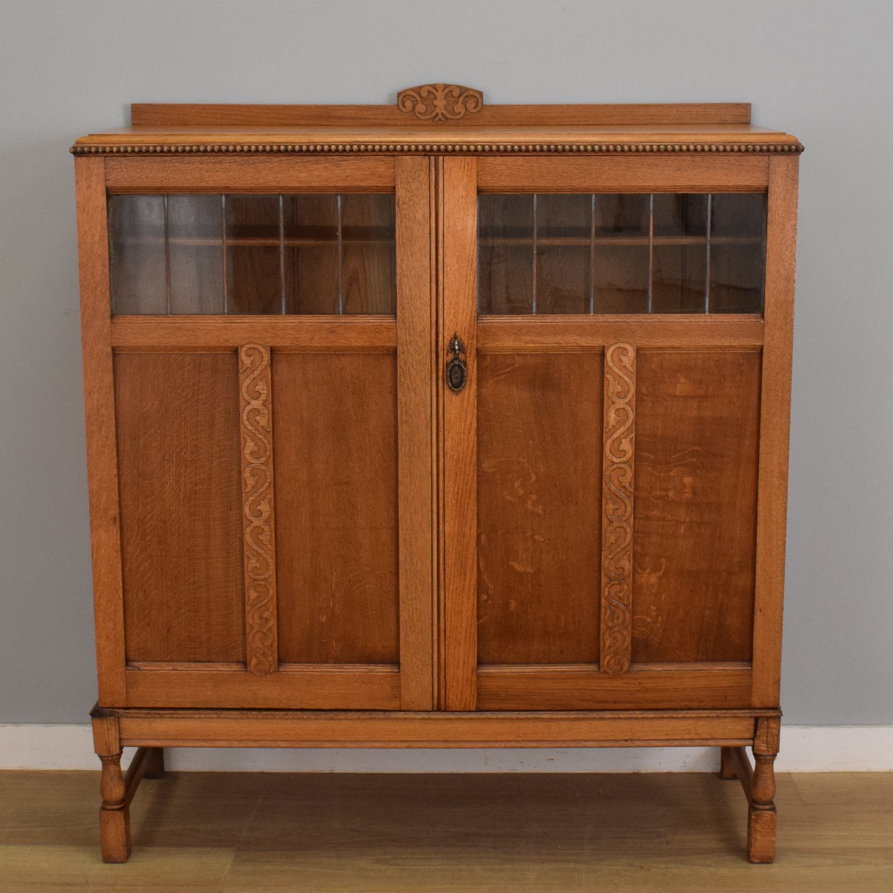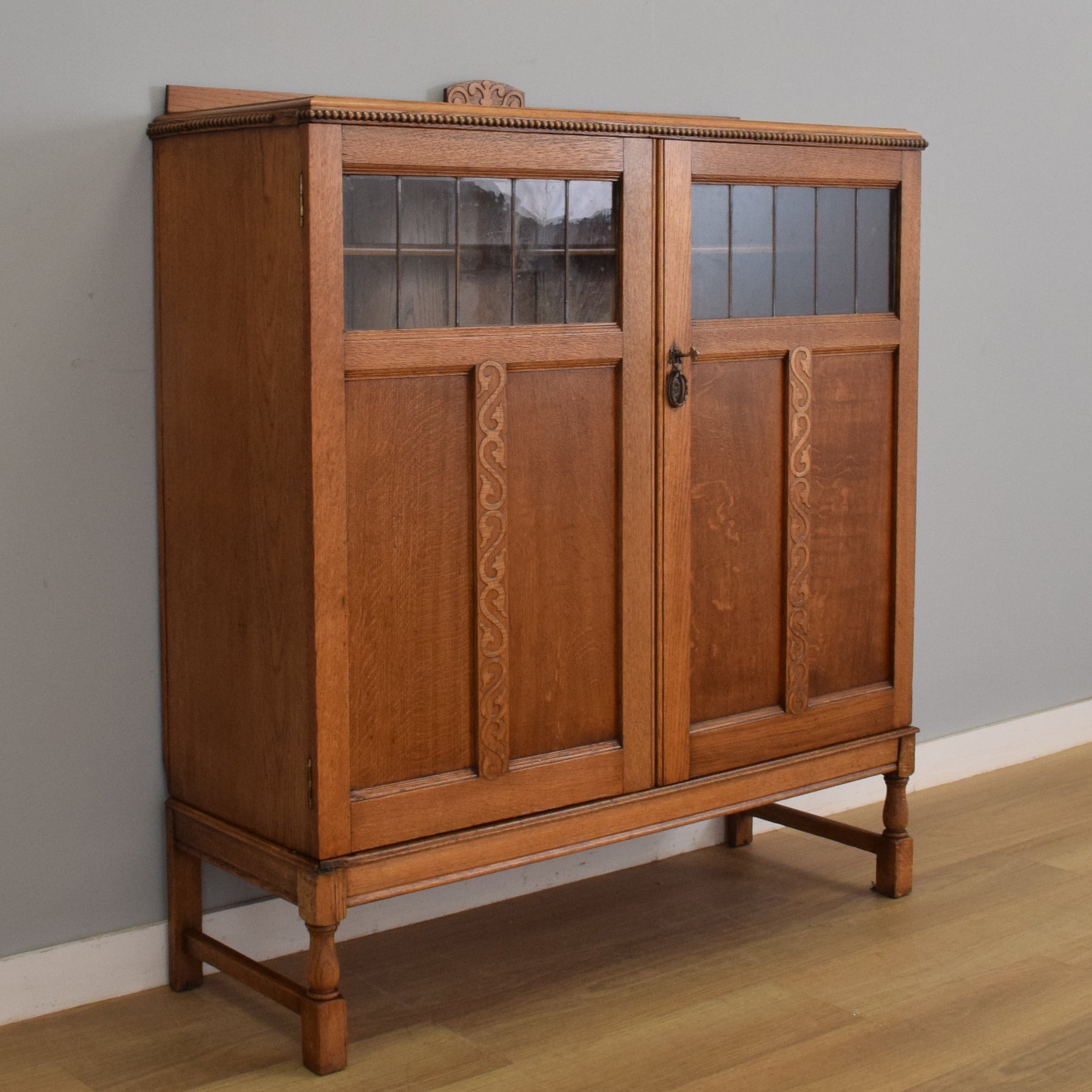This solid oak cabinet features a striking design, with two panelled doors set beneath a row of leaded glass panes. Decorative carved strips add vertical interest to the front, while a shaped pediment and delicate beading detail just below the top edge lend a refined finishing touch. Inside, the cabinet is fitted with three shelves and two drawers, all backed by attractive vertical oak planks. The drawers retain their original ring handles, and the door fastens with a traditional metal escutcheon and key.