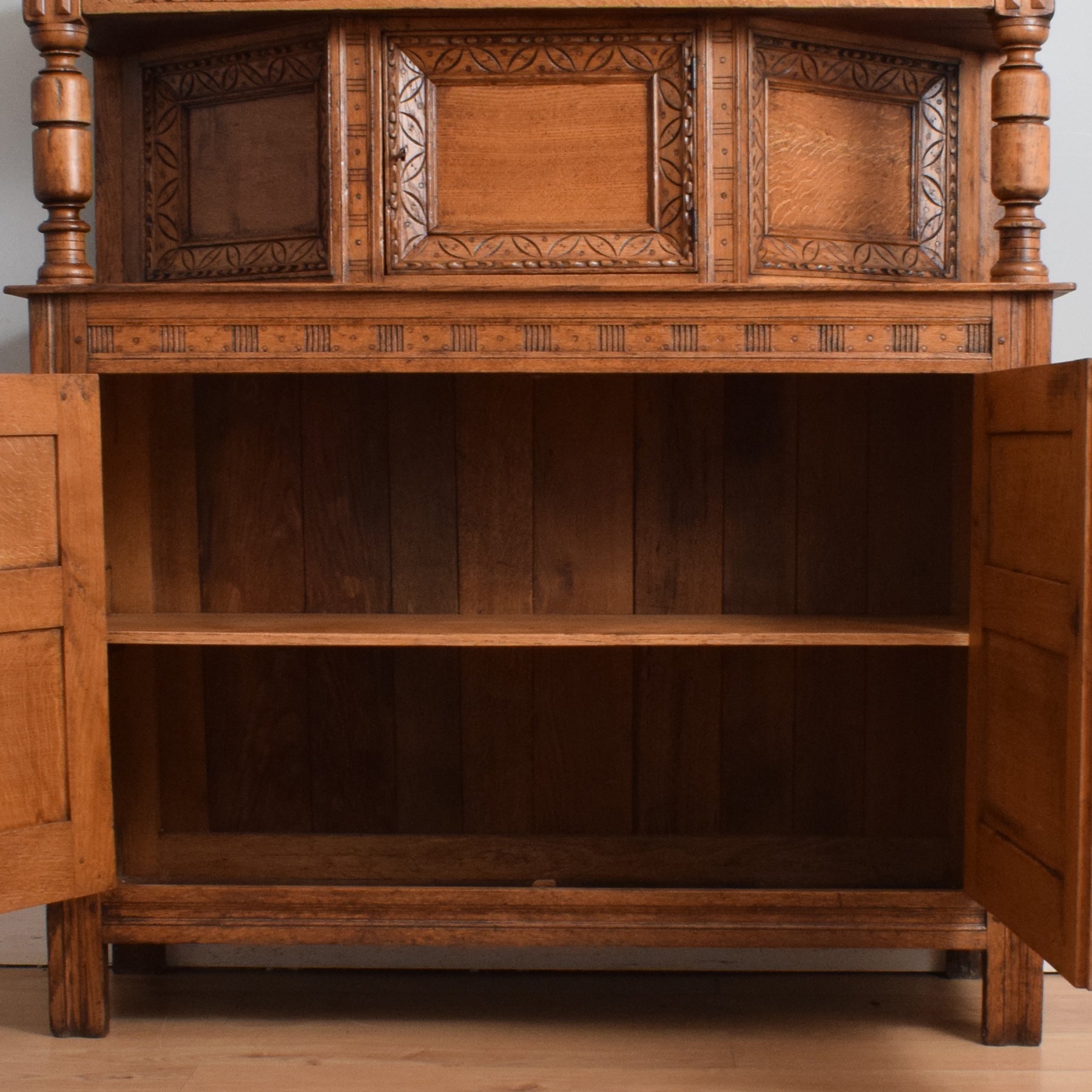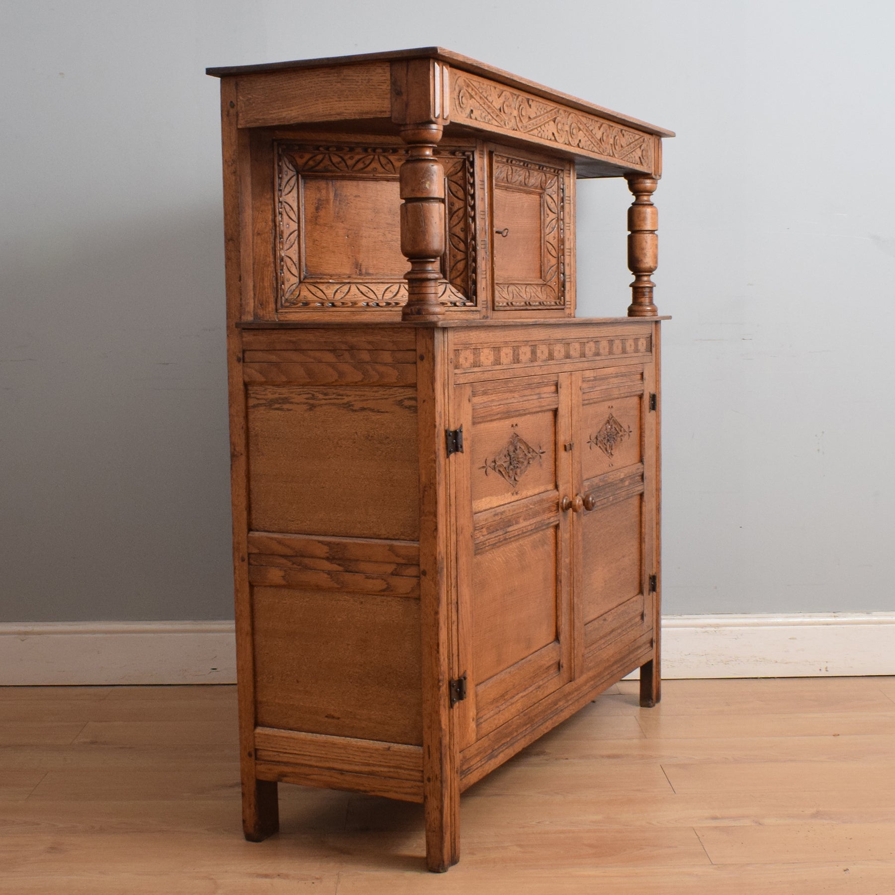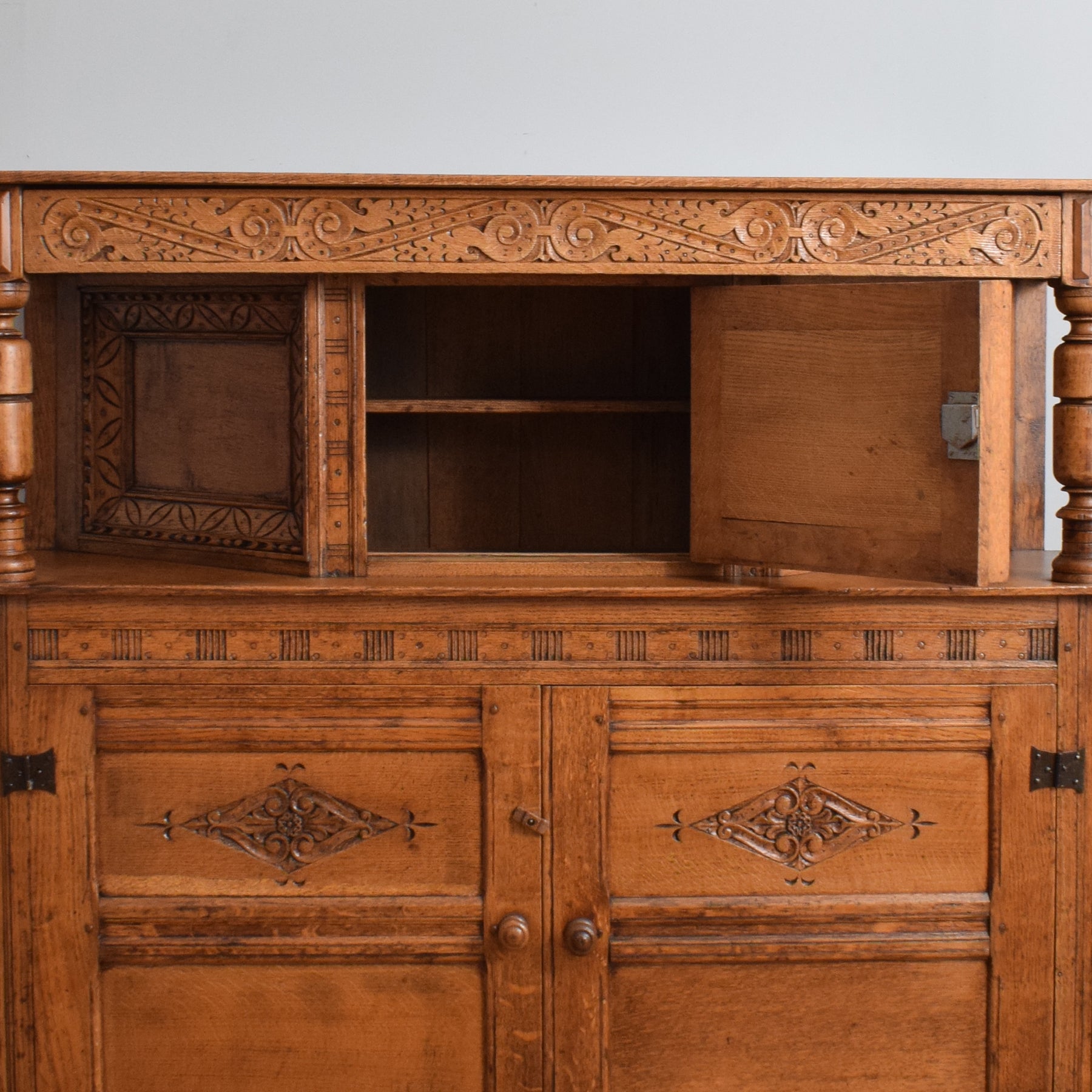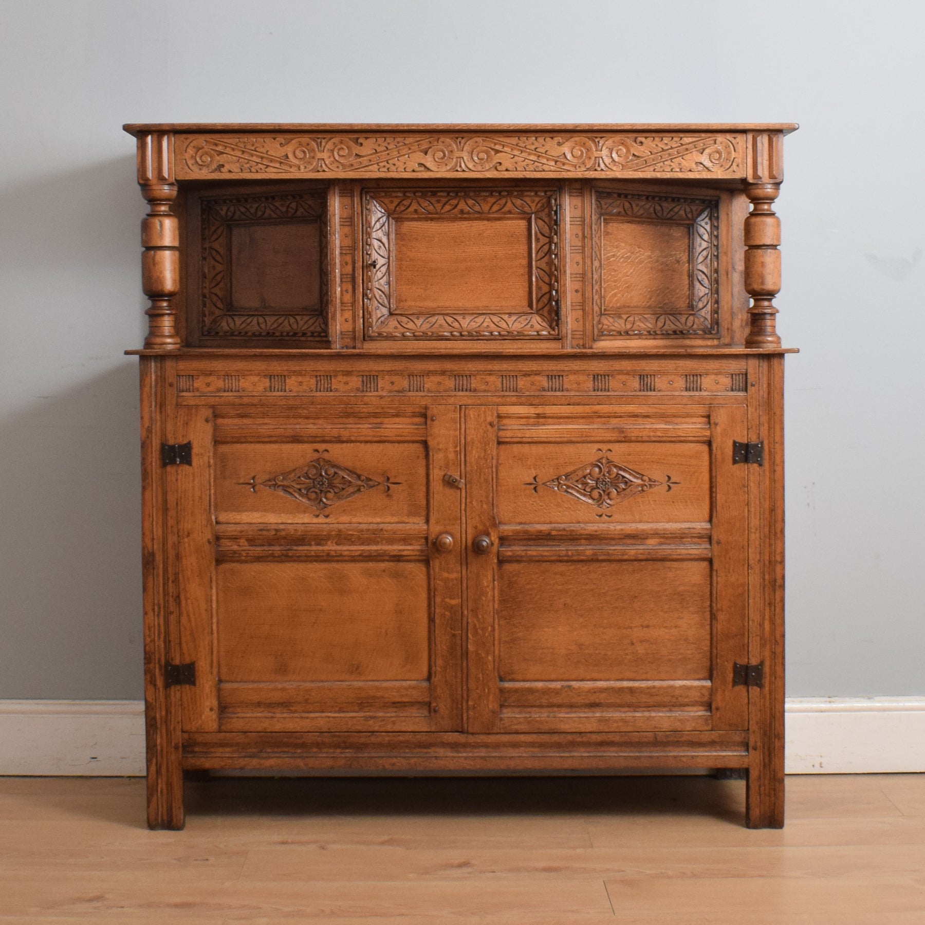 This exquisitely carved oak court cabinet is destined to assume a place of prestige in any household, perfectly suited for gracing a hallway, living room, or dining area.