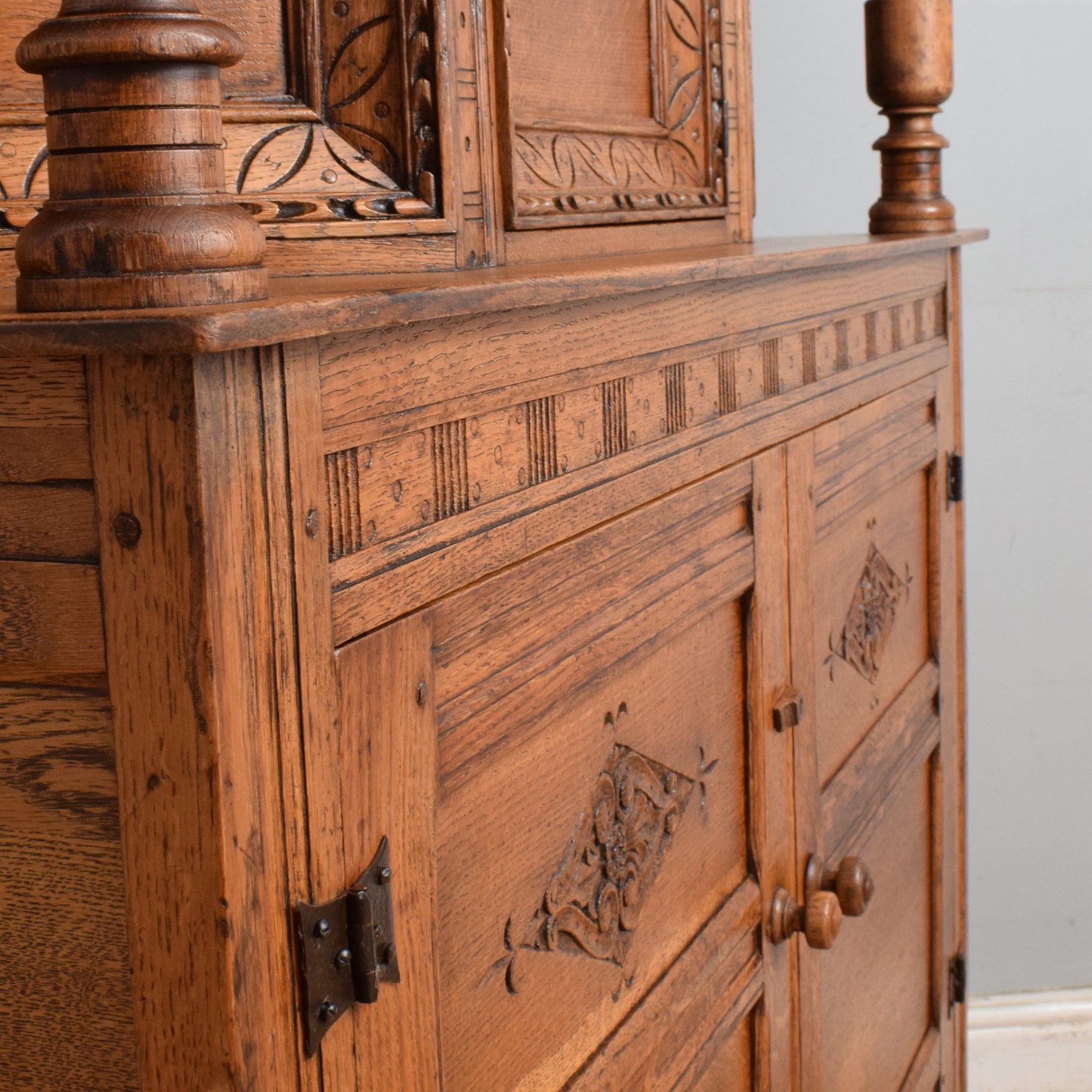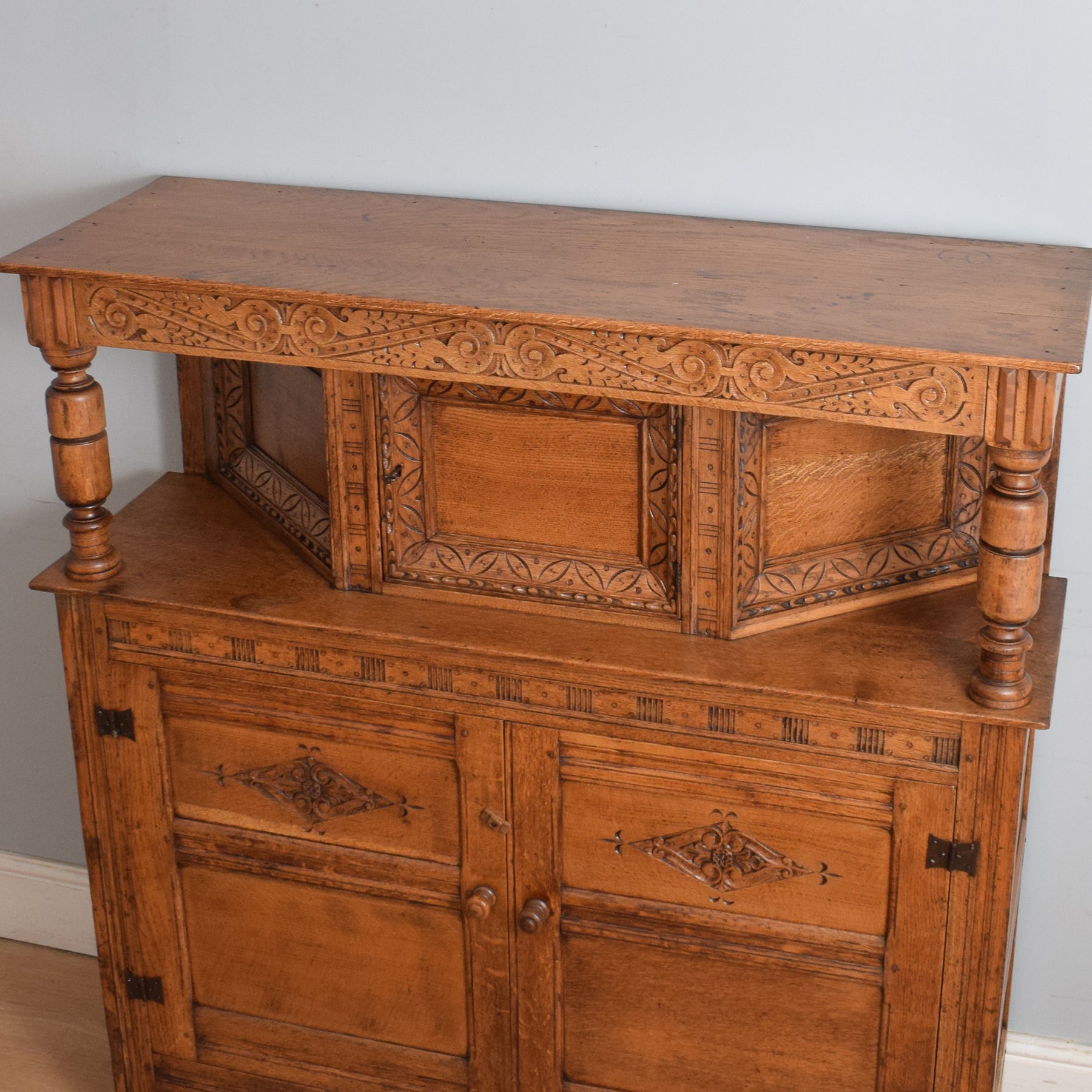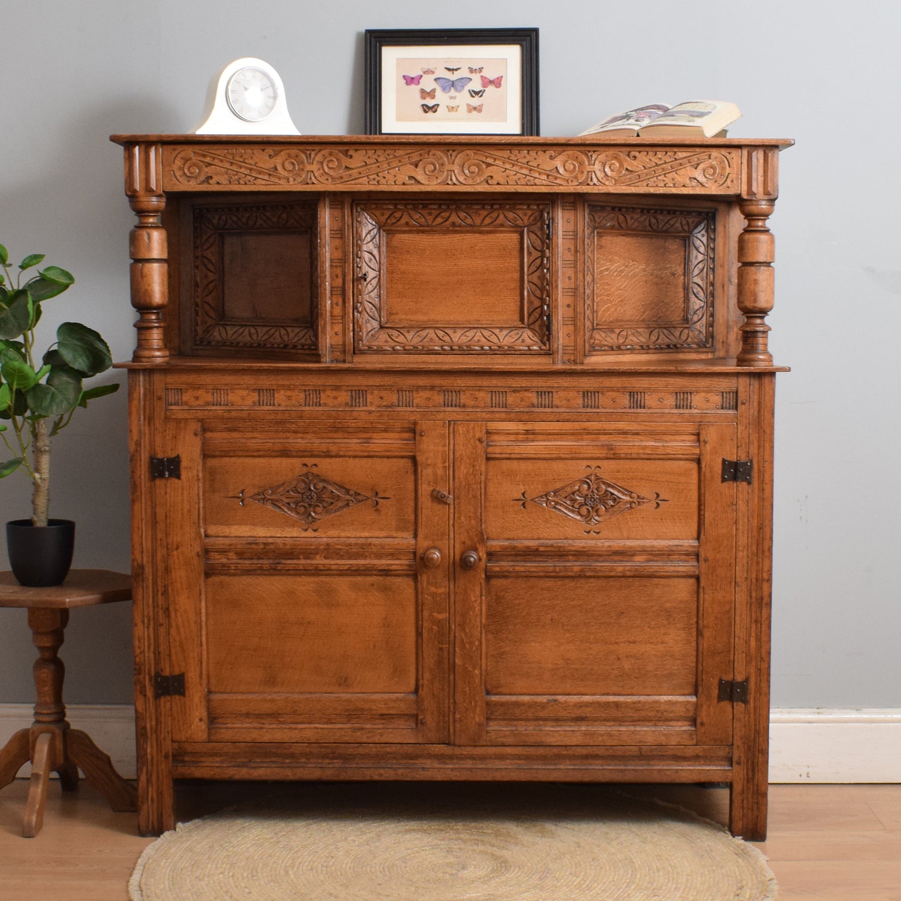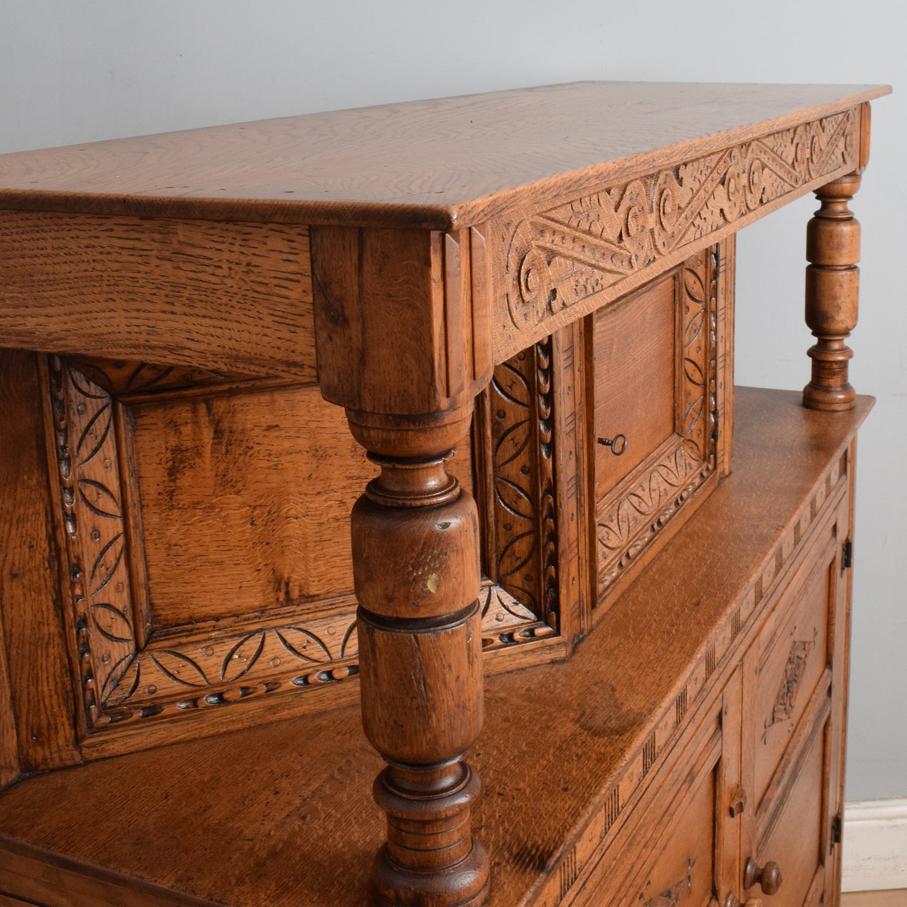 This exquisitely carved oak court cabinet is destined to assume a place of prestige in any household, perfectly suited for gracing a hallway, living room, or dining area.