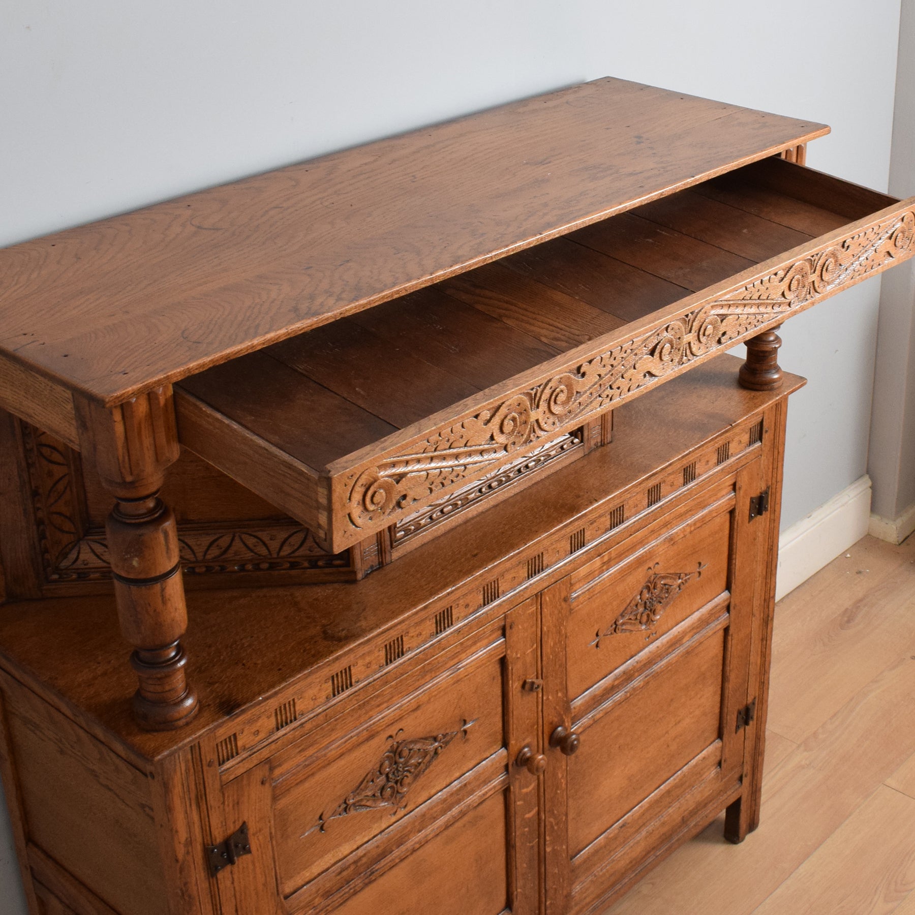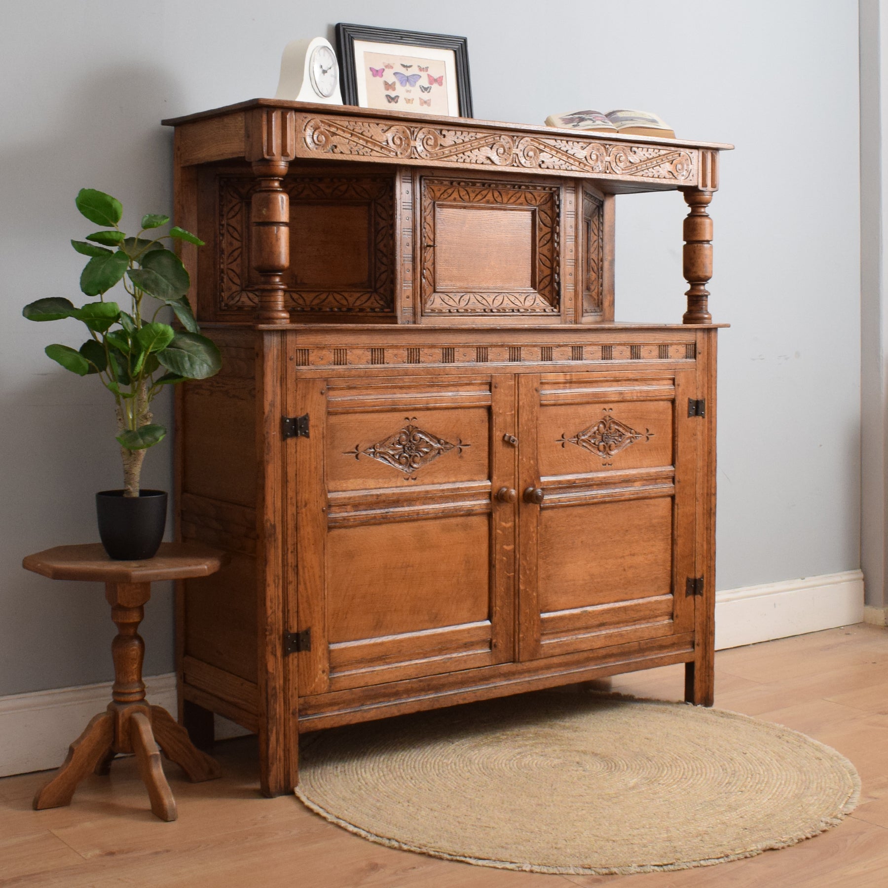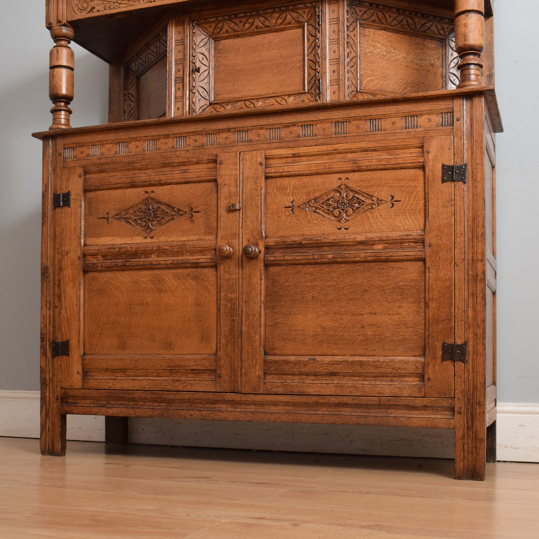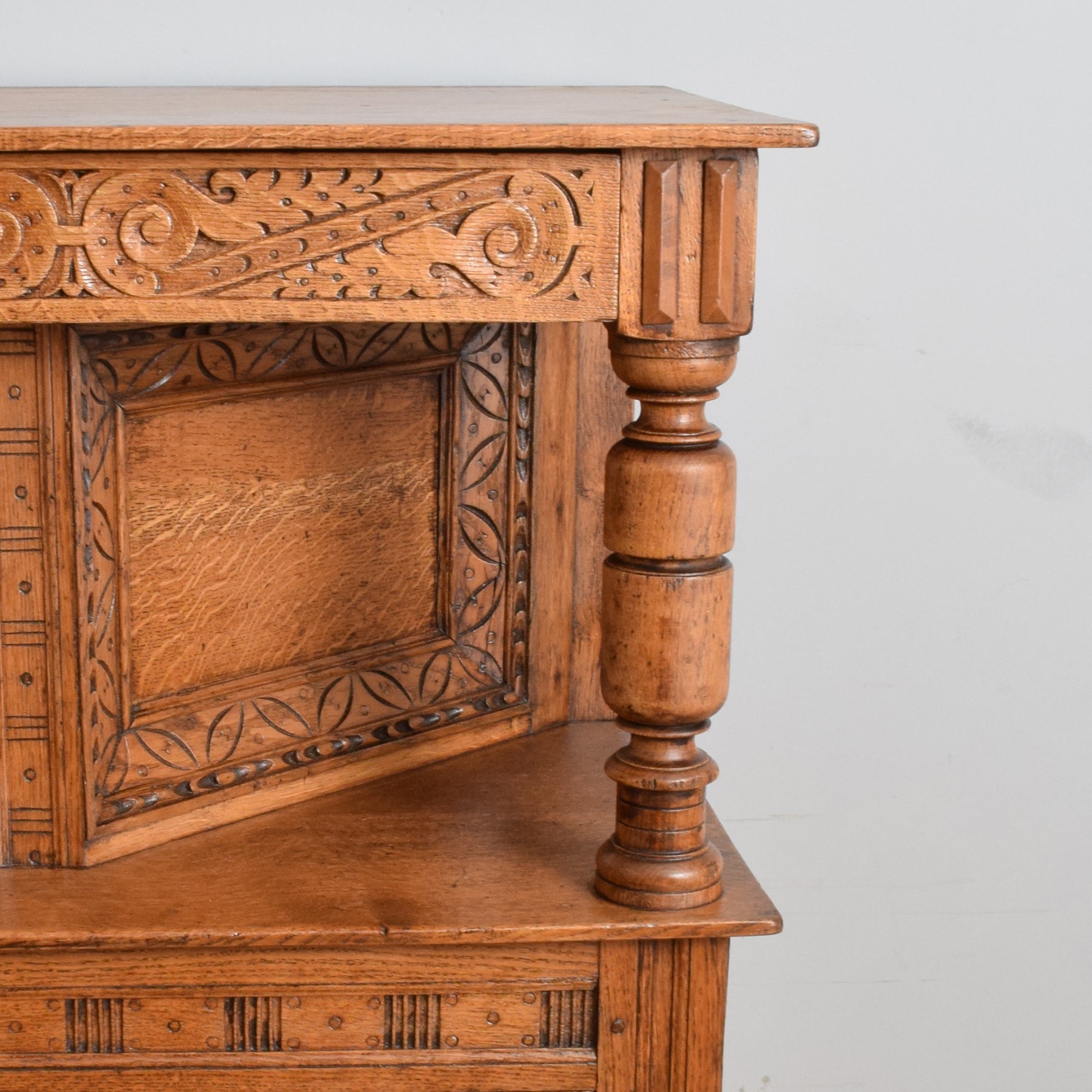 This exquisitely carved oak court cabinet is destined to assume a place of prestige in any household, perfectly suited for gracing a hallway, living room, or dining area.