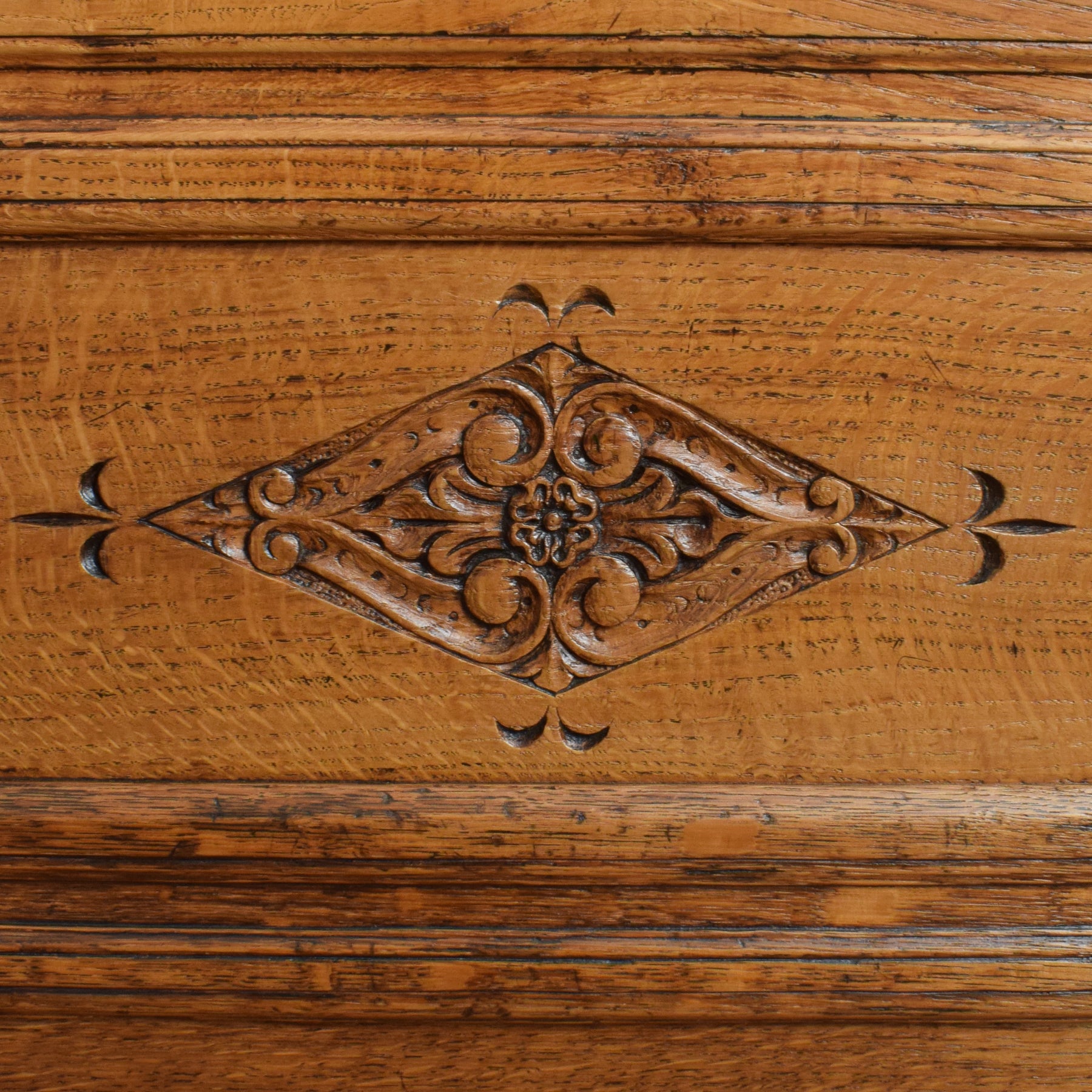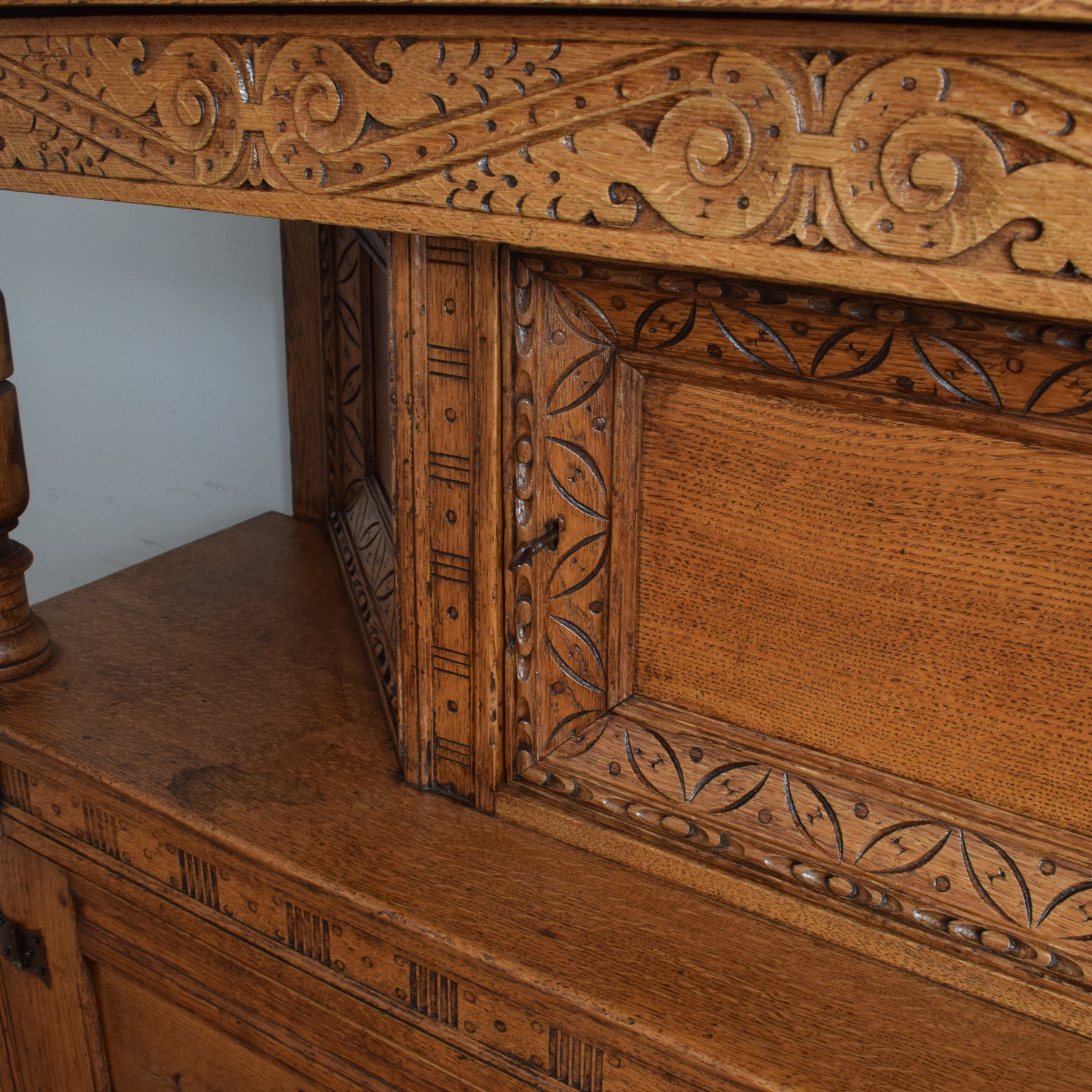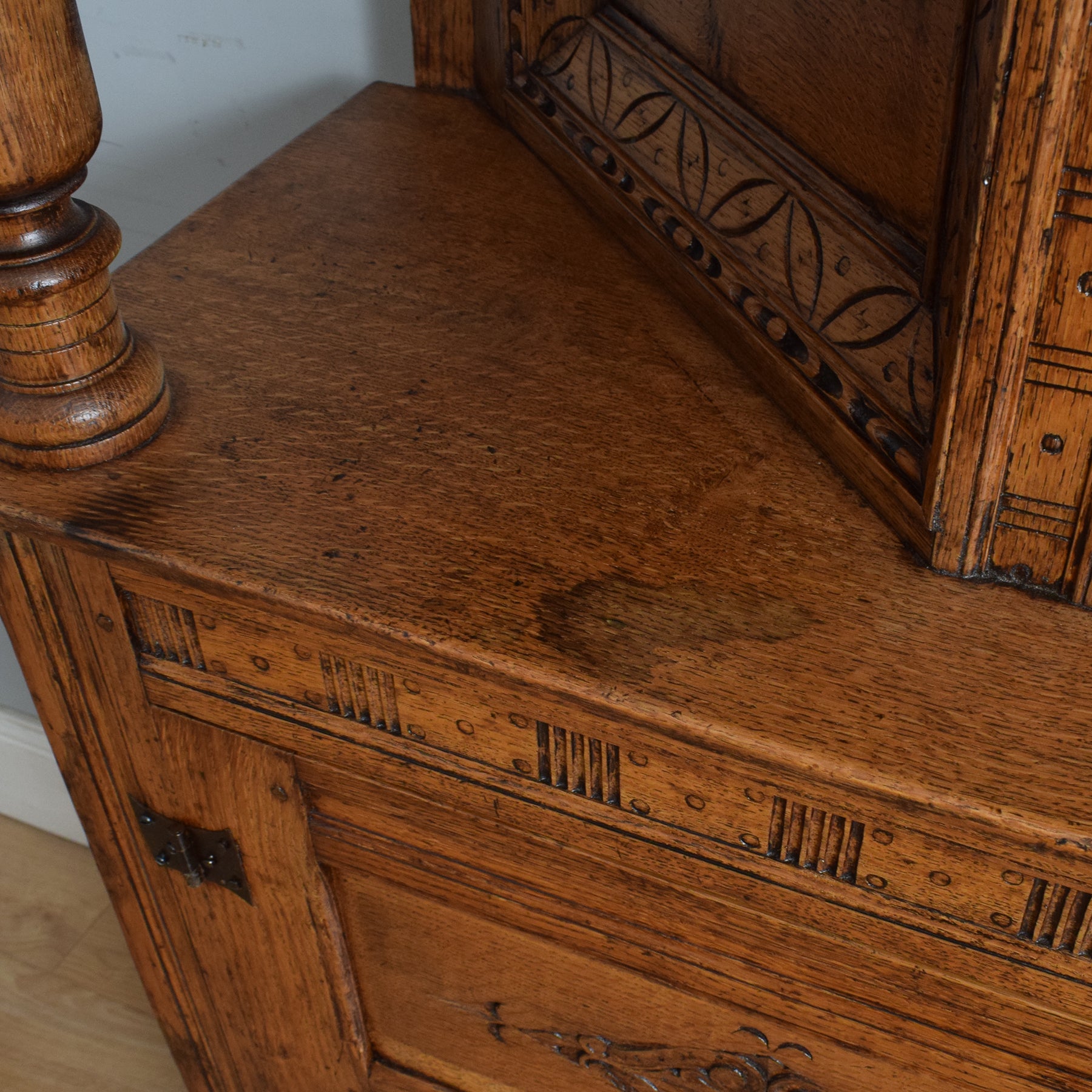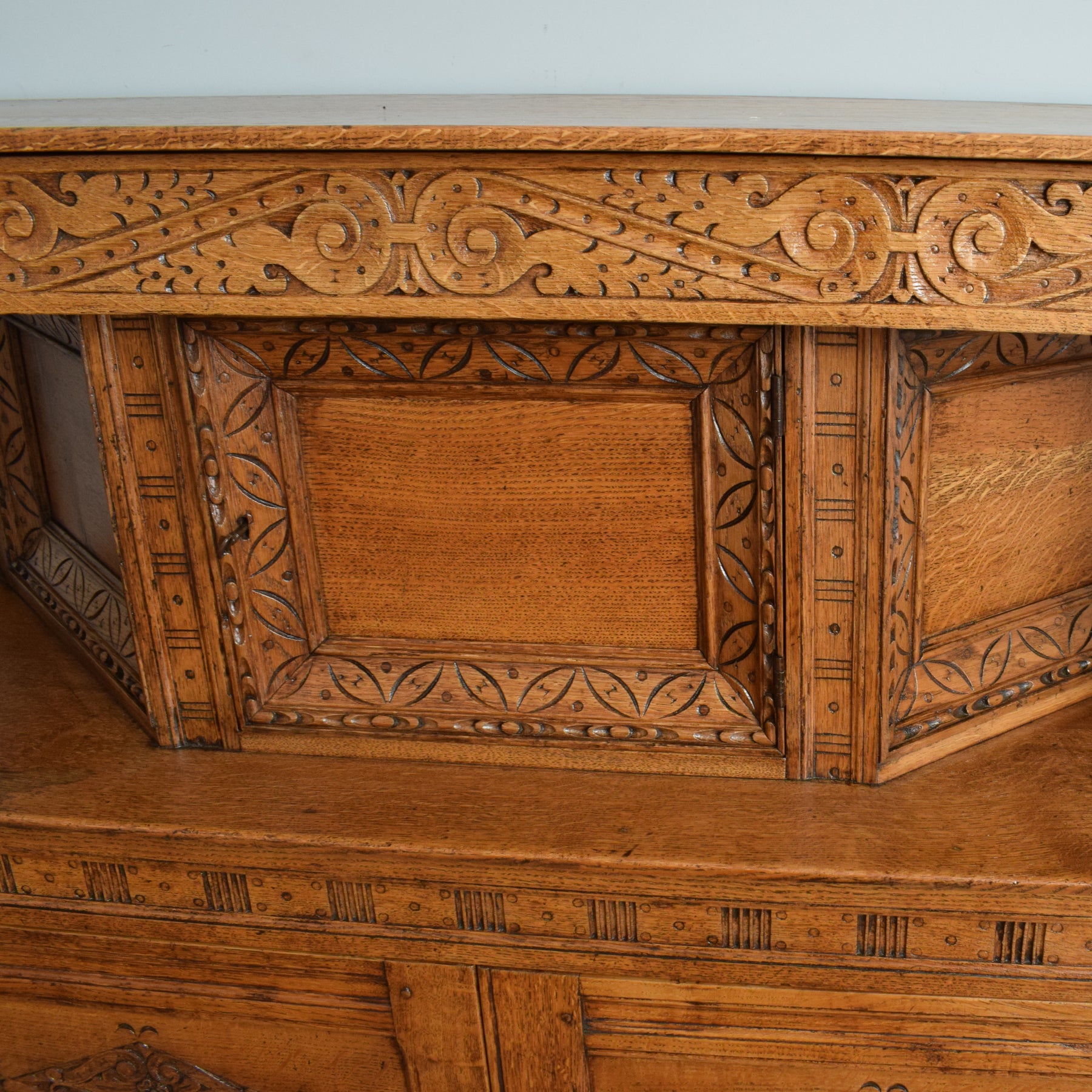 This exquisitely carved oak court cabinet is destined to assume a place of prestige in any household, perfectly suited for gracing a hallway, living room, or dining area.