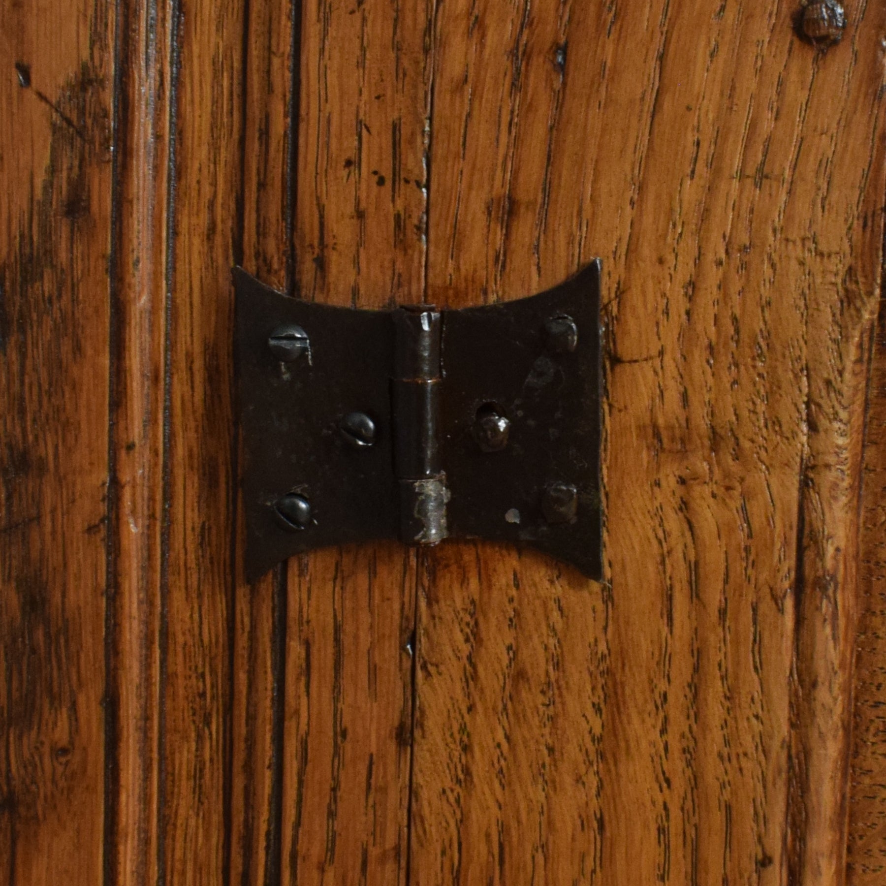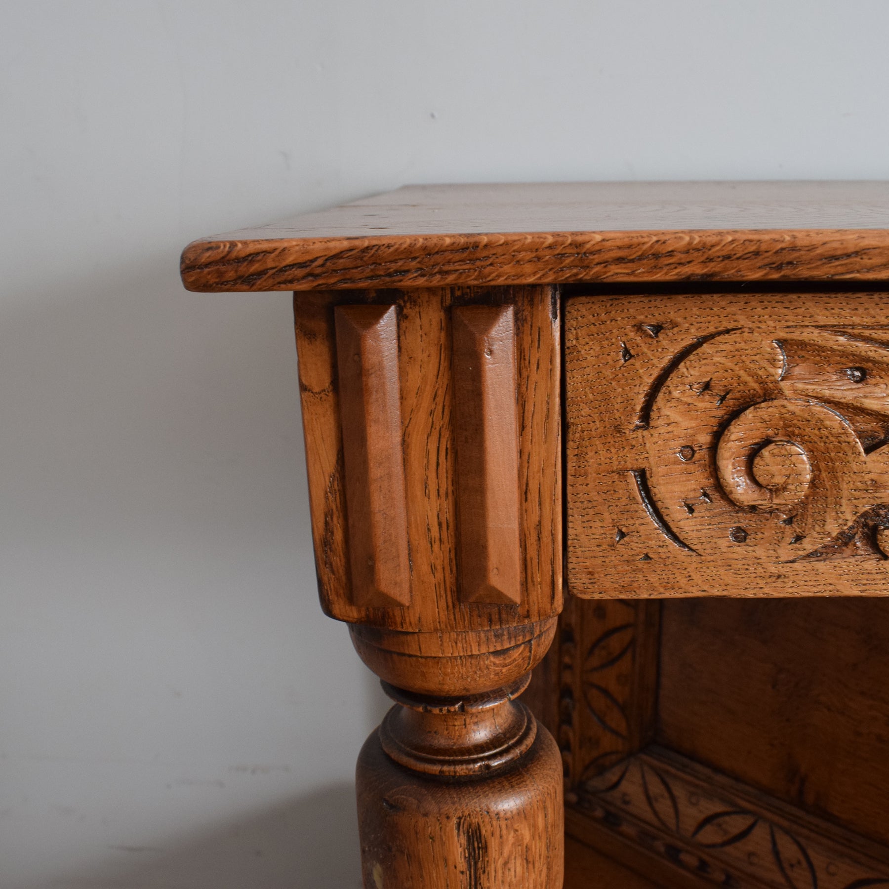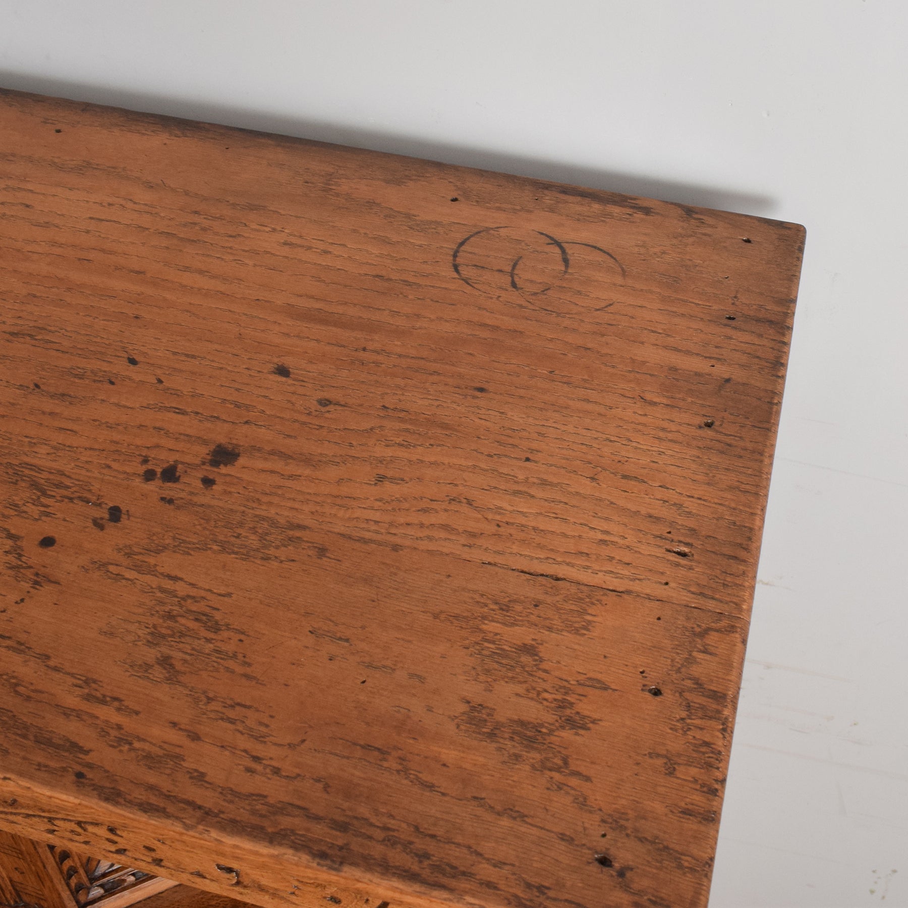 Our restoration efforts for this court cabinet were meticulous, carefully removing the former darker finish to reveal the natural hues of the oak grain. A clear matte lacquer has been applied, ensuring a durable and alluring finish. Crafted entirely from oak, including the plank back and drawer base, this piece exhibits exceptional craftsmanship. Please note there are a few small stains on the top surfaces that could not be removed during the restoration process.
