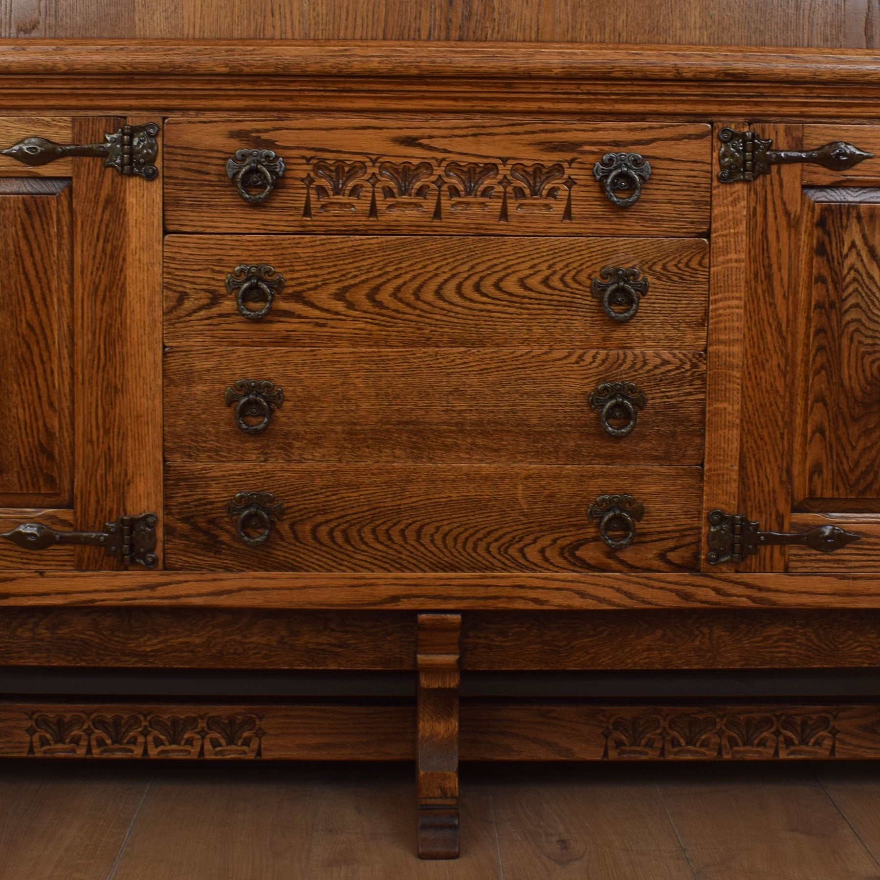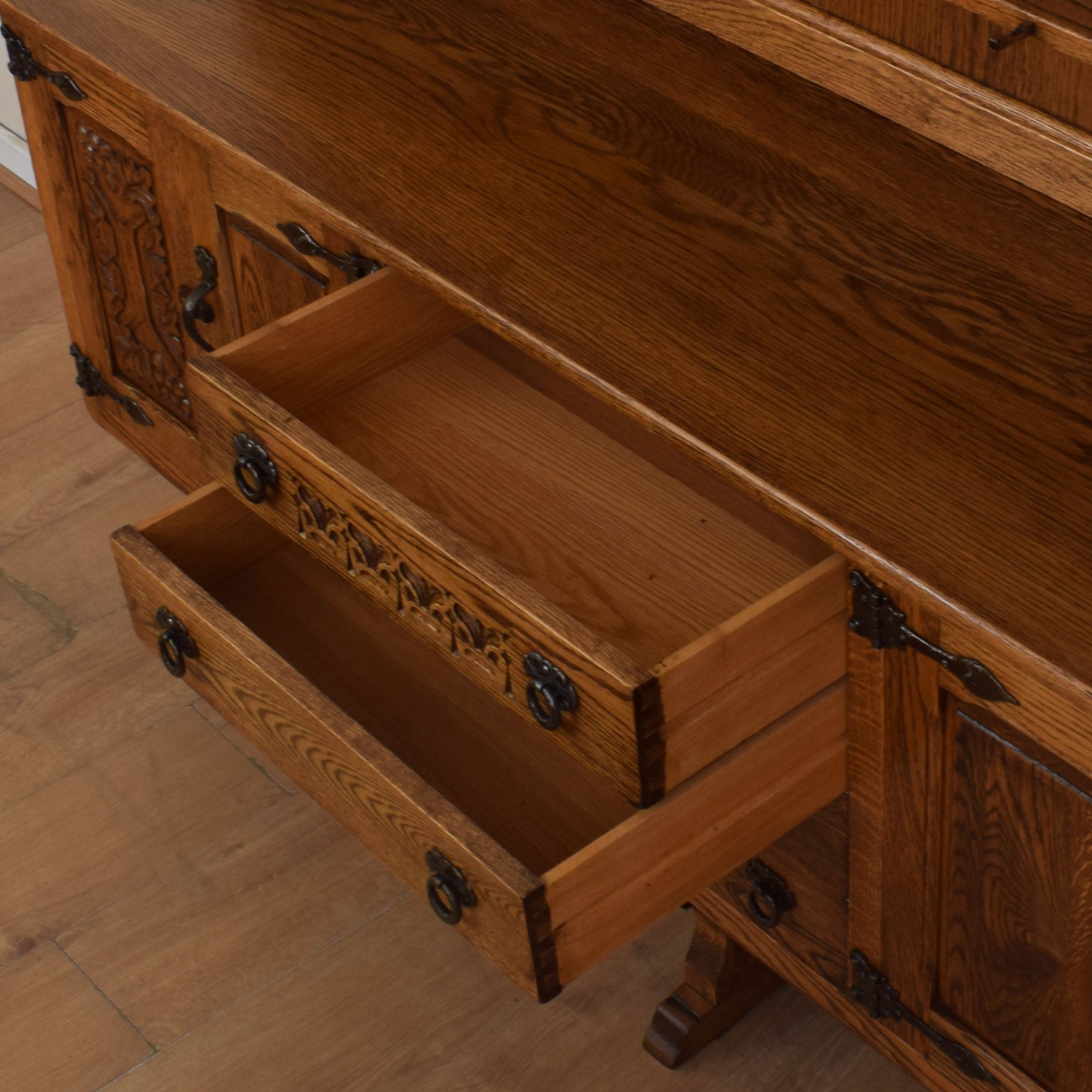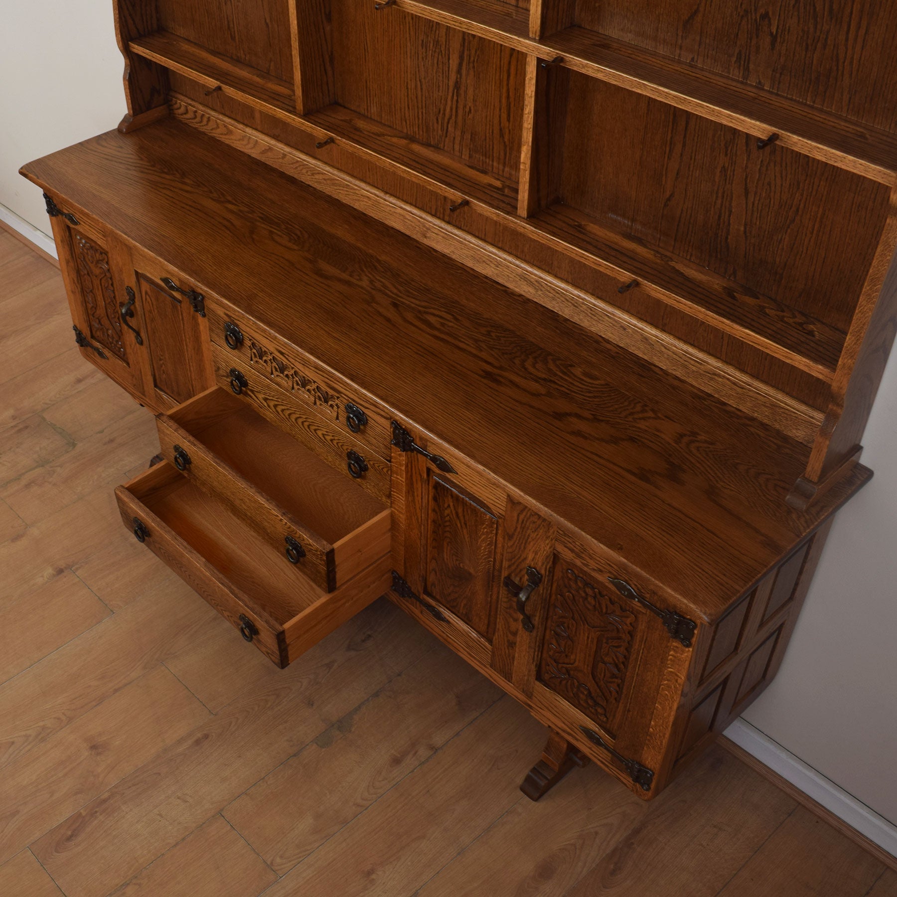 The upper display section comprises two full-width shelves, divided into three sections. Each shelf section includes a groove to support decorative plates, as well as original wooden peg-style hooks for cups, mugs and jugs. The lower unit features a beautifully oak-grained top that has ample space for a fruit bowl, along with treasured ornaments and collectables. Below are four central drawers with a two-door shelved cupboard on each side, offering a generous amount of storage for various items. This quality piece is largely oak with oak-veneered panels and some plywood internal sections.