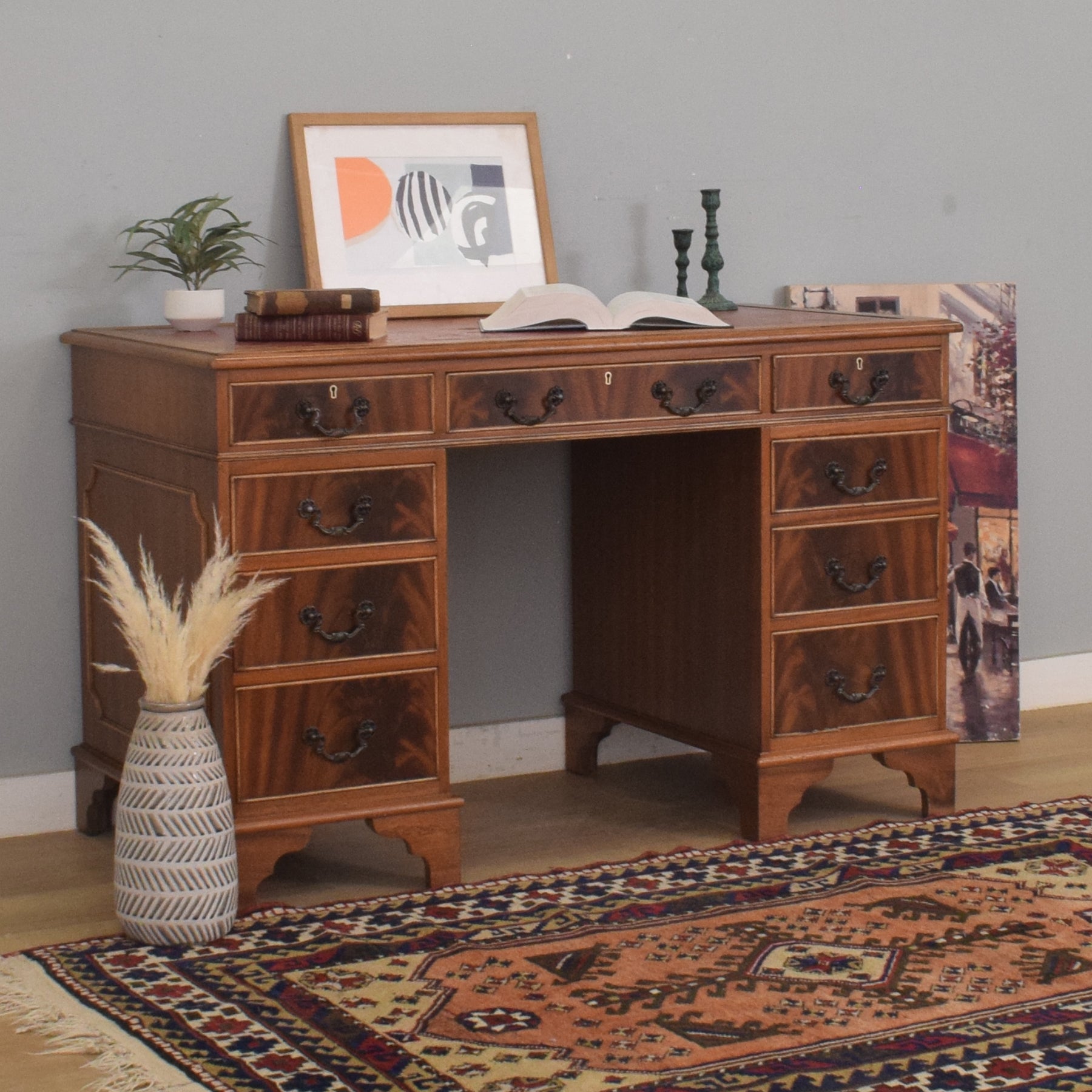 A dedicated workspace can make day-to-day tasks feel more settled, whether it is used for home working, household paperwork, or creative projects. A traditional pedestal desk brings storage and structure to a room, helping keep the surface clear while adding a warm, classic focal point.
