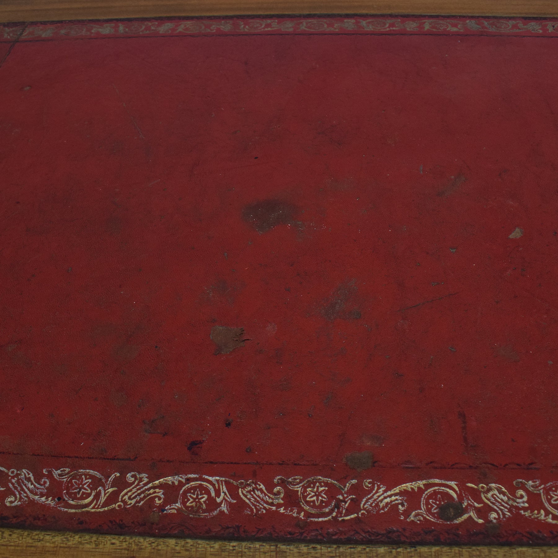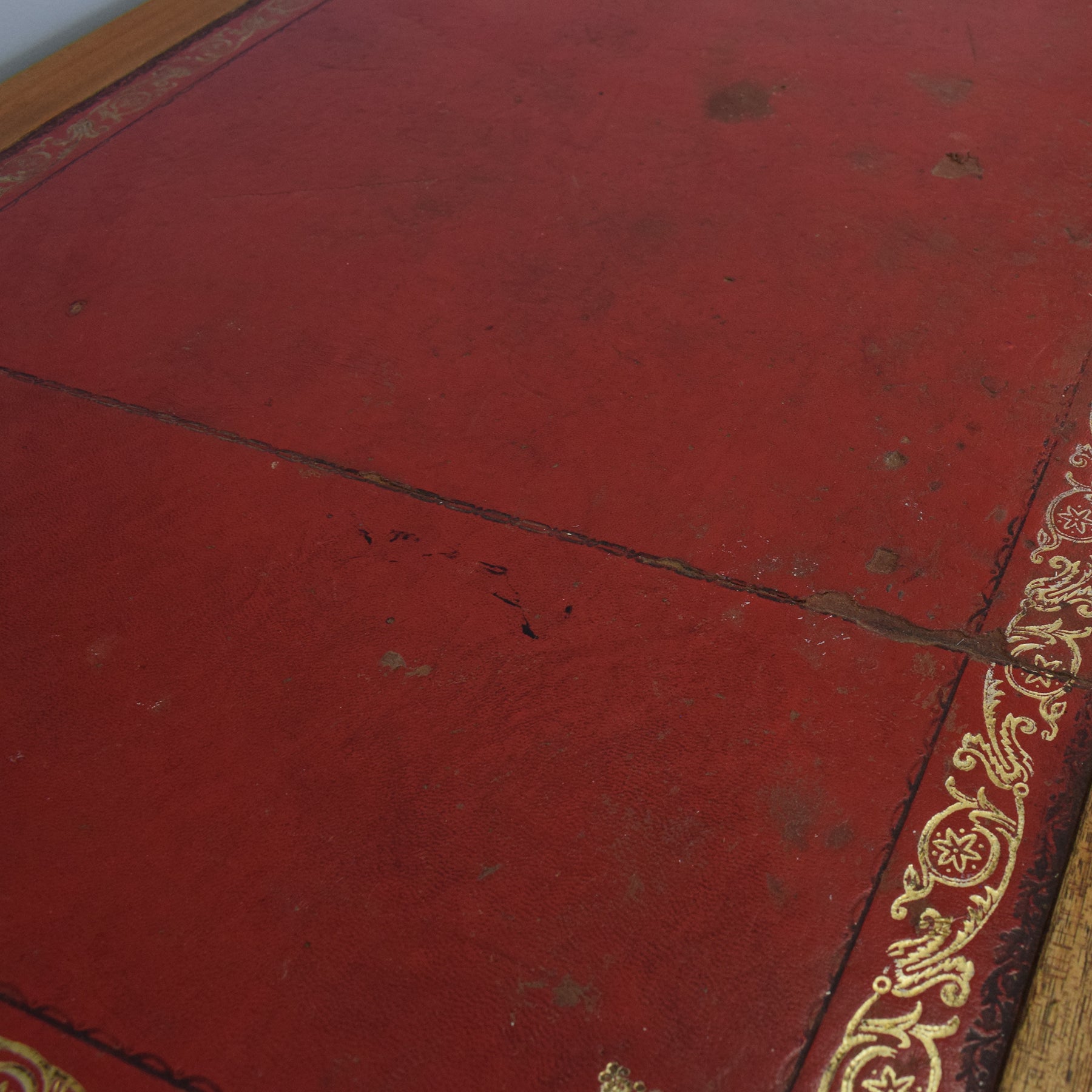 The desk has been stripped back, and then multiple coats of hard-wearing matte lacquer have been applied, providing a durable long-lasting finish while enhancing the character of the veneer and solid sections. The leather top is worn and heavily marked in places, in keeping with age and use, and there is a small section of missing beading from the drawers. This item is made from compressed material with a mahogany veneer, with some sections made from mahogany.
