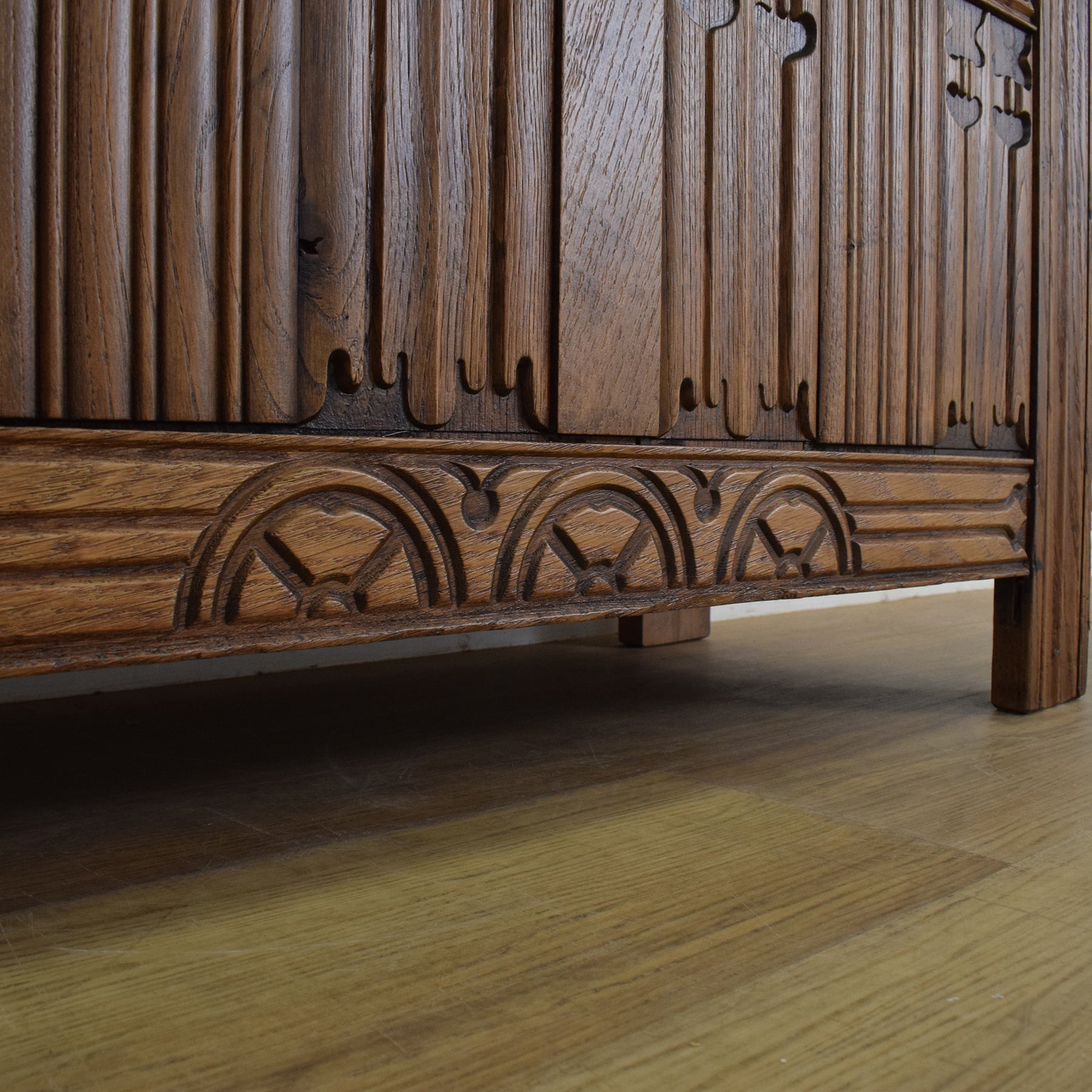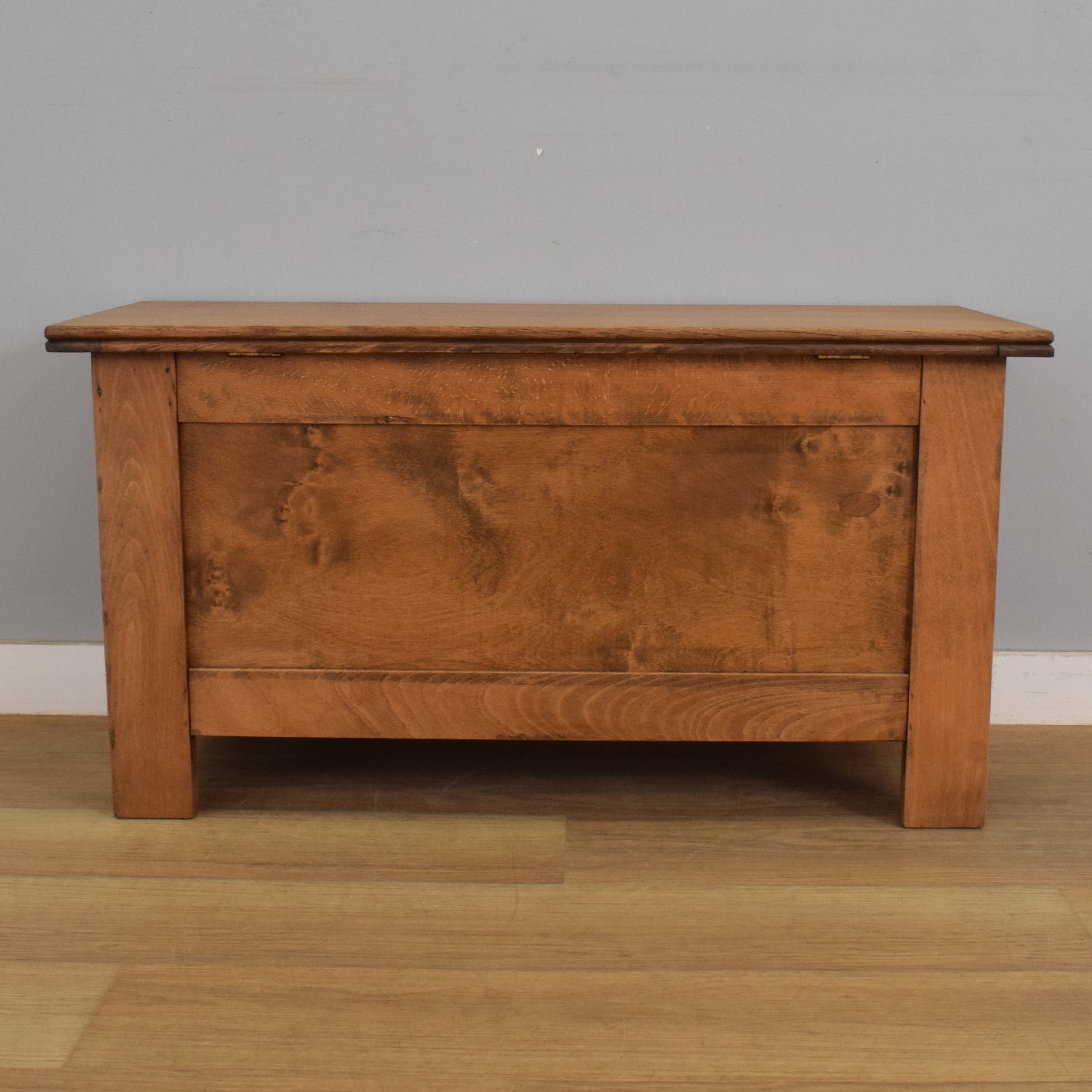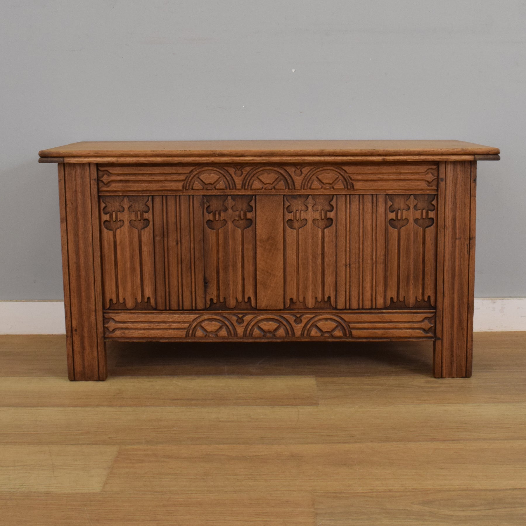 This handsome linenfold-fronted blanket box features classic Gothic-style carvings, with vertical fluted panels and stylised arches along the front, adding texture and interest. The solid, well-proportioned form makes it ideal for placing at the end of a bed or beneath a window, and the hinged lid opens to reveal a generous interior storage space. Clean side panels and a subtly moulded top complete the traditional design, while the warm oak tone makes it easy to pair with a variety of furniture styles.
