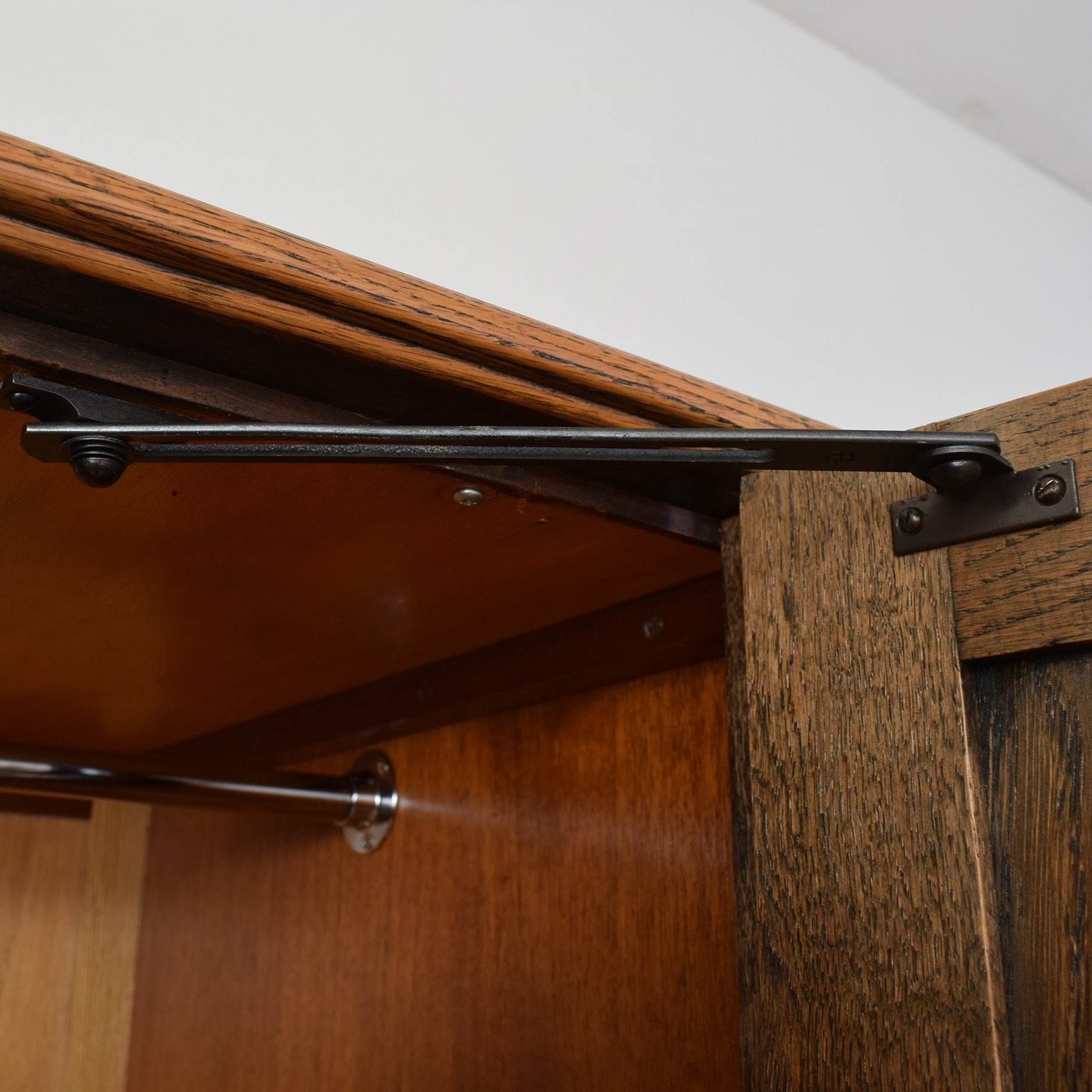 The previous finish has been fully stripped back, and the wardrobe has been carefully sanded before multiple coats of hard-wearing matte lacquer were applied. This provides a durable, long-lasting finish while allowing the character of the oak to show through. There is a small area of missing veneer, which is visible in the accompanying photographs and has been reflected in the pricing. The wardrobe is made using a mixture of solid oak and oak veneer panels. The rear panel is made from plywood.