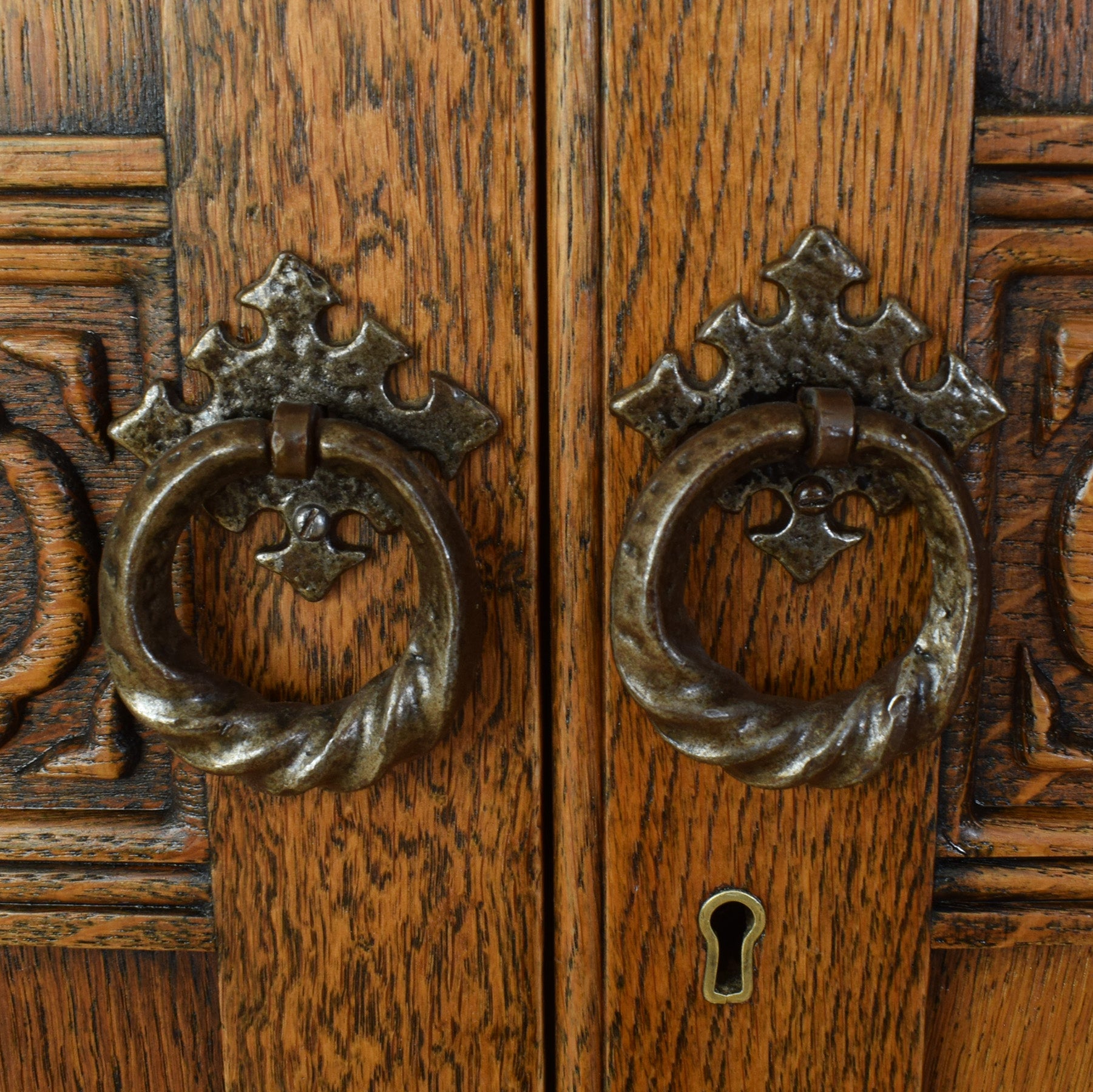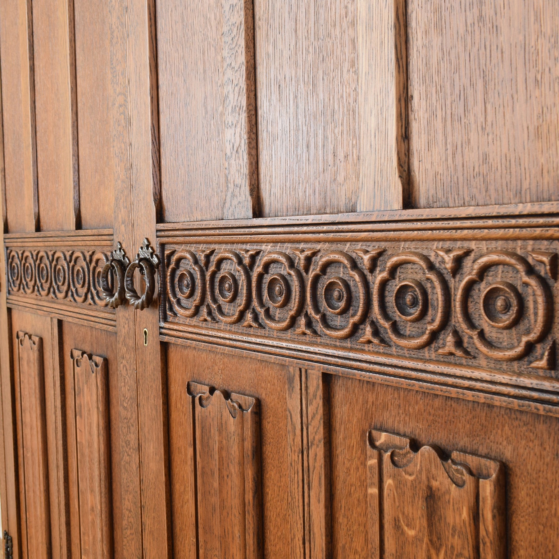 The wardrobe features classic linenfold panelled doors, detailed with carved decoration across the centre rail and traditional metal hinges. The proportions are solid and well balanced, offering practical storage behind its double doors while showcasing the texture and variation of the oak grain. The overall look is timeless, with decorative interest that remains restrained rather than ornate.