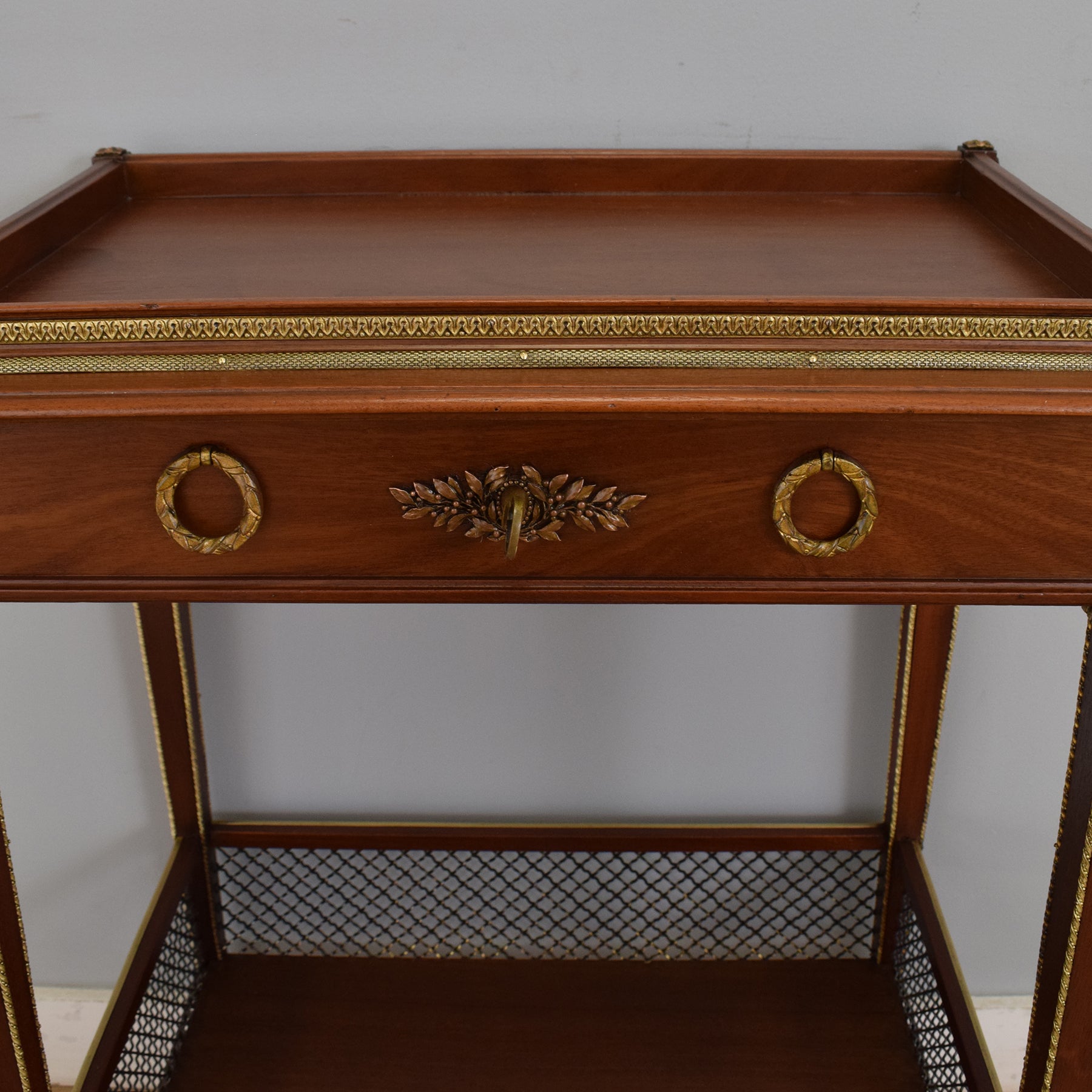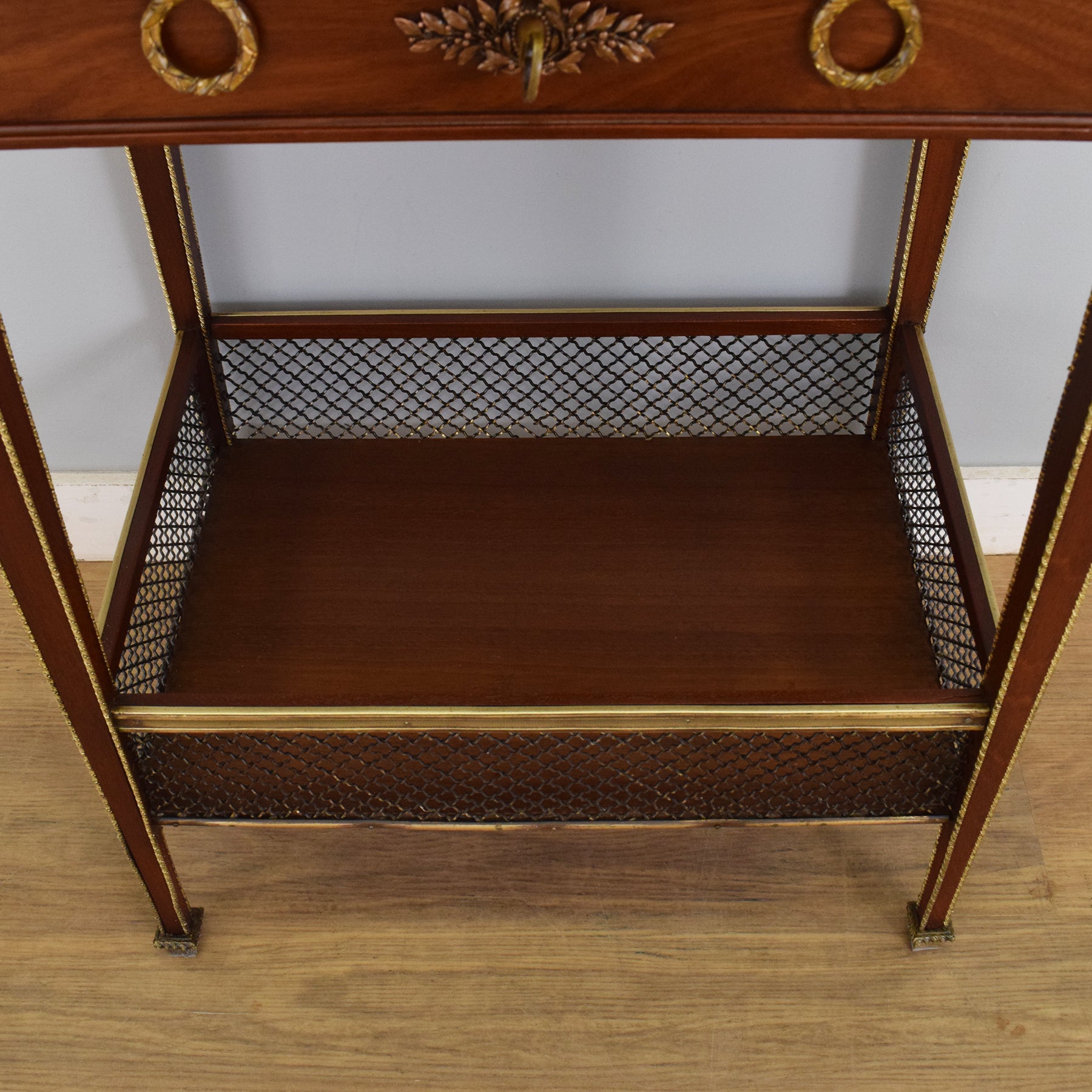 This table features a single drawer front adorned with ornate gilt brass wreath ring pulls and a central foliate escutcheon, all framed by finely cast floral appliqués to each corner. A brass gallery runs along the raised top edge, adding both definition and a nod to neoclassical styling. The tapering legs are trimmed with decorative brass moulding and lead down to a lower shelf enclosed in pierced brass gallery work, ideal for storing items while adding visual balance to the piece.