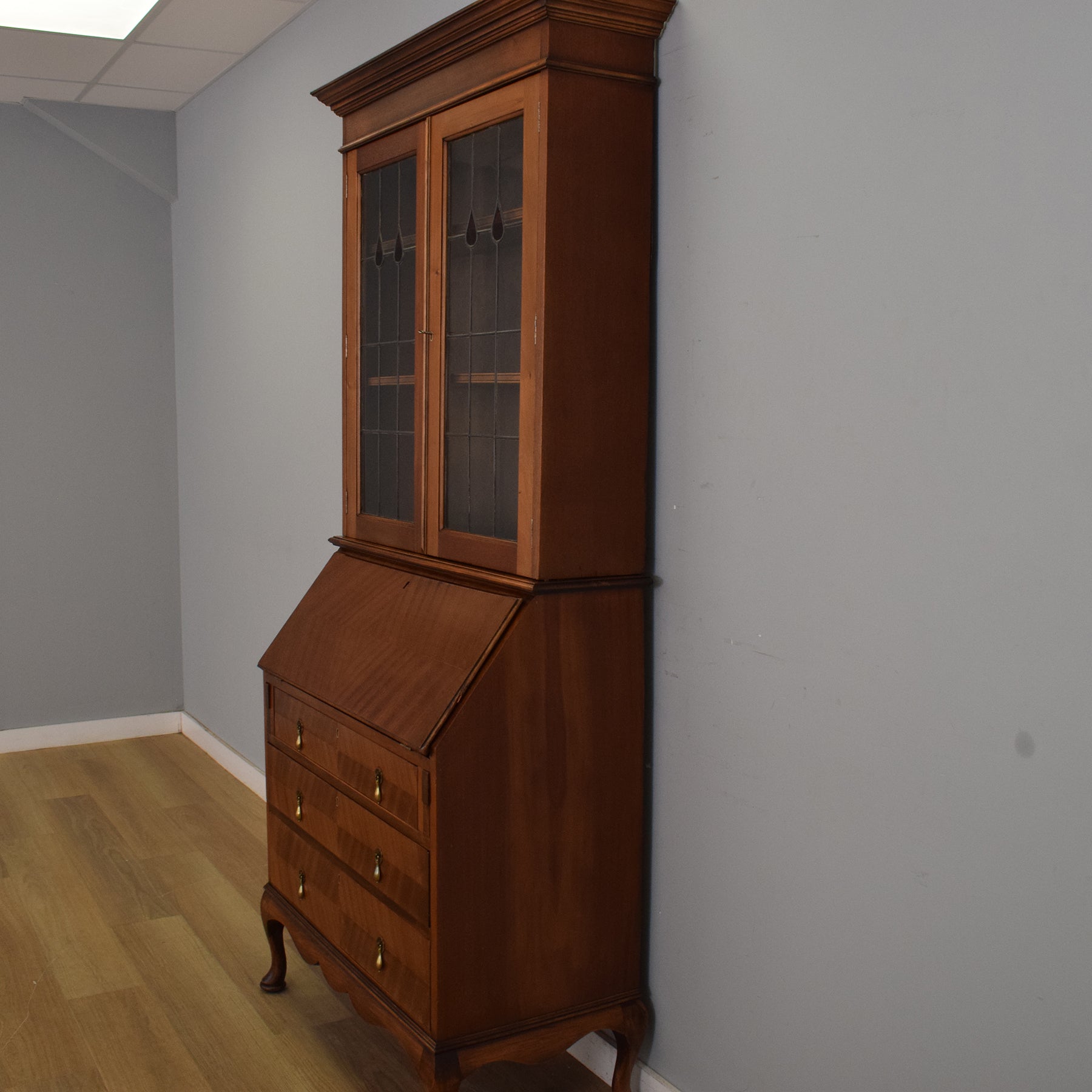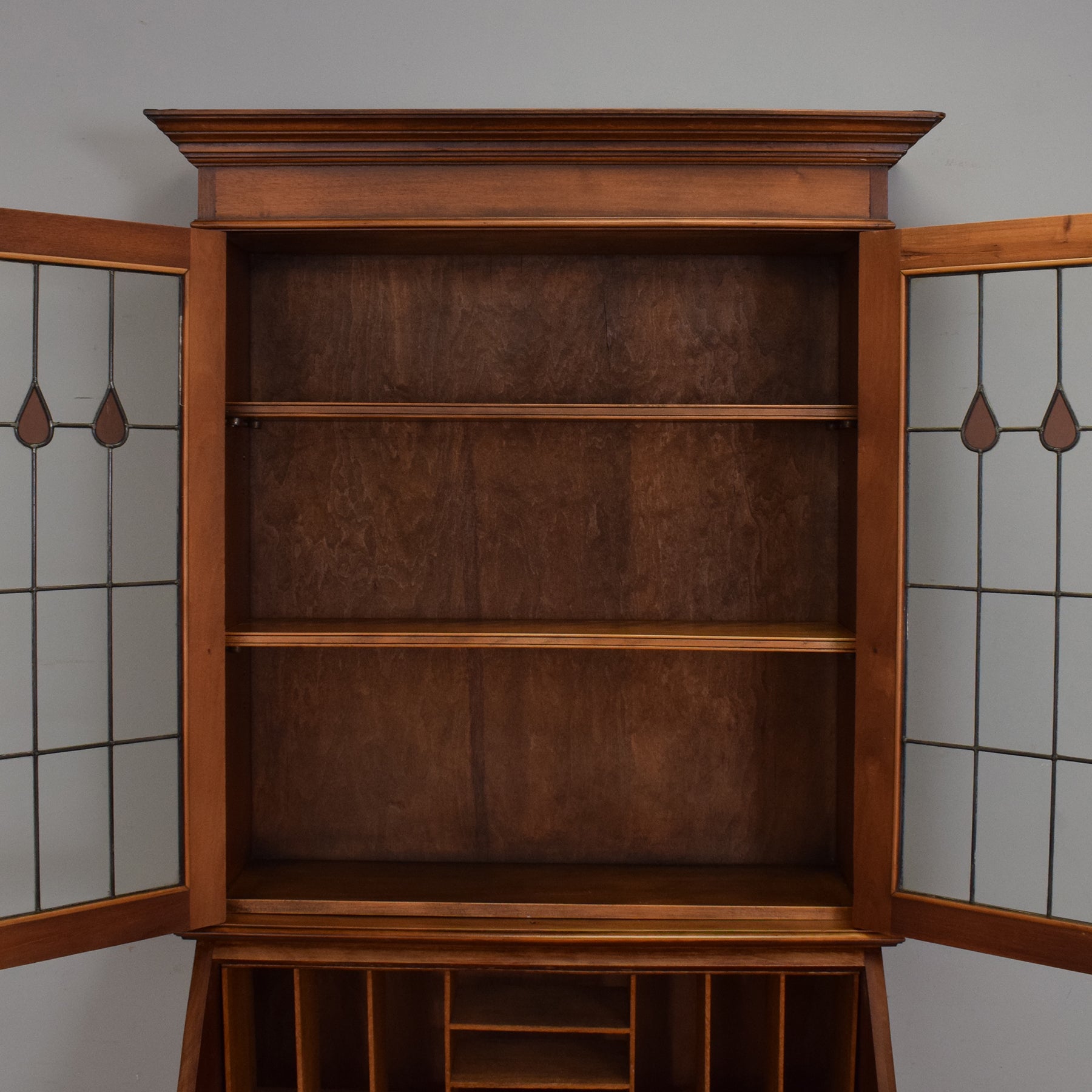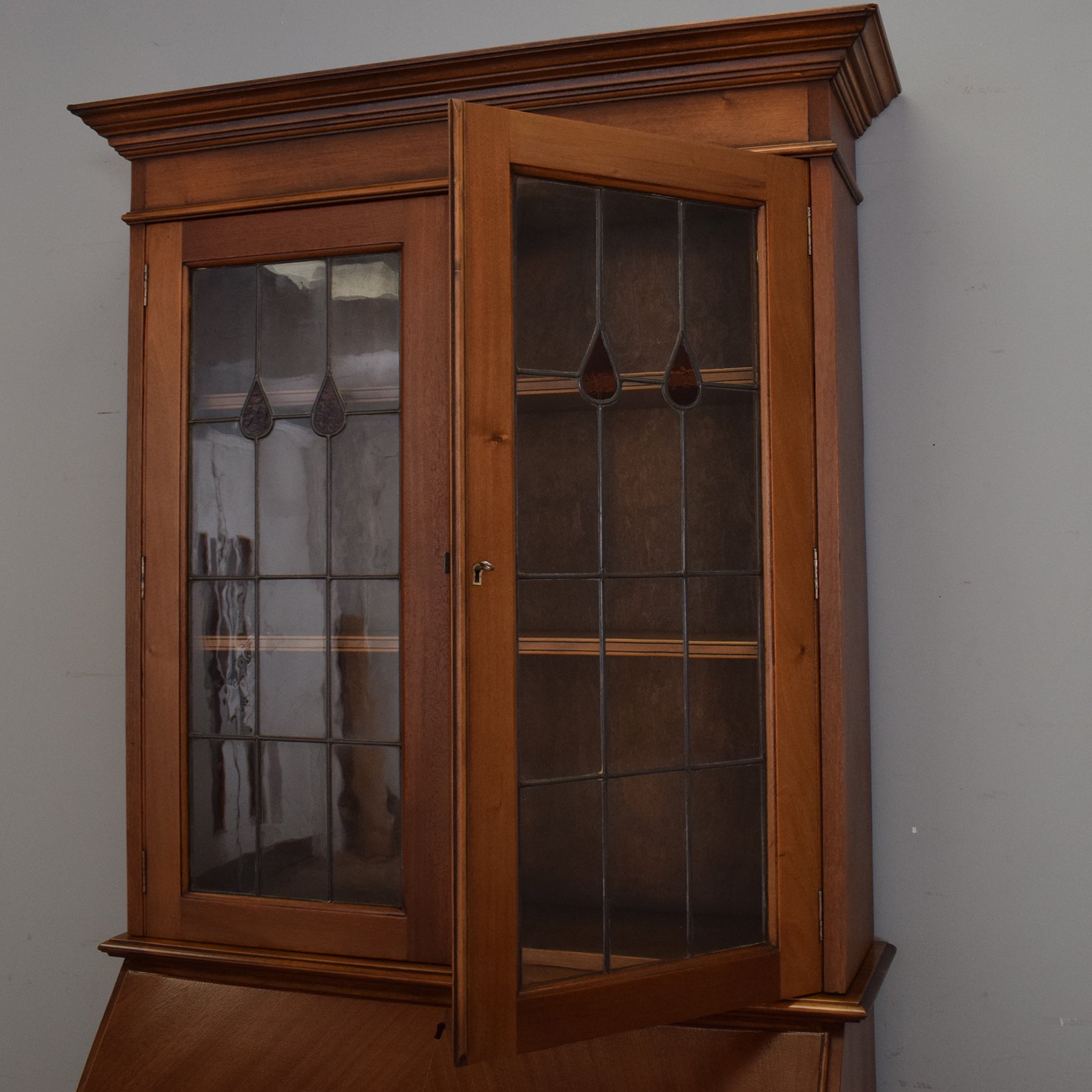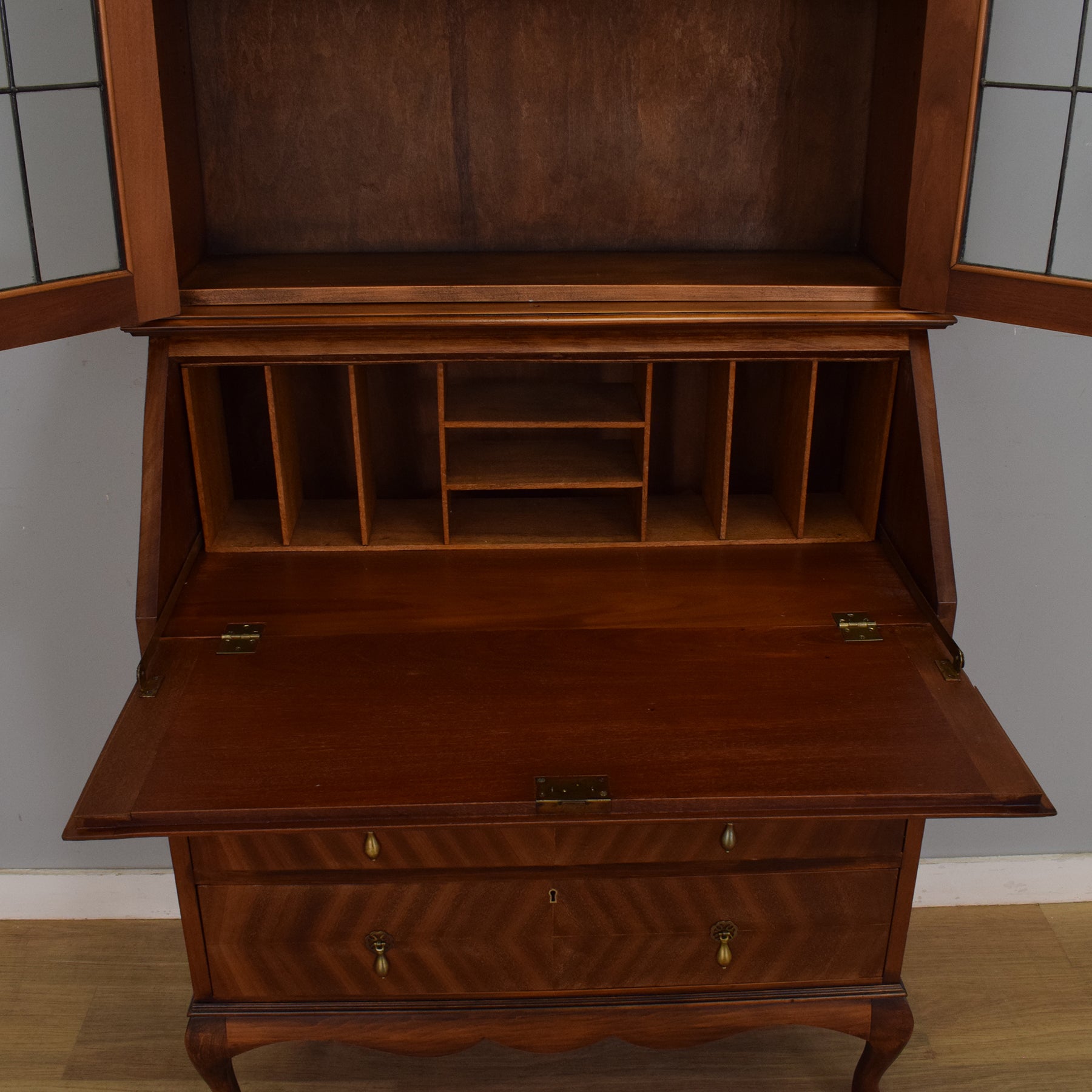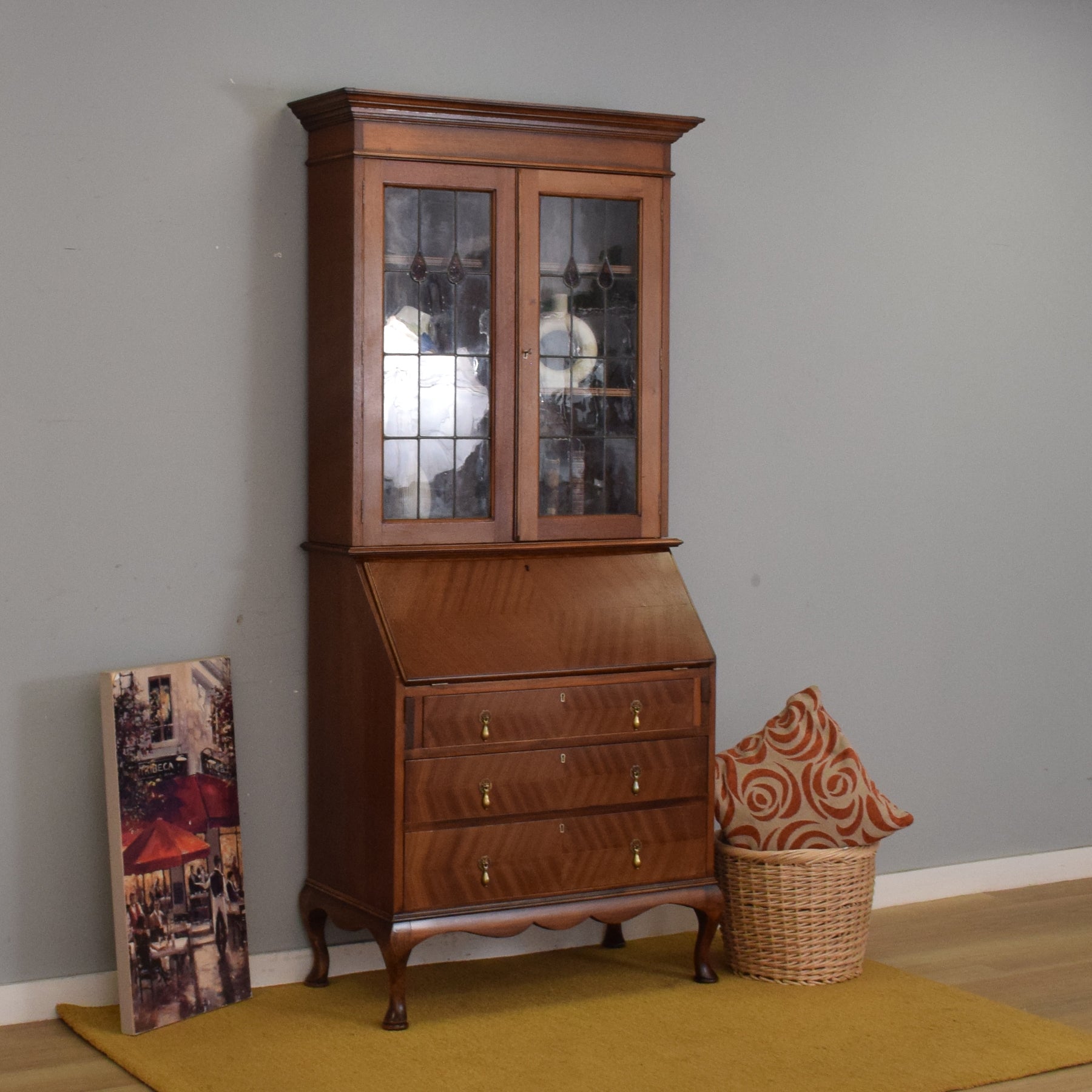 The upper section features two glazed doors with leaded glass and teardrop detailing, opening to reveal two shelves – ideal for displaying books or treasured objects. Below, the sloping bureau front drops down to create a practical writing surface, with a well-organised interior of pigeonholes and small compartments. Three spacious drawers beneath provide additional storage, all set on cabriole legs and a shaped apron that gives the piece a light, classic presence. Brass drop handles and escutcheons complete the look, reinforcing the refined aesthetic.