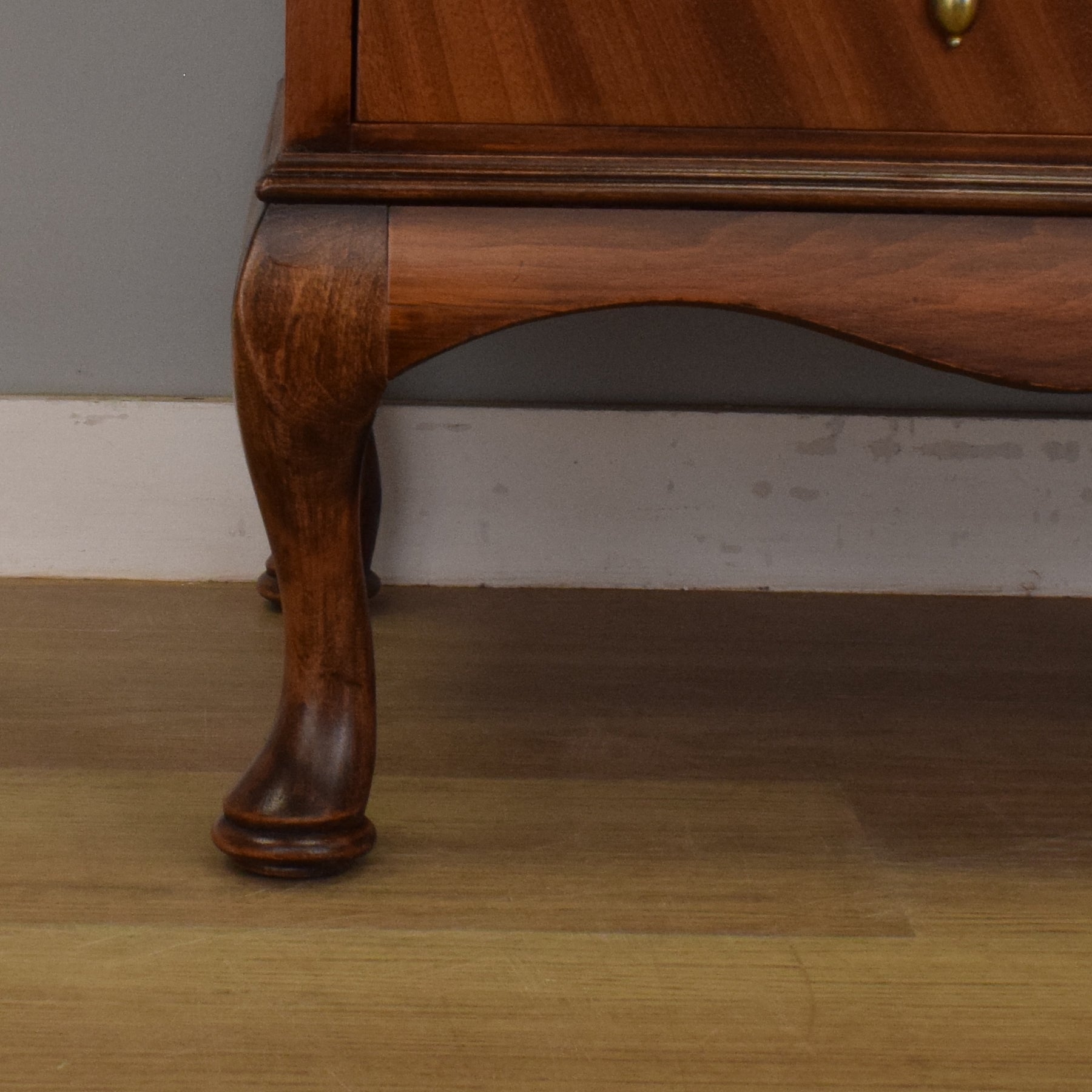 The previous finish has been stripped and multiple coats of hard-wearing matte lacquer have been applied, giving the surface a long-lasting, low-sheen finish while highlighting the depth and pattern of the mahogany grain. This item is made from a combination of solid mahogany and mahogany veneer. The back and drawer bases are constructed from plywood.