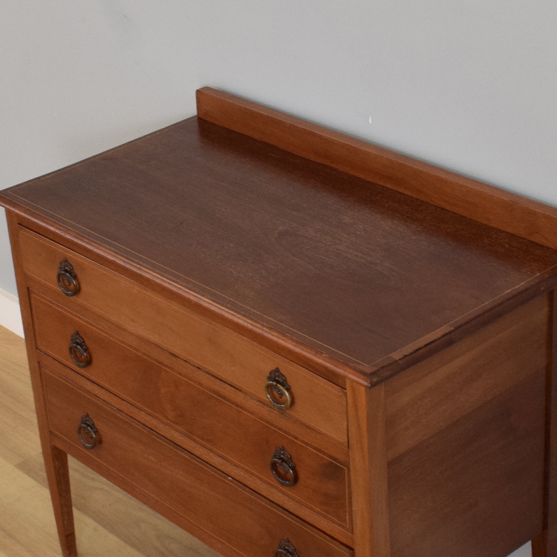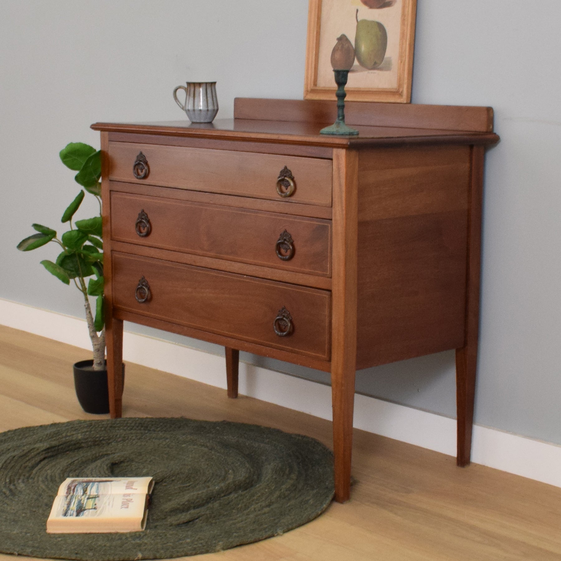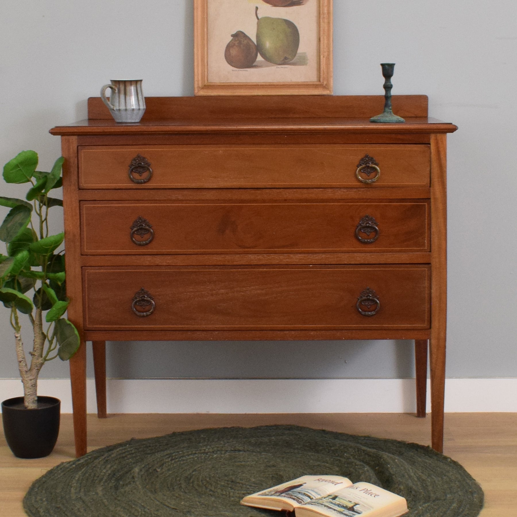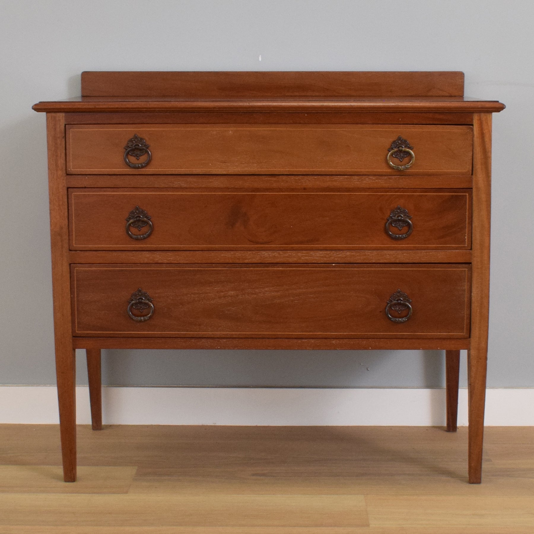 This chest has three drawers and is ideal for keeping essentials organised and within reach. The drawers are adorned with ring handles that add a touch of vintage charm. The chest's slender tapered legs and subtle inlay detail along the top edge contribute to its graceful, timeless design.