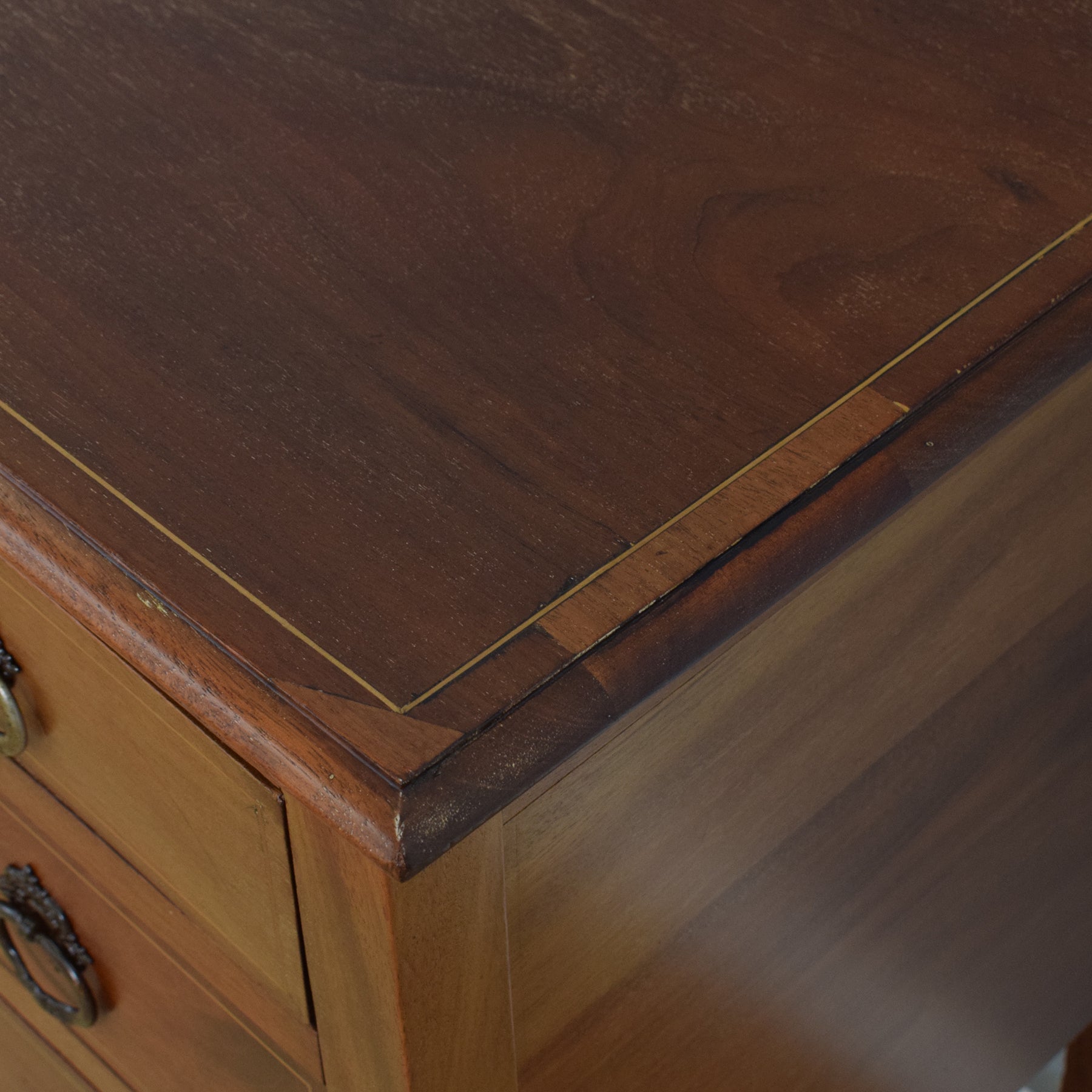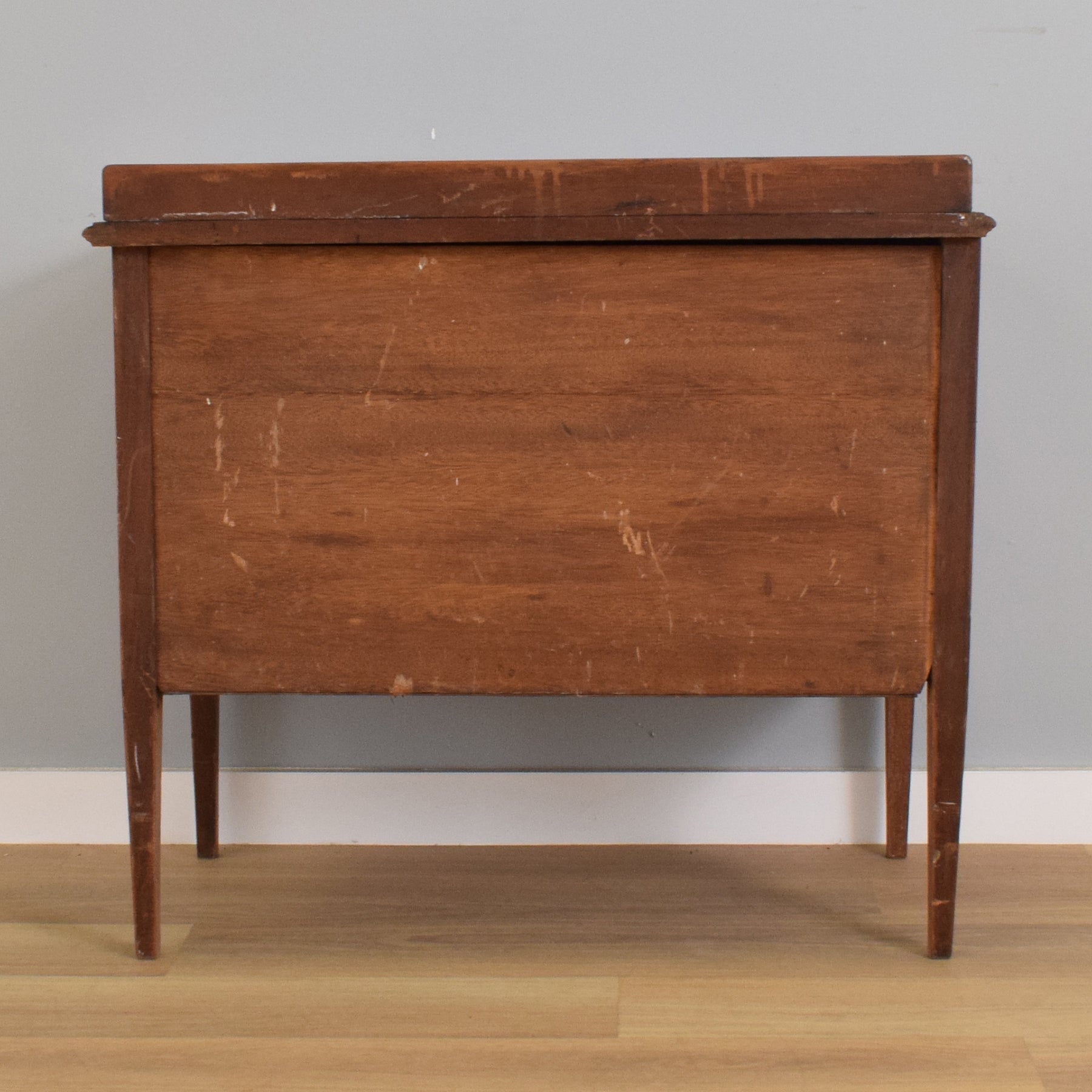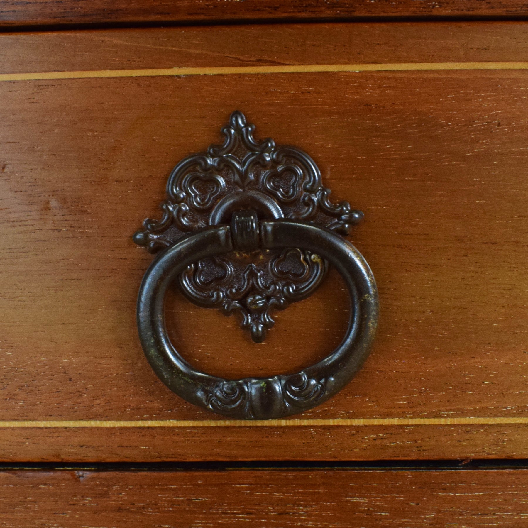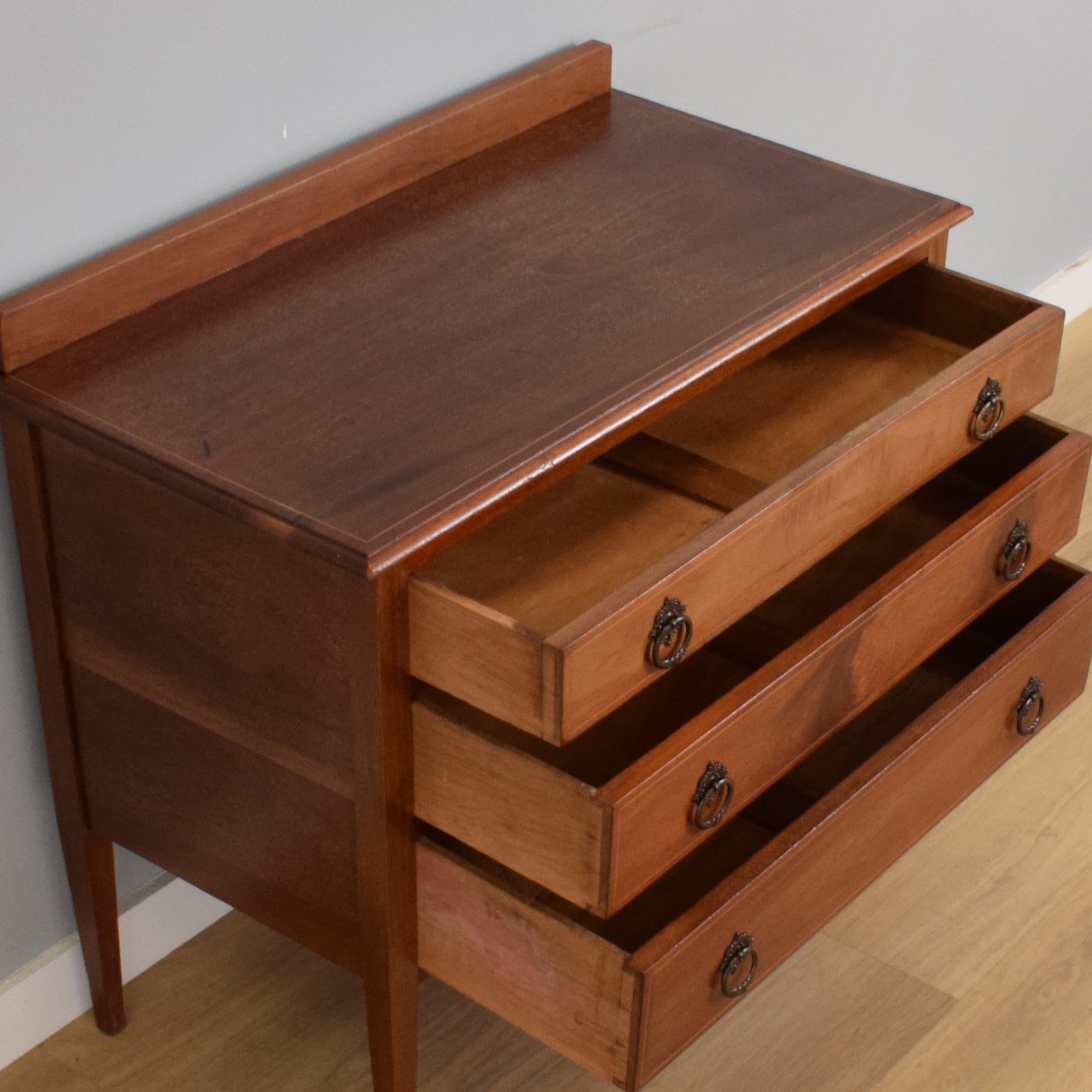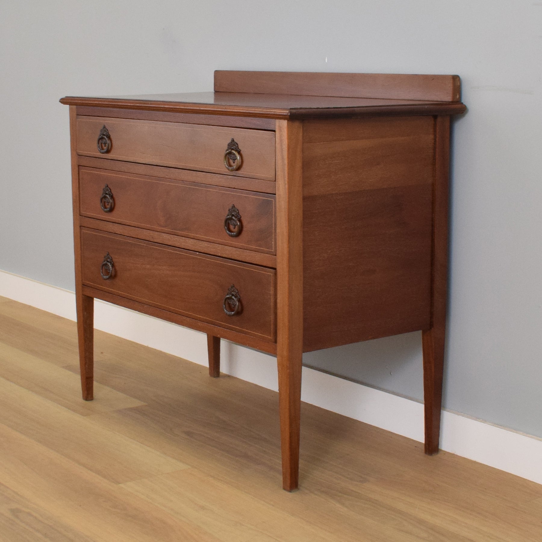 This chest has three drawers and is ideal for keeping essentials organised and within reach. The drawers are adorned with ring handles that add a touch of vintage charm. The chest's slender tapered legs and subtle inlay detail along the top edge contribute to its graceful, timeless design.