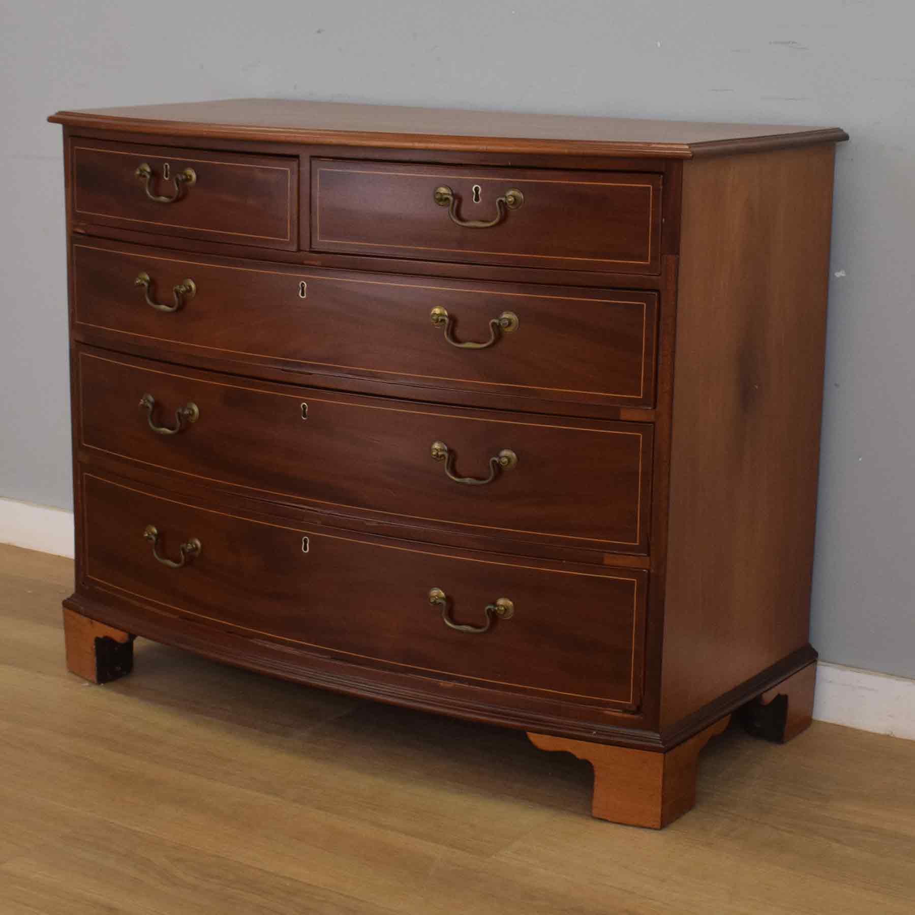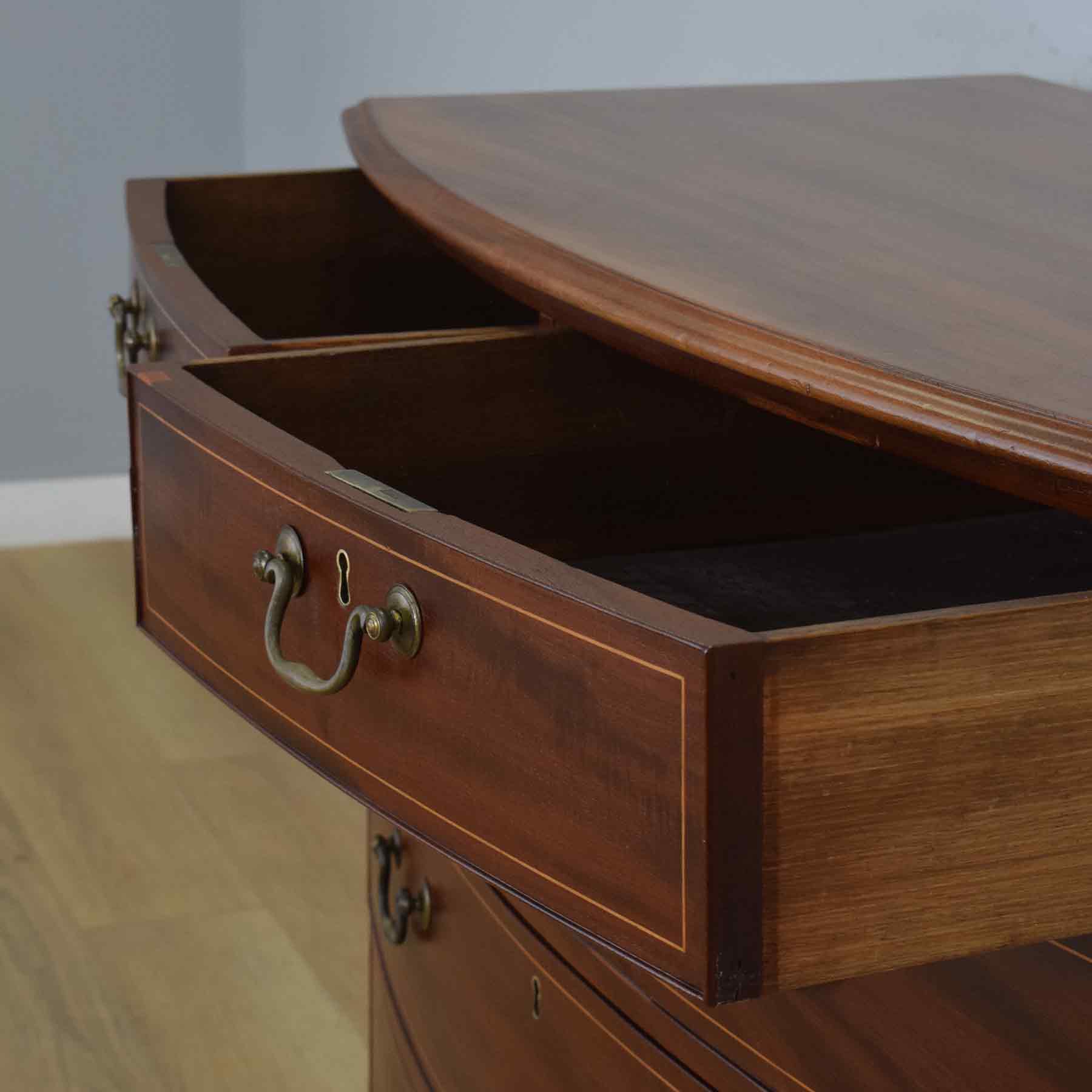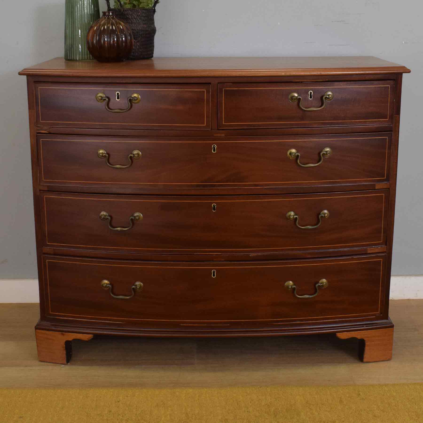 This mahogany chest of drawers has a pleasing serpentine front, with two short drawers over three long graduating drawers, giving it both visual interest and useful everyday storage. The rich mahogany tones, fine inlaid stringing, and brass swan-neck handles add to its traditional character, while the bracket feet and shaped front give the piece a well-proportioned and established look. The wide top also provides a useful surface for a lamp, mirror, or decorative items.