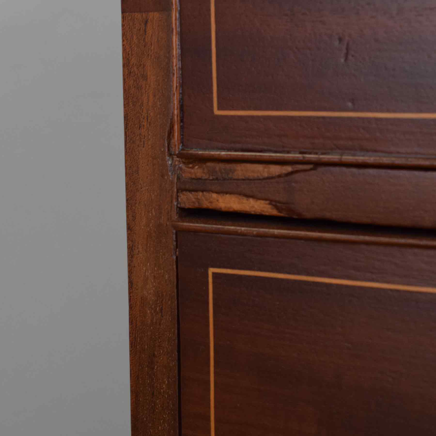 The previous finish has been stripped, and then multiple coats of hard-wearing lacquer have been applied, providing a durable long-lasting finish while also enhancing the natural depth and colour of the mahogany. There are many areas of missing veneer, as shown in the photographs, and these should be noted as part of the item’s condition. This item is made from a mixture of mahogany and mahogany veneer. The back and drawer bases are made from pine.
