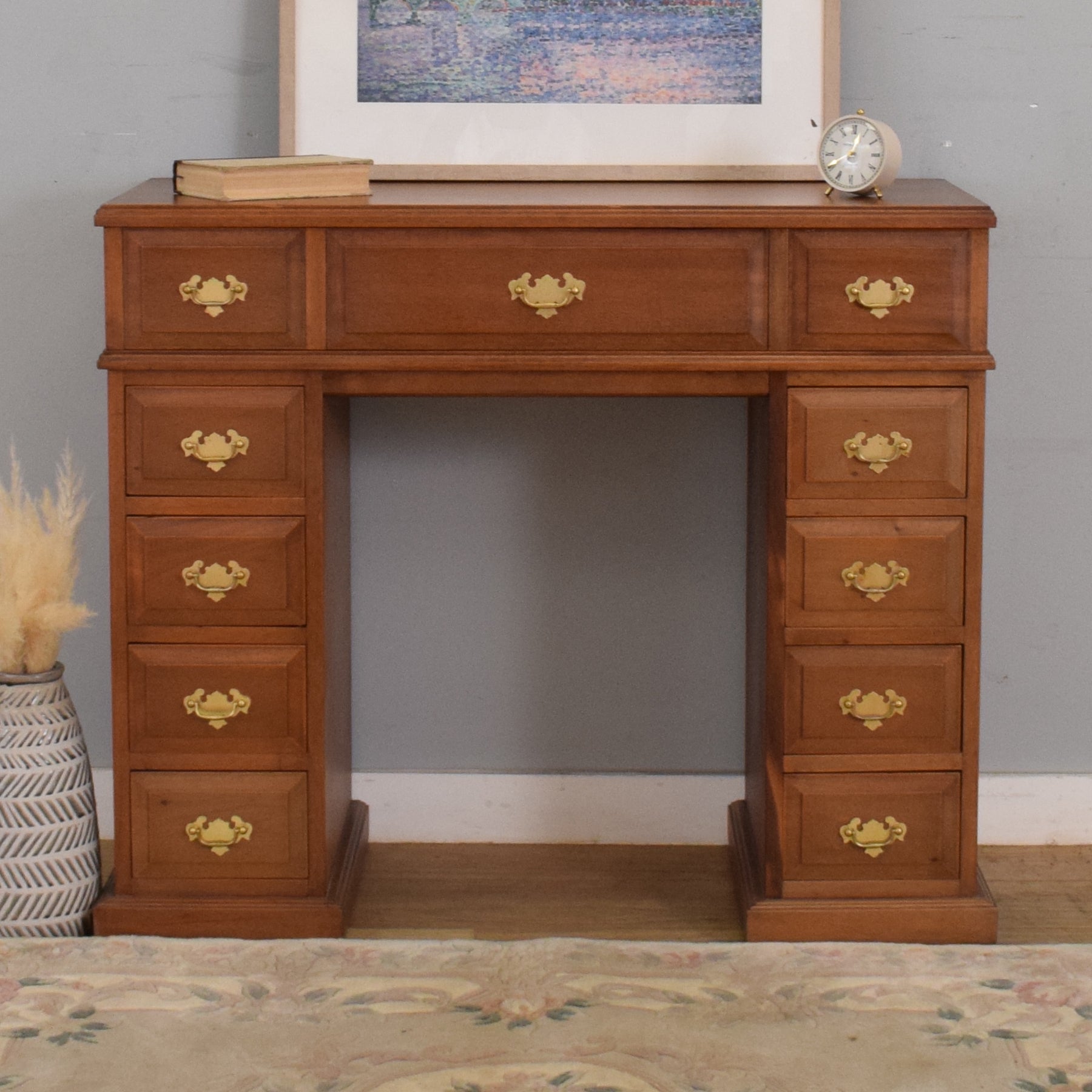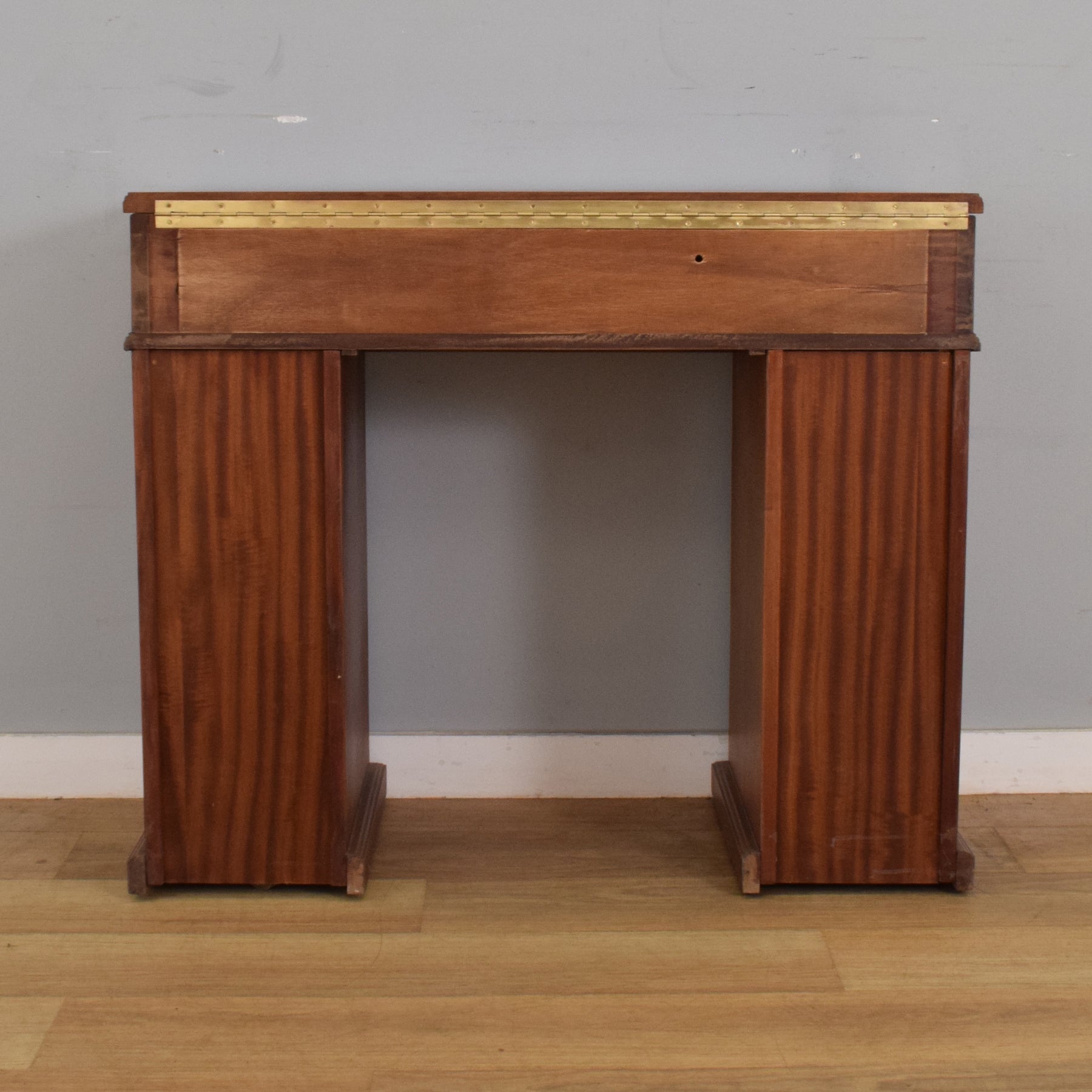 The desk features a central kneehole flanked by two pedestals, each fitted with four small drawers, while the upper section includes a wide central compartment beneath a lift-up top. This hinged top was originally intended to conceal a keyboard or music equipment, but now offers a discreet and spacious storage solution—perfect for stationery, documents, or personal items. The clean lines, panelled drawer fronts, and classic brass handles lend the piece a refined, balanced appearance.