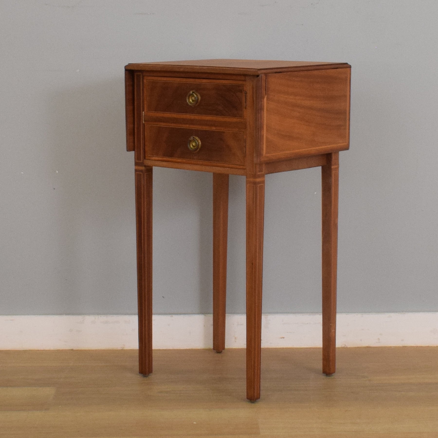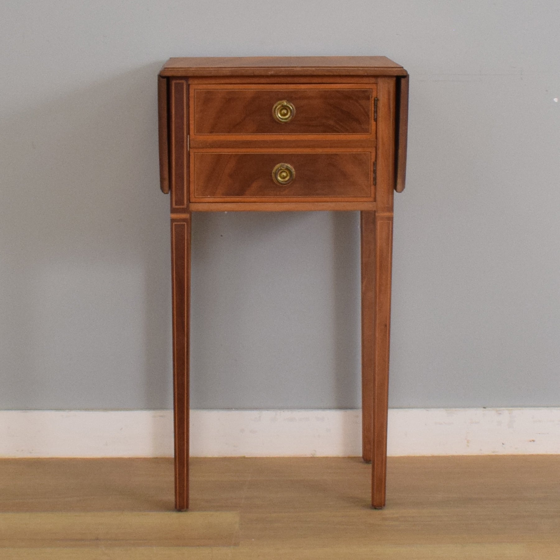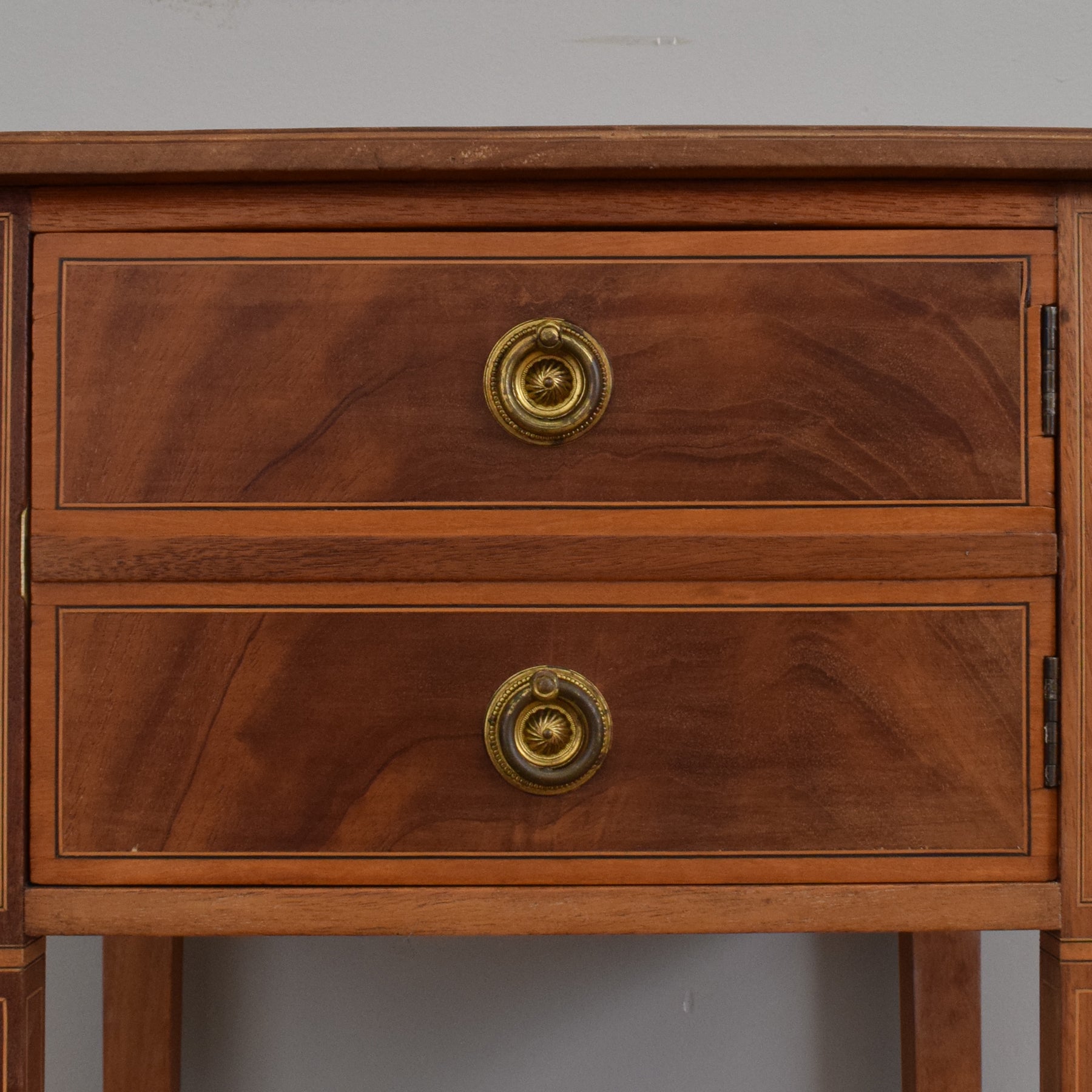 This is a slender drop-leaf cabinet crafted entirely from solid mahogany. The piece features two faux drawer fronts with traditional brass ring pulls, concealing a cupboard storage compartment. The drop leaves are supported by well-shaped wooden brackets and add both function and visual interest when extended. Decorative inlay detailing frames the drawers, legs, and top surface, highlighting the craftsmanship and offering a refined contrast to the rich tone of the wood.