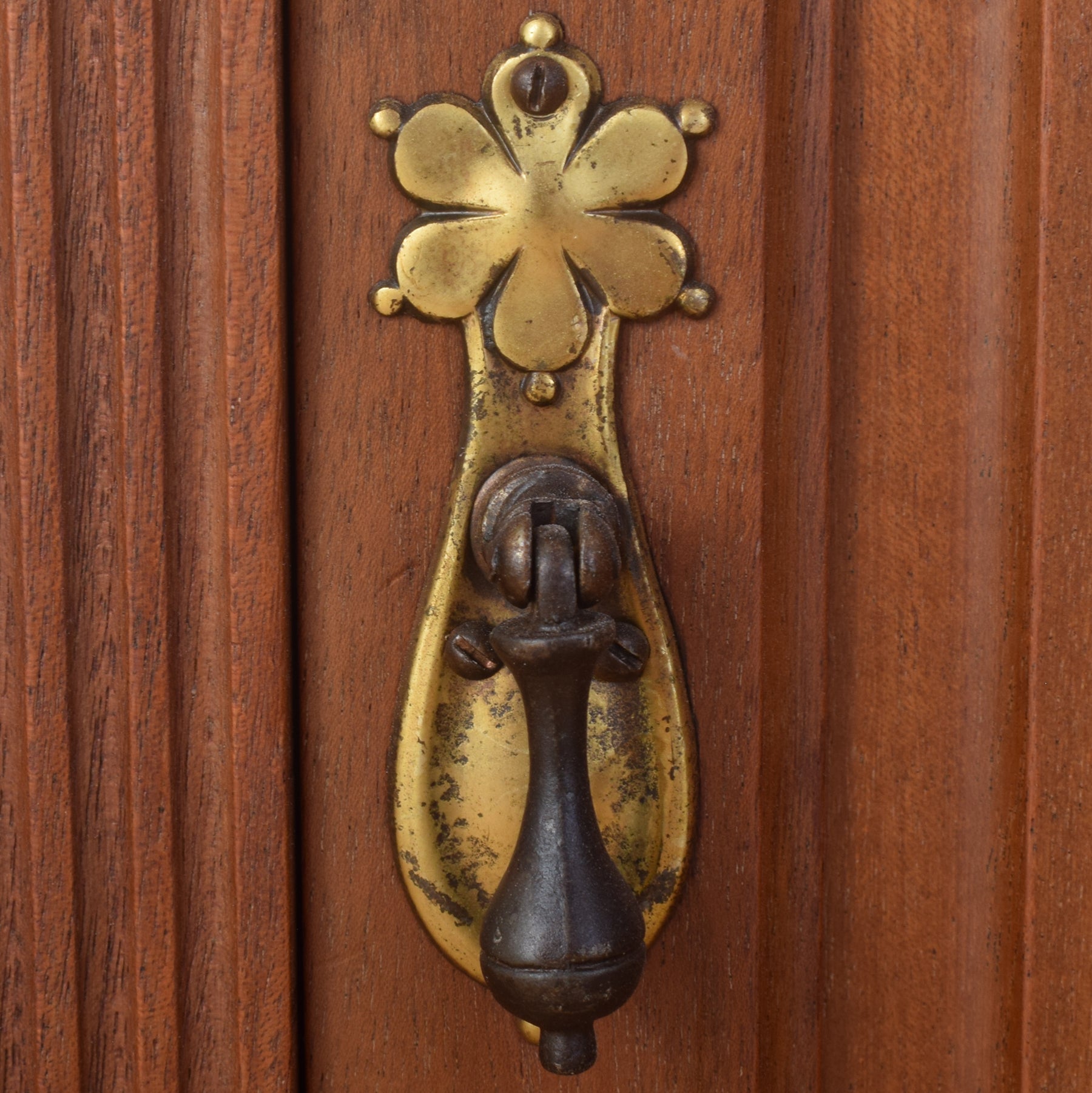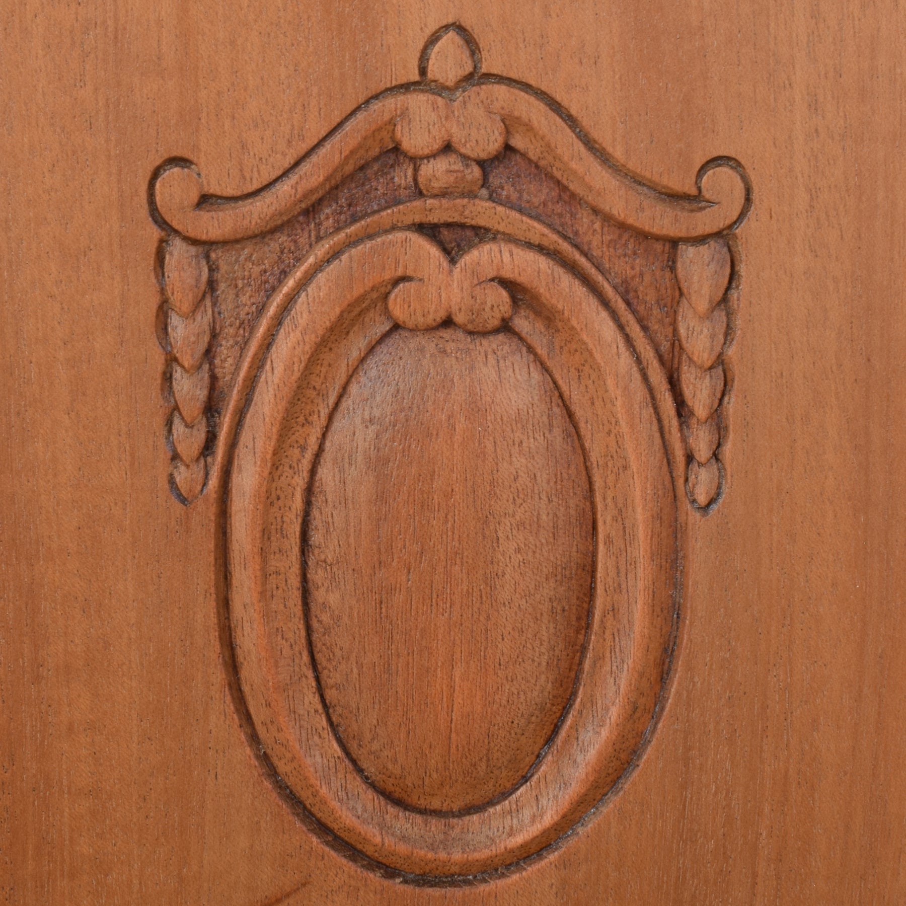The previous darker finish has been carefully stripped away, and several coats of hard-wearing matte lacquer have been applied. This process has produced a smooth, durable surface that enhances the natural mahogany tones and fine grain pattern. The piece is constructed from a combination of solid mahogany and mahogany veneer, with a rear panel made from plywood for stability.