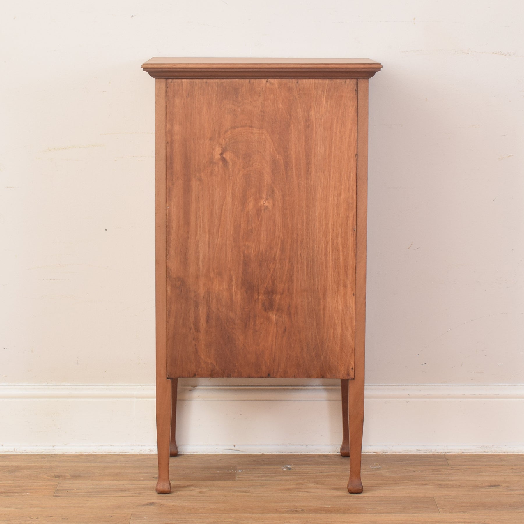 The cabinet features a single panelled door adorned with a delicate carved motif, opening to reveal interior storage ideal for records, sheet music, or other treasured items. Subtle tapered legs and a refined moulded top edge highlight its graceful proportions, while the brass handle and lock add a traditional finishing touch.