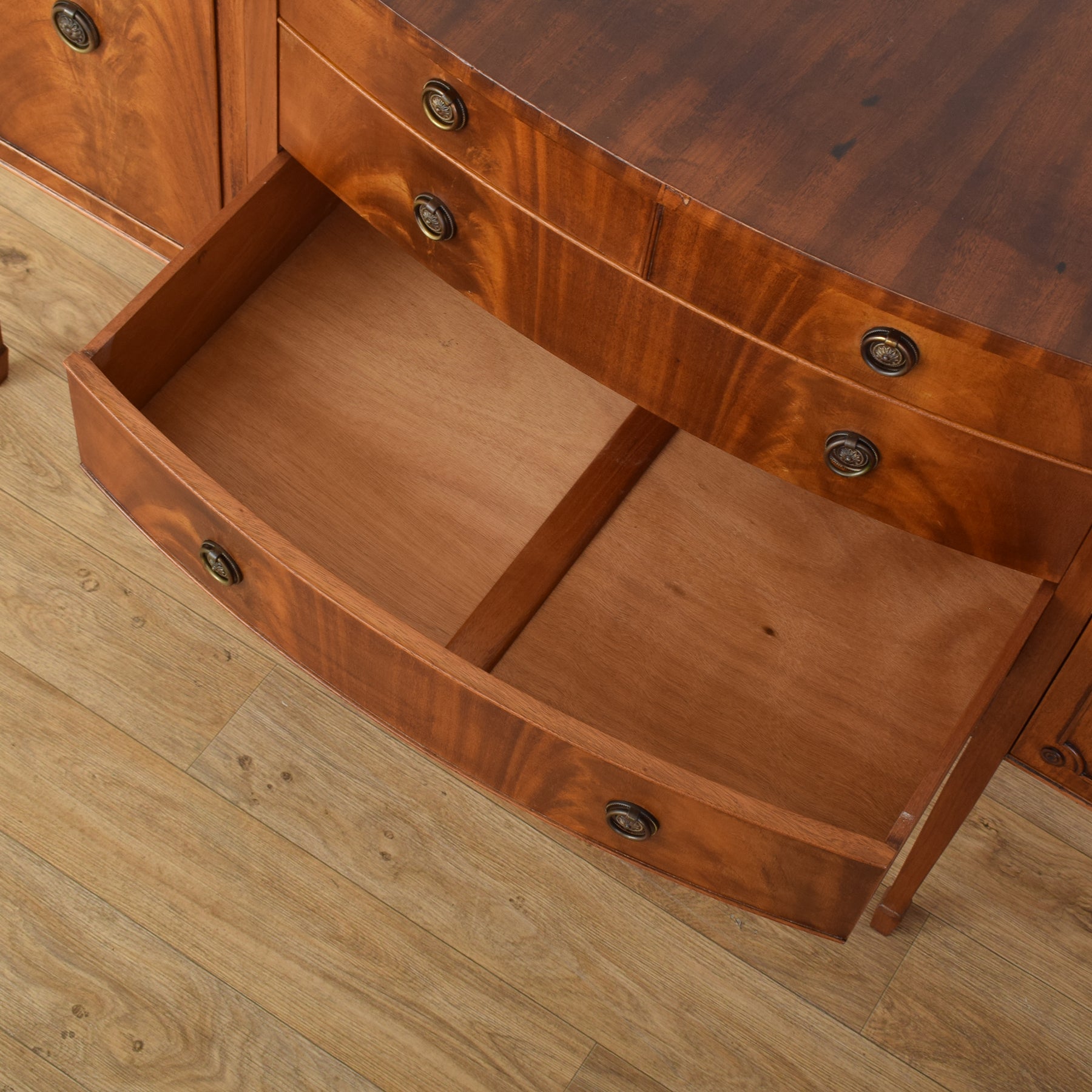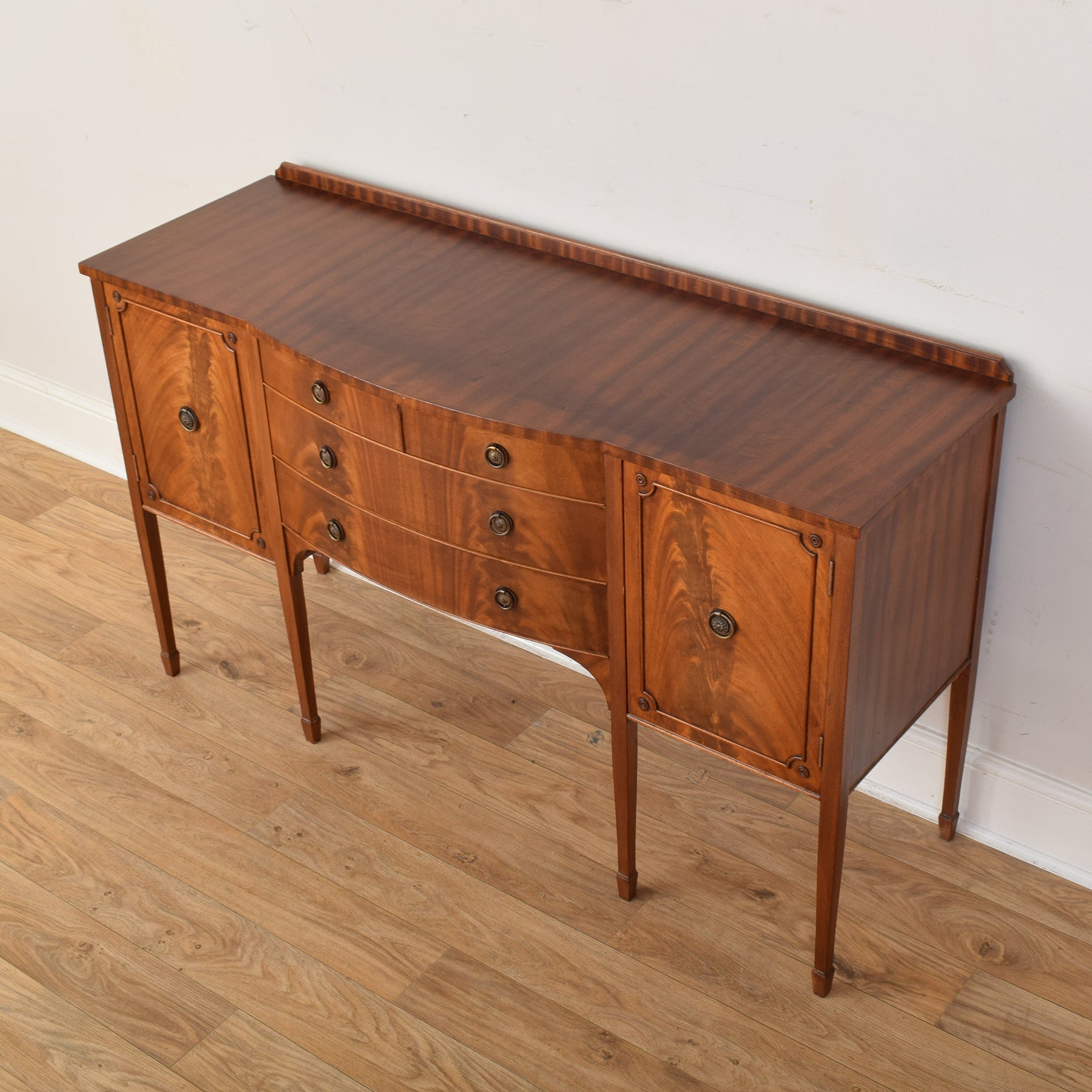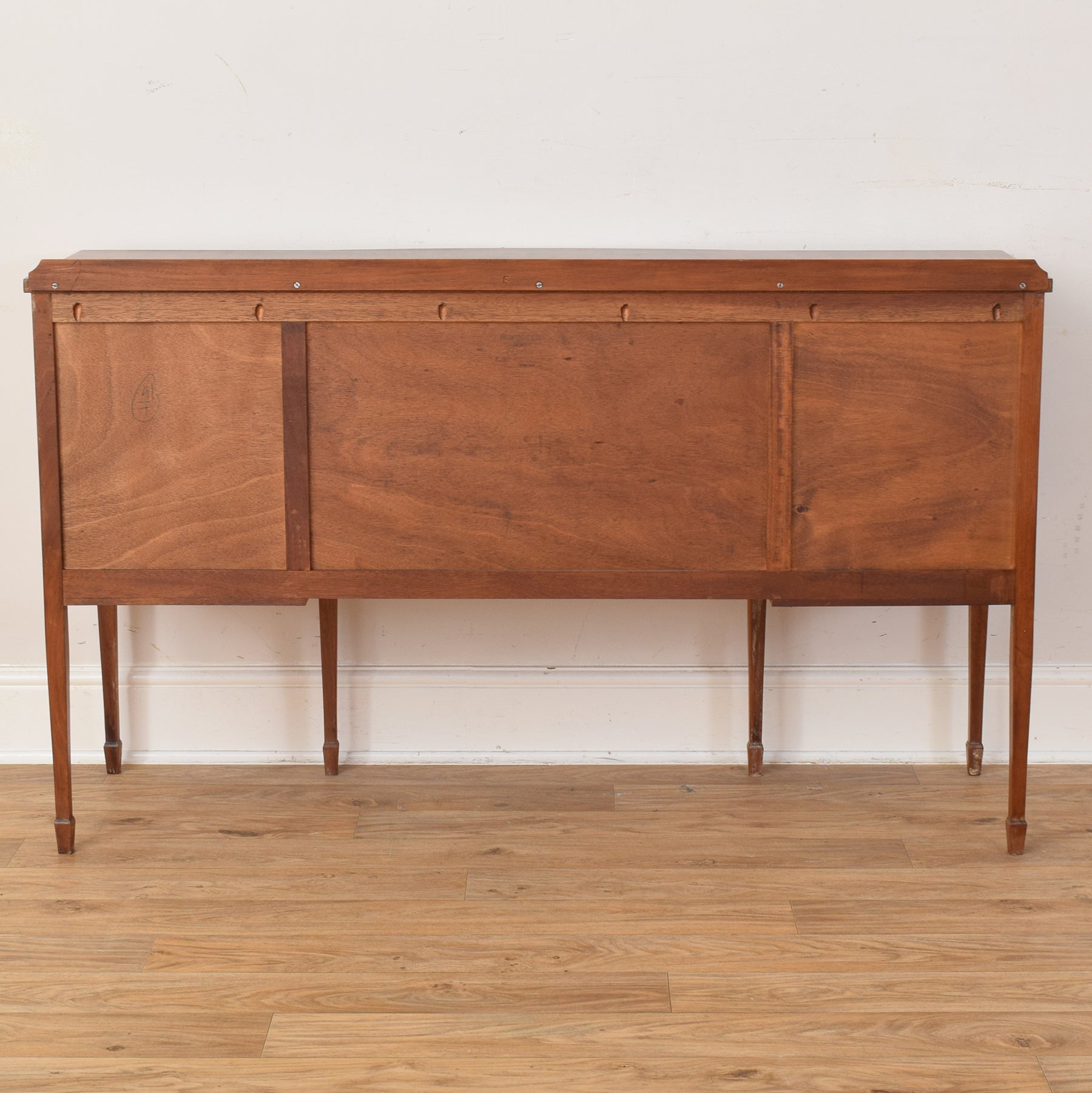 The sideboard has been carefully stripped and finished with multiple coats of durable, hard-wearing matte lacquer. This finish highlights the richness of the grain and ensures a smooth, lasting surface that is easy to maintain. The piece is made using a mahogany veneer, known for its warm reddish-brown tone and elegant, flame-like figuring, applied over a stable composite core for structural integrity. The drawer bases and rear panel are made from plywood. There is a very small chip in the veneer and an area of darker marking on the top surface, this is documented in the accompanying photographs.
