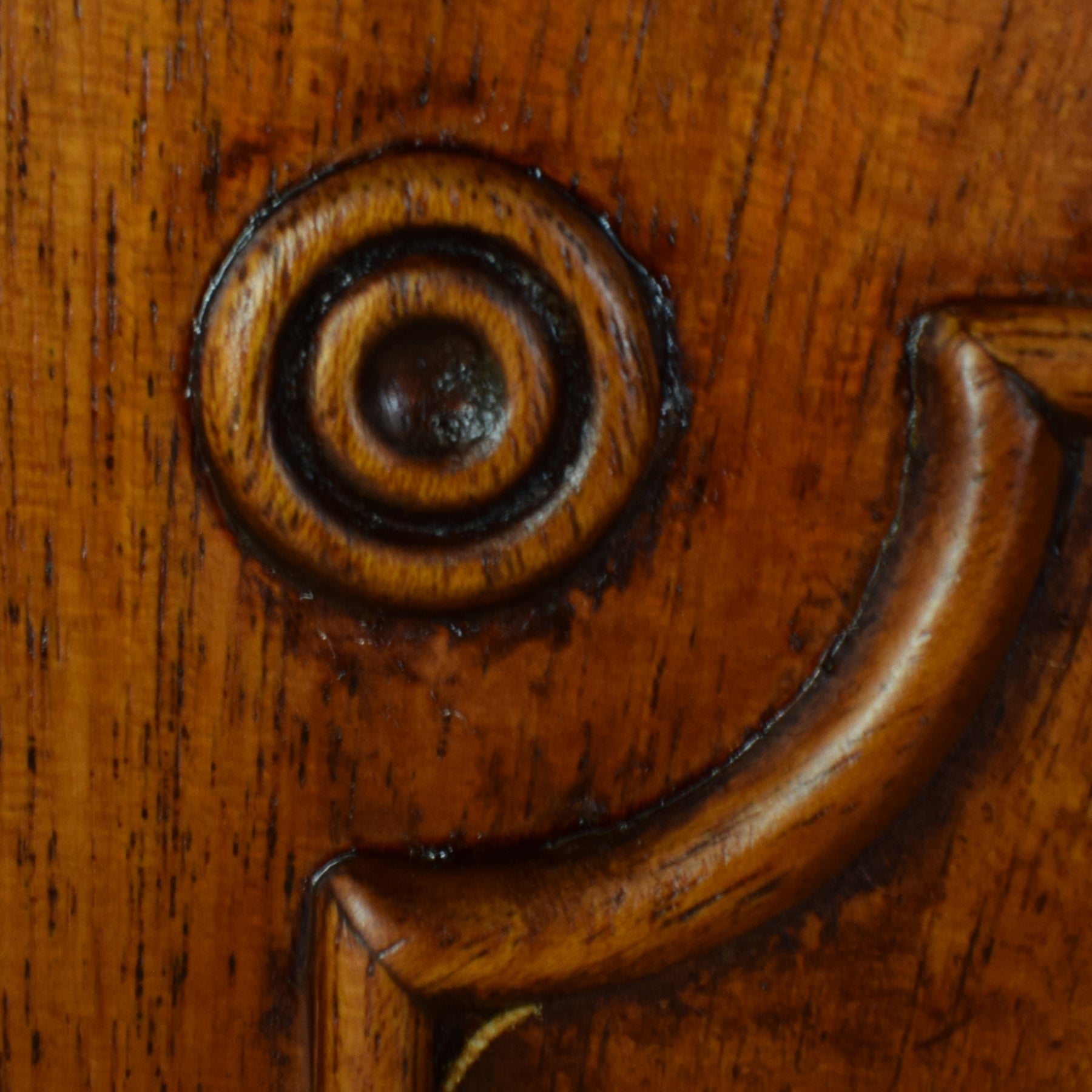 The piece features a gracefully bow-fronted central section fitted with two small drawers over two larger drawers and flanked by two spacious cupboards. The decorative brass ring handles and finely shaped legs enhance its understated sophistication. The door and drawer fronts display a striking grain pattern, giving the piece a sense of depth and natural beauty.