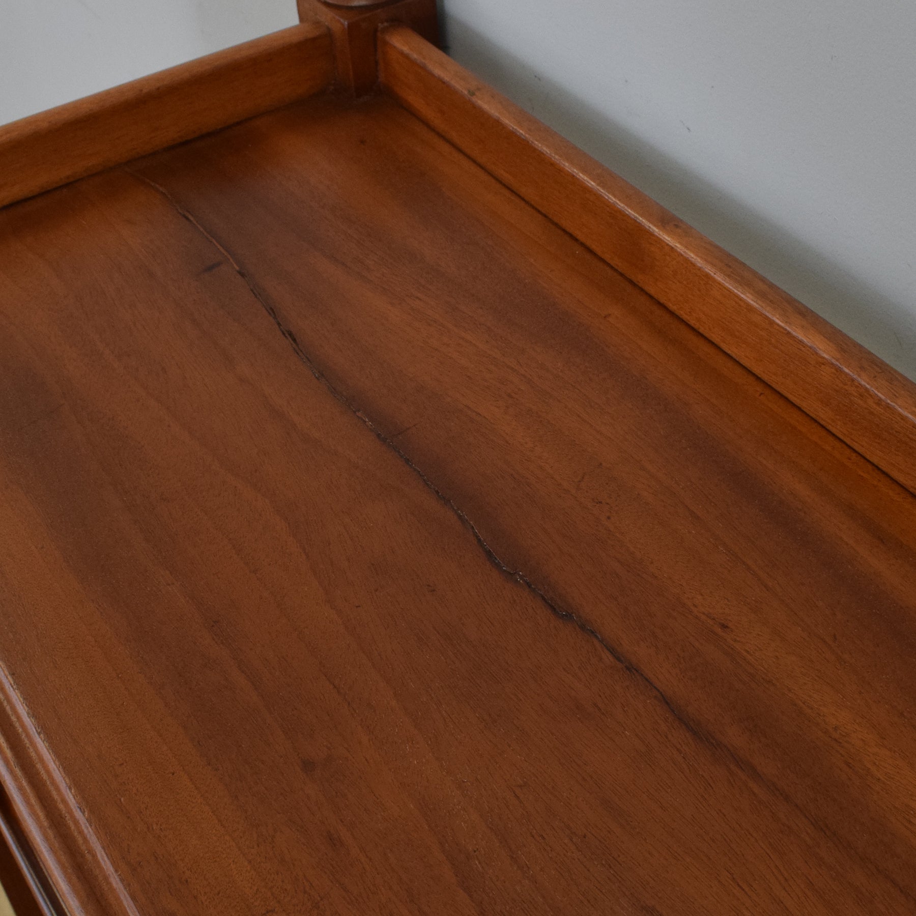 The previous finish has been stripped, and multiple coats of hard-wearing matte lacquer have been applied, offering a durable, low-sheen surface that enhances the natural warmth and colour of the mahogany. This item is made entirely from solid mahogany. Please note, there is a natural split running along the grain of the top surface, which adds to the piece’s character without affecting its structure.