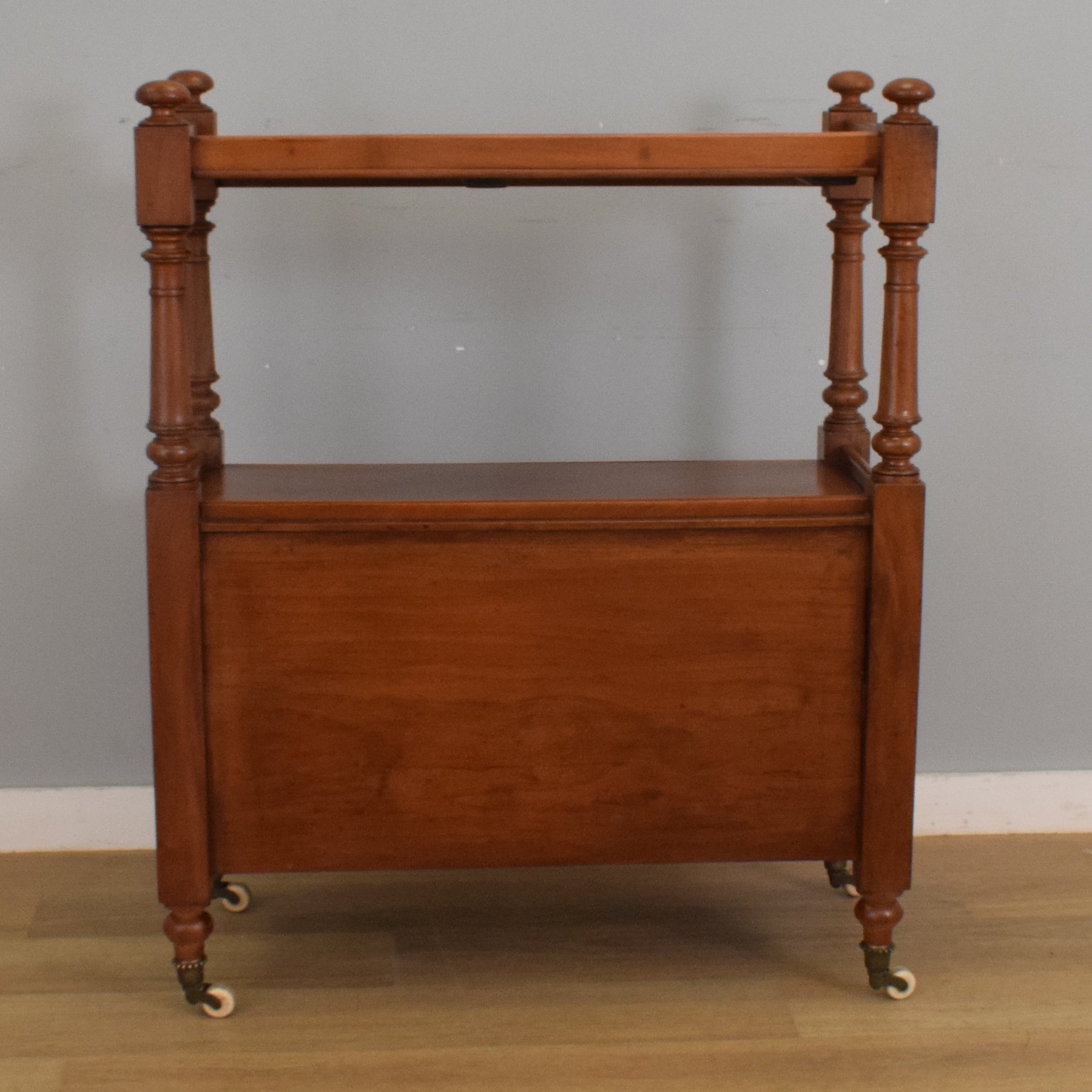 This solid mahogany waiter’s trolley features a distinctive two-tier design with turned supports and finials, giving it a timeless Victorian character. The top tier includes a raised gallery edge, ideal for display or service, while the lower cupboard provides generous storage behind twin panelled doors. The piece stands on original turned legs with brass and ceramic castors, allowing it to be moved easily and smoothly between rooms.