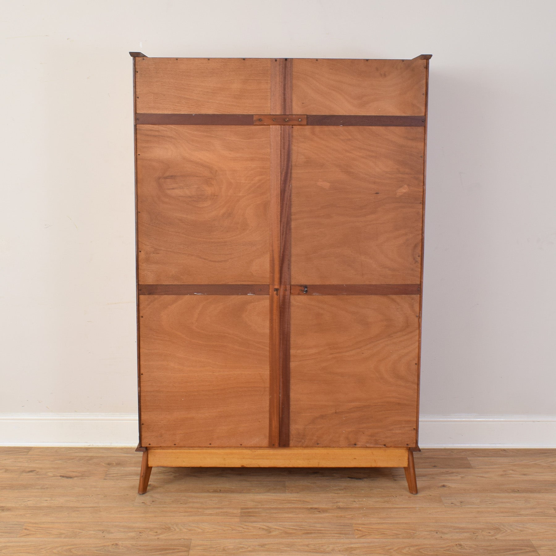 The previous darker finish has been fully stripped back, and multiple coats of hard-wearing matte lacquer have been applied. This creates a durable, long-lasting surface while enhancing the natural grain and warmth of the wood. This item is made from compressed material, covered with a mahogany veneer. The rear panel is made from plywood.
