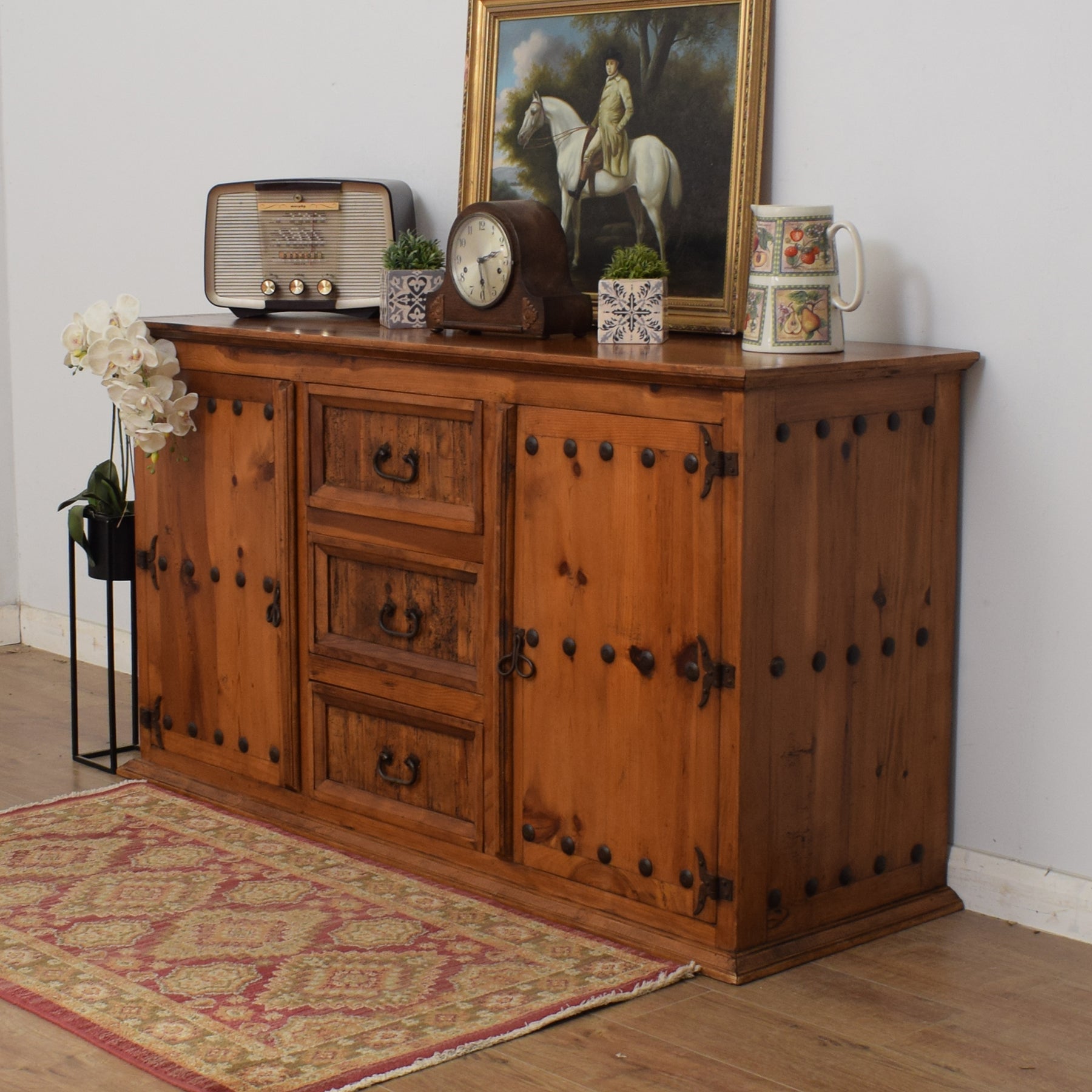 This sideboard offers three spacious drawers and two single cupboards, with shelving, providing ample storage. The attractive top is the ideal place for flowers, family photos and favourite ornaments. The doors feature decorative wrought iron studs, hinges and handles, lending a sturdy durability to the overall appearance.  Wrought iron handles on the drawers also add to the piece's robust appeal. The natural knots and patterns within the wood provide a rustic, country-style look to the piece.