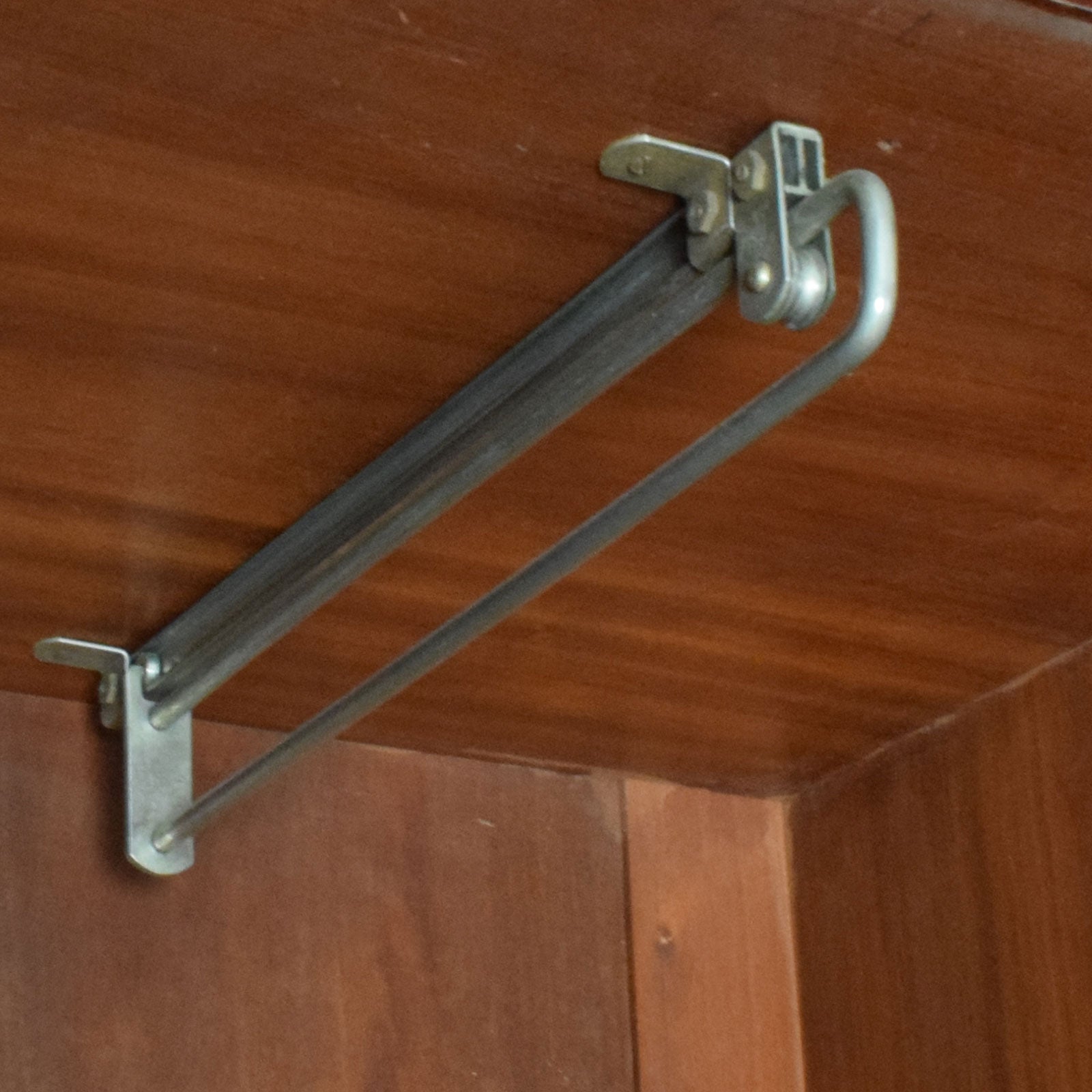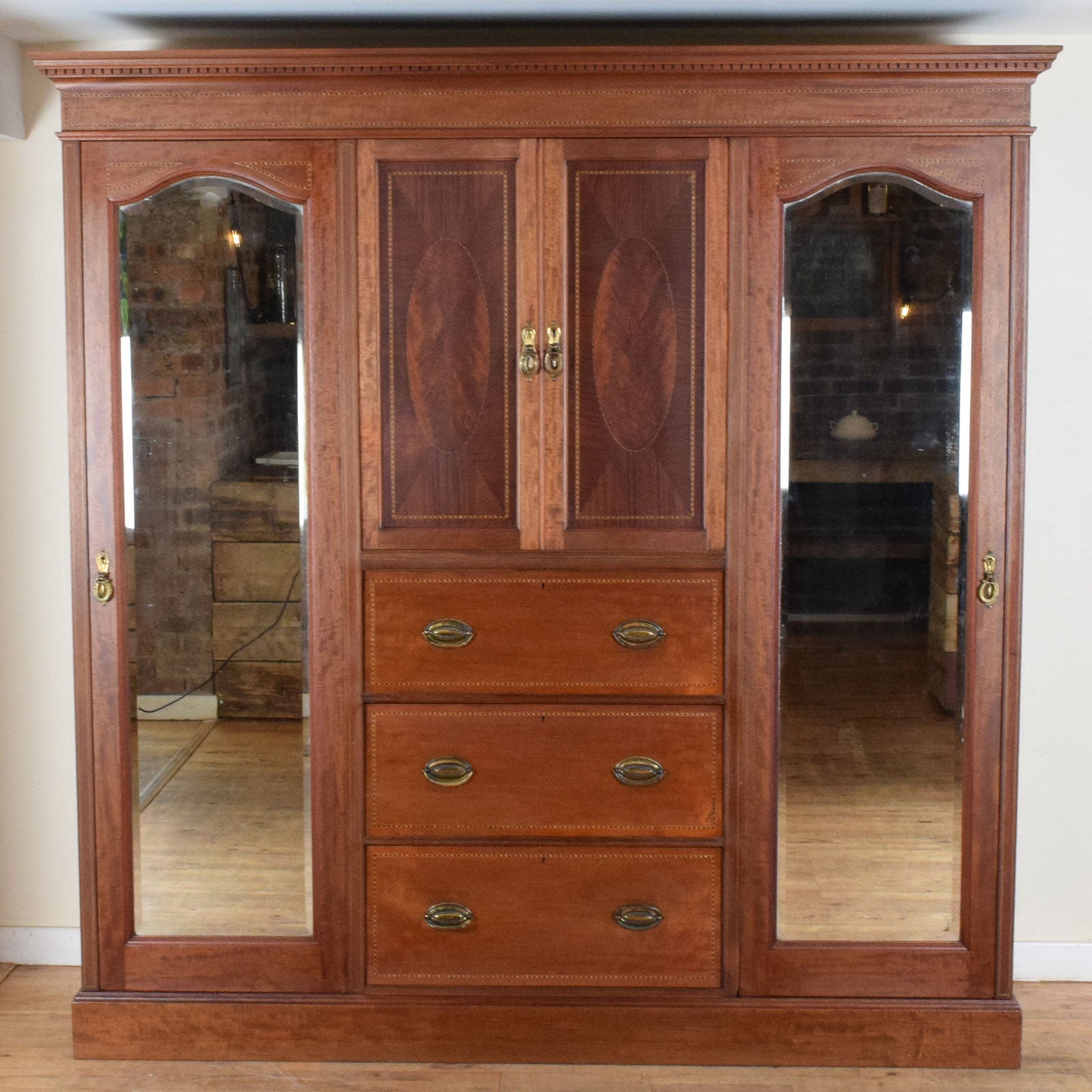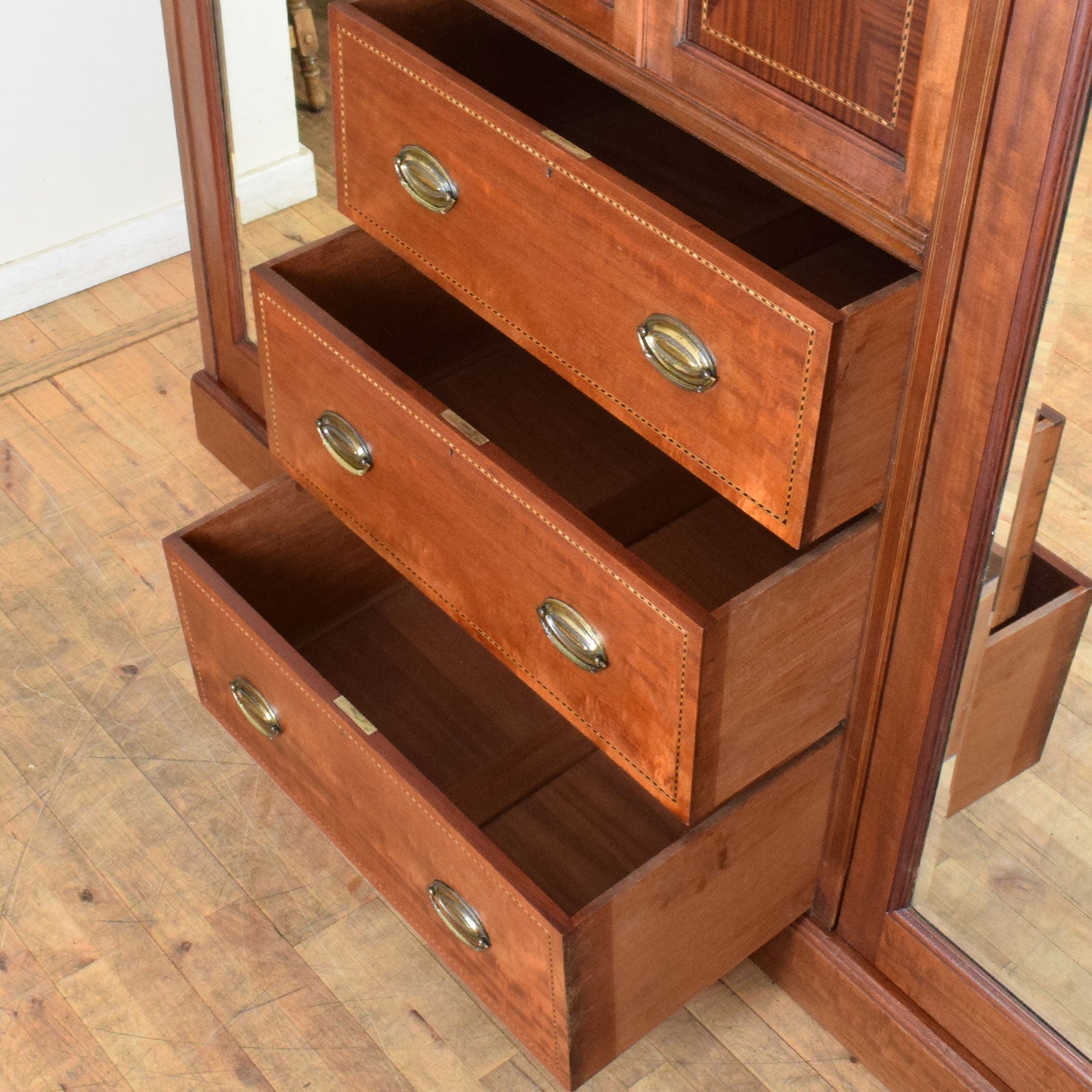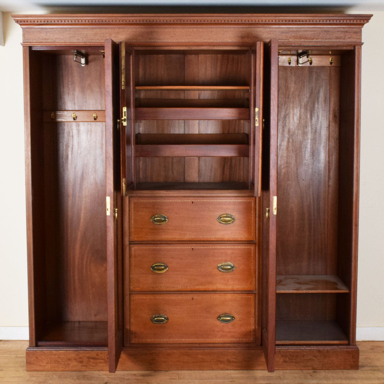 With a front-to-back hanging rail behind each mirrored door on either side and hooks along the back panels adding extra storage options, this delightful compactum will add plenty of hanging space for shirts, dresses and jackets. The pull-out trays and shelf in the top-middle section and the three deep drawers below add to the storage. There is veneer damage on the right-hand door of the centre section and the bottom corners of the compactum which can be seen in the pictures.