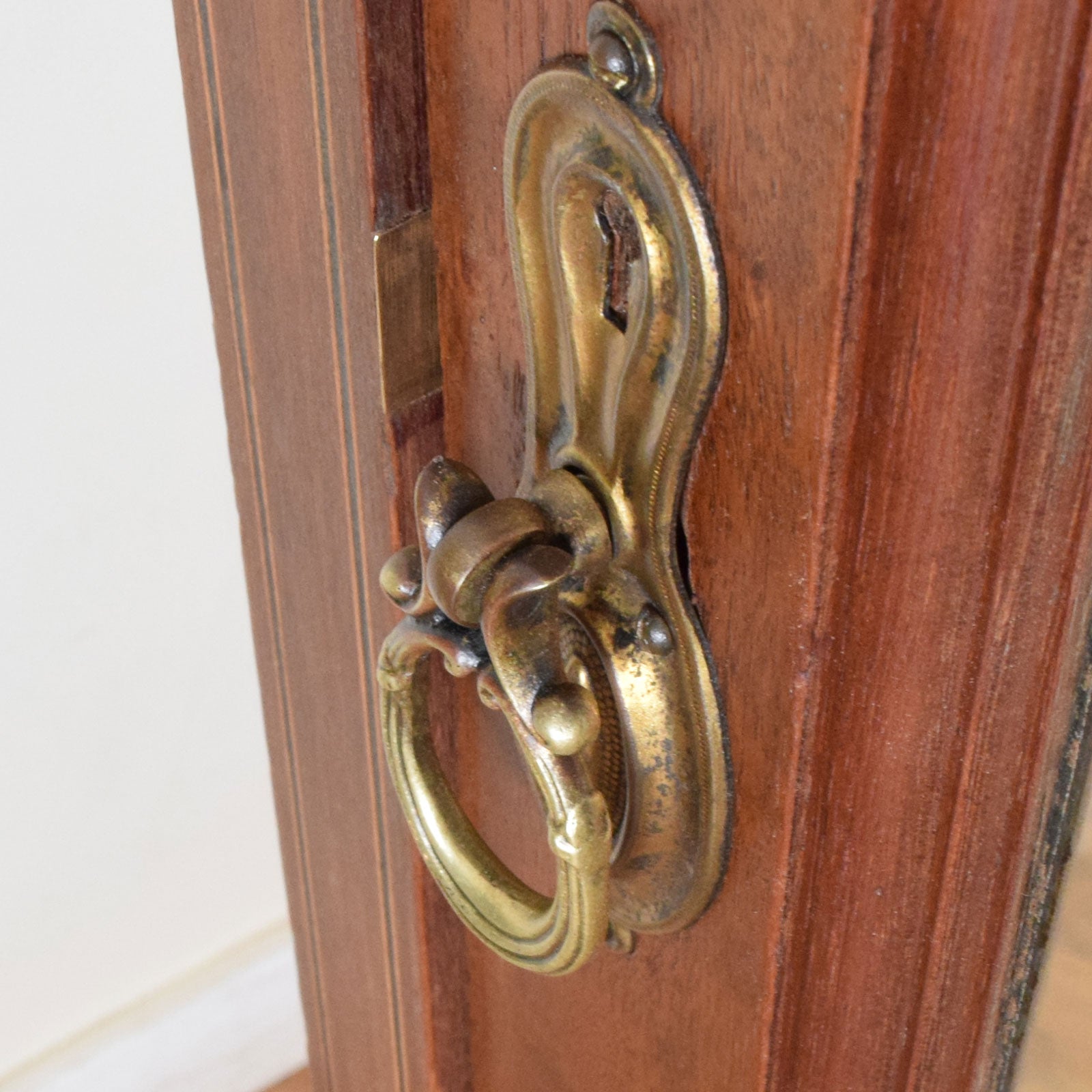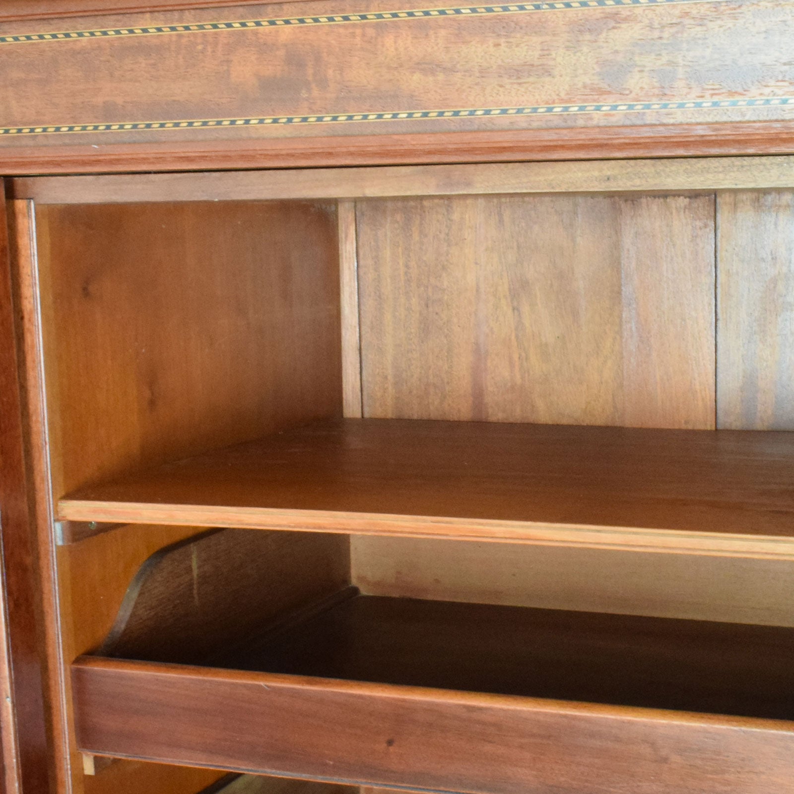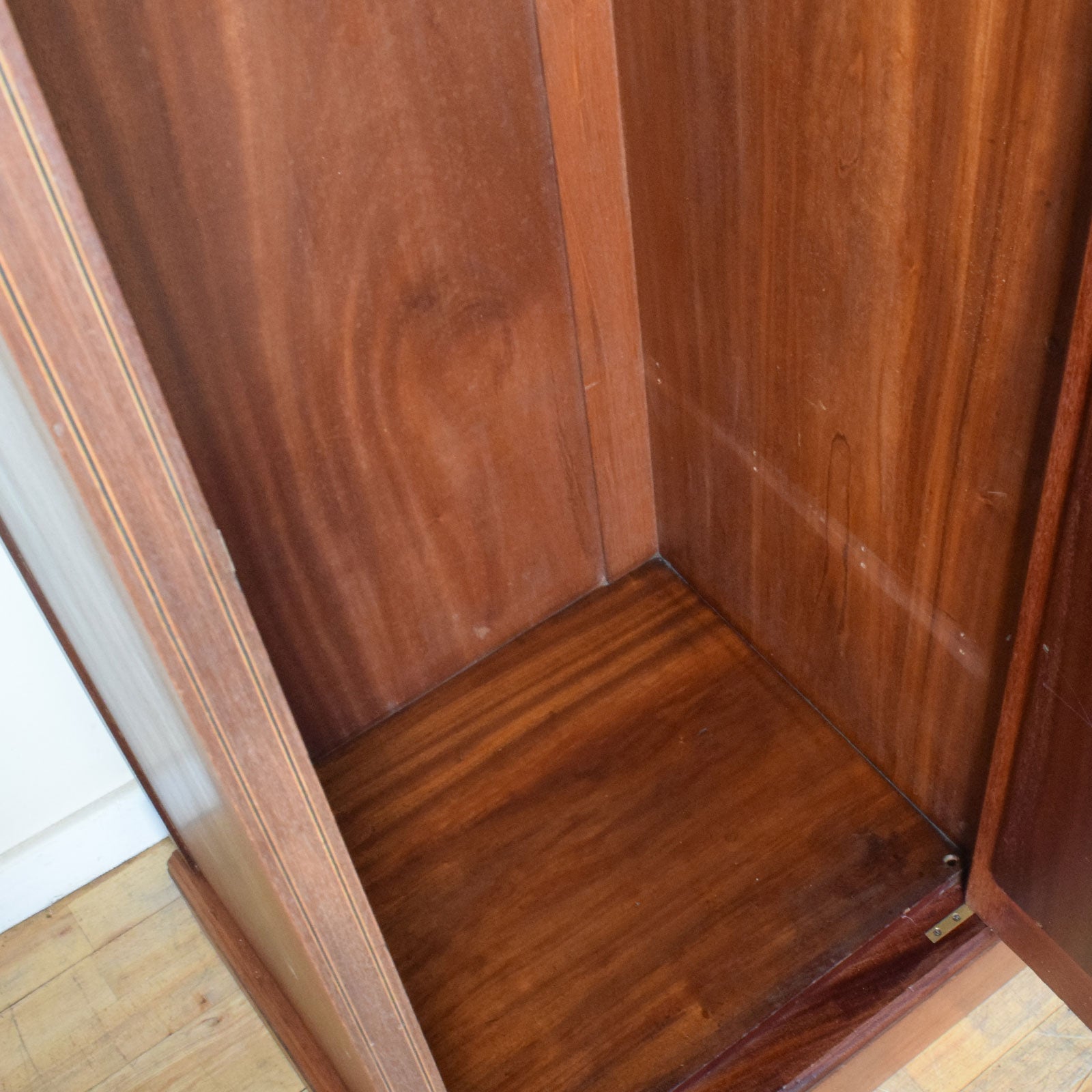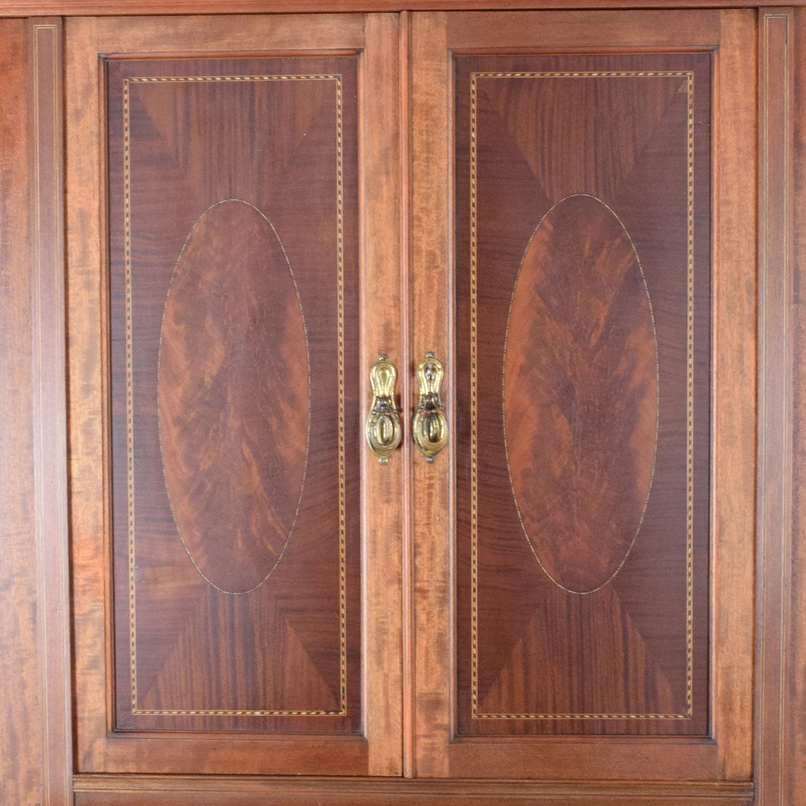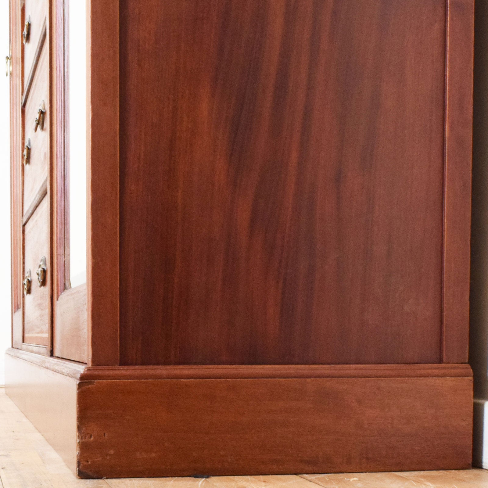 We have lovingly restored this piece by stripping back the original darker finish and applying a clear lacquer, to bring out the rich natural tones of the mahogany and to give a hard-wearing finish. this compactum is made from a mixture of wood covered in a mahogany veneer with drawer bases and back panels made from plywood.