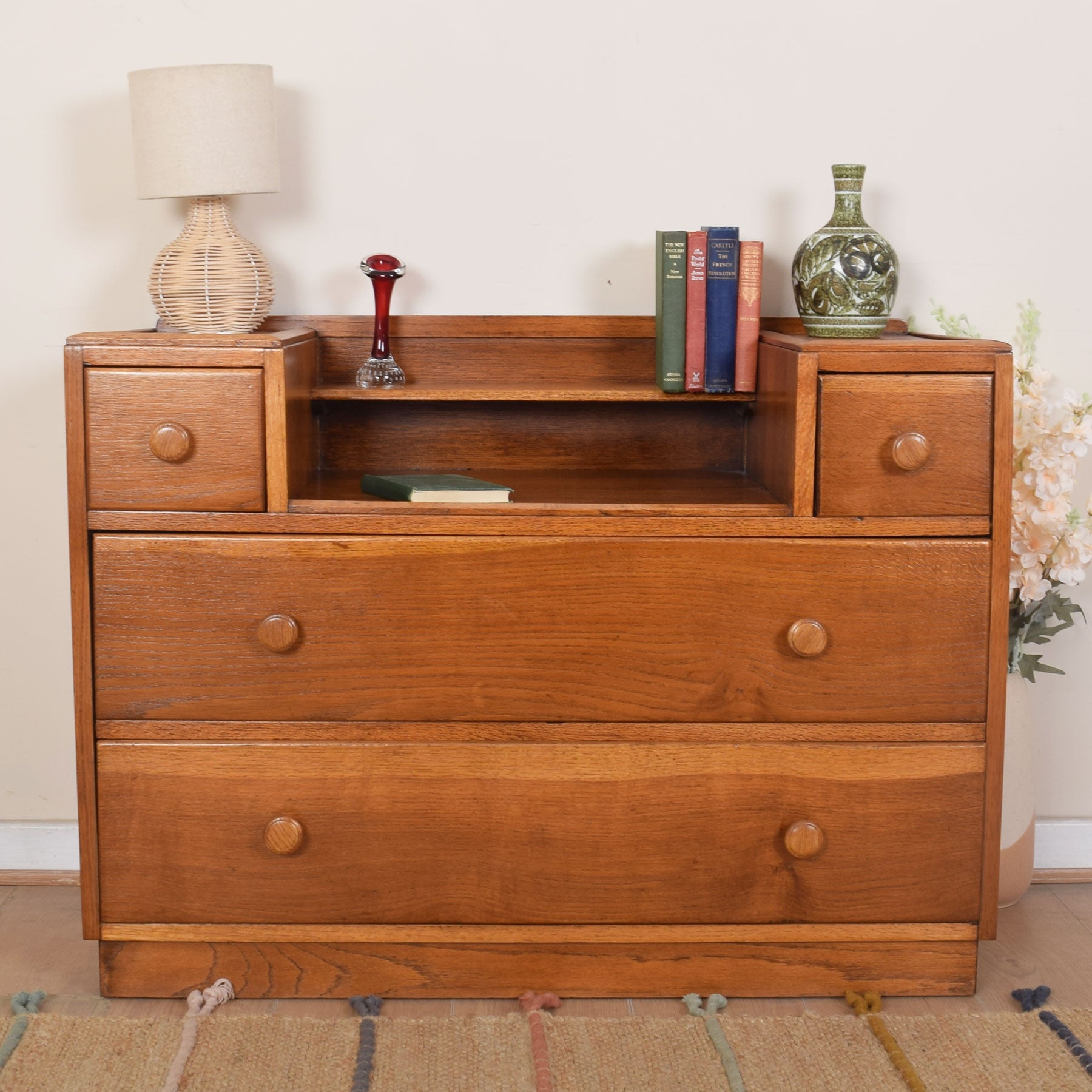 Our restoration workshop has stripped and cleaned this dressing table before applying a matt lacquer that enhances the character of the oak, as well as providing a good level of everyday protection. The dimensions show the maximum height of this unit measured at the back, followed in brackets by the two heights of the main top surface separated by '/'. It should be noted that this dressing table formerly had a mirror attached to the back.