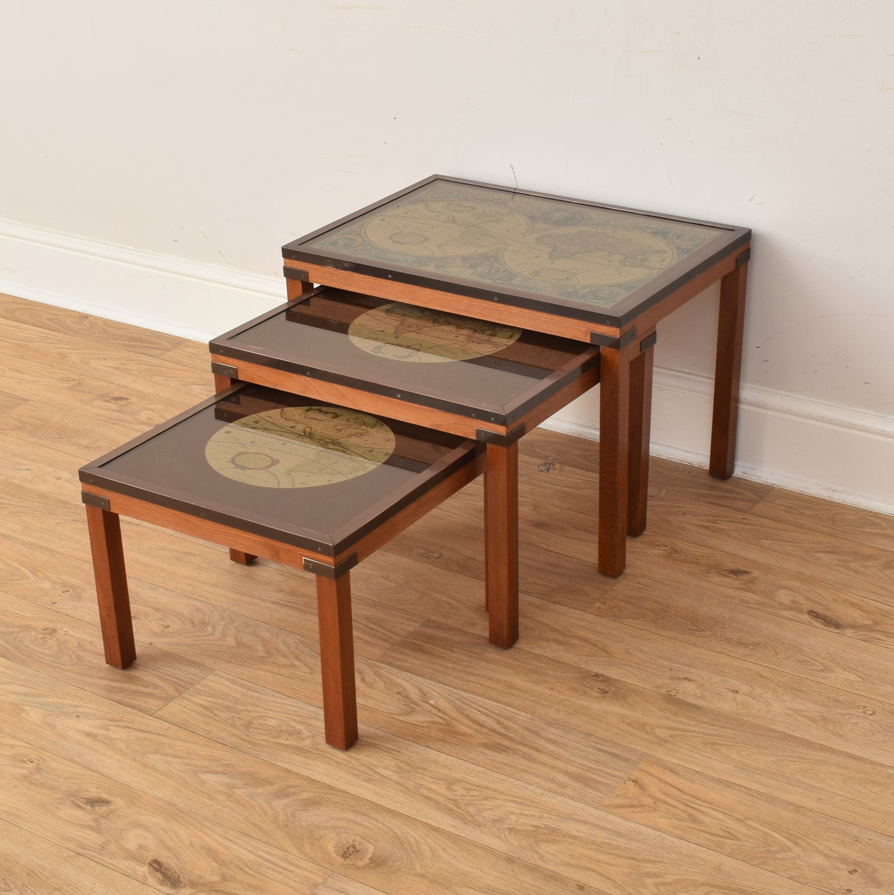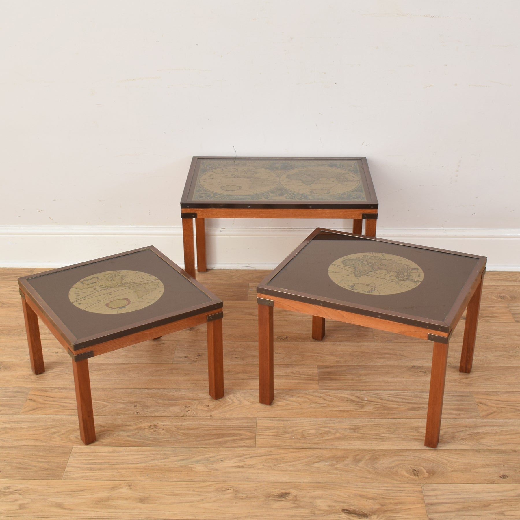 This set of three vintage nesting tables features wooden frames paired with distinctive glass tops. Each top displays a printed map design beneath the glass, giving the tables a unique and timeless appeal. The neat square shape and straight legs ensure the set can be easily arranged together or used separately around a room, making them versatile for a range of settings.