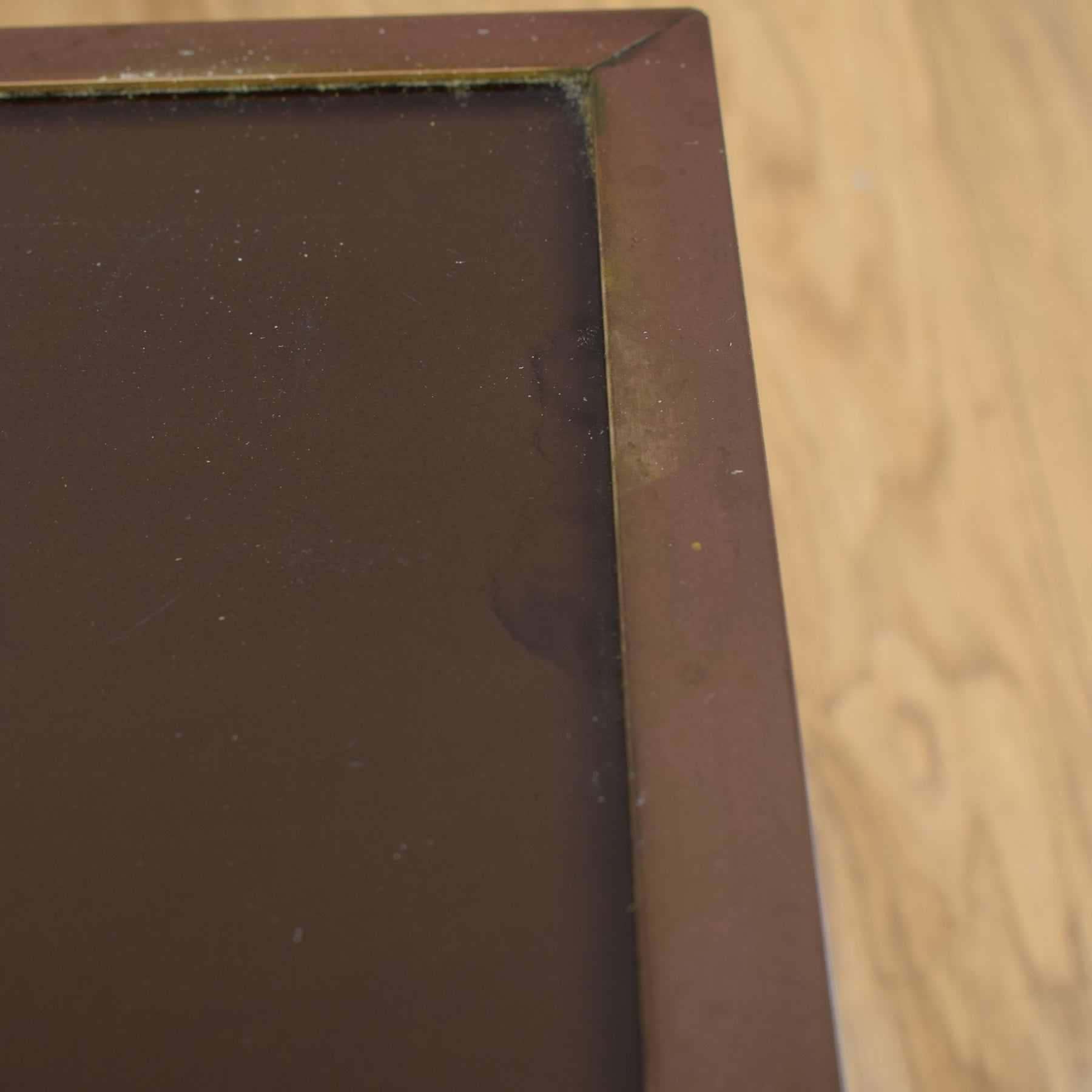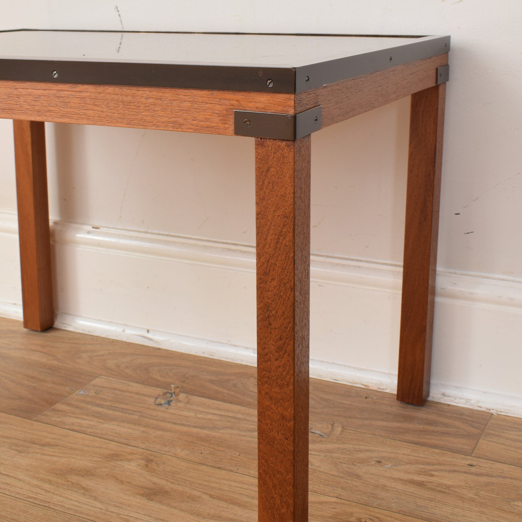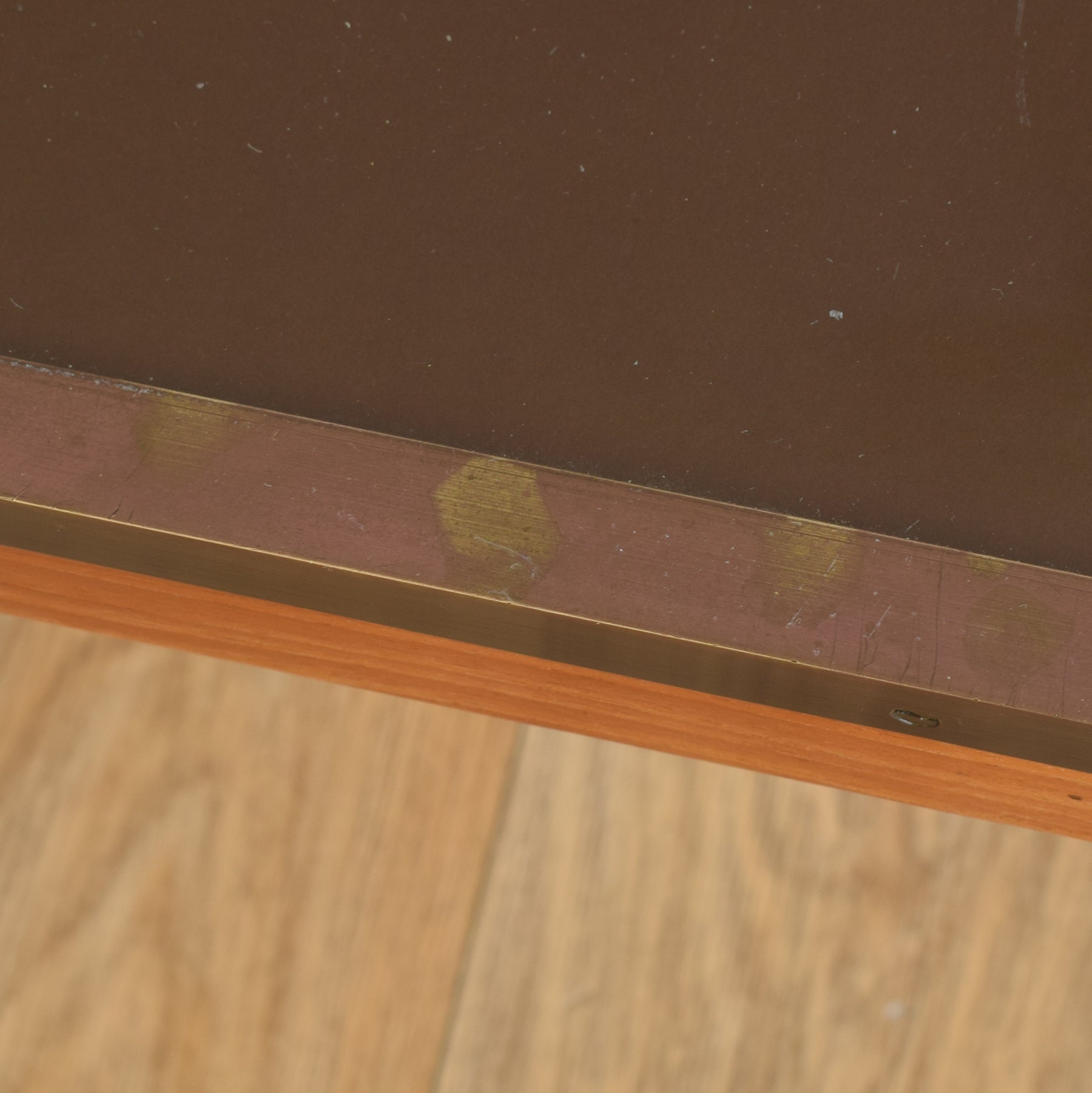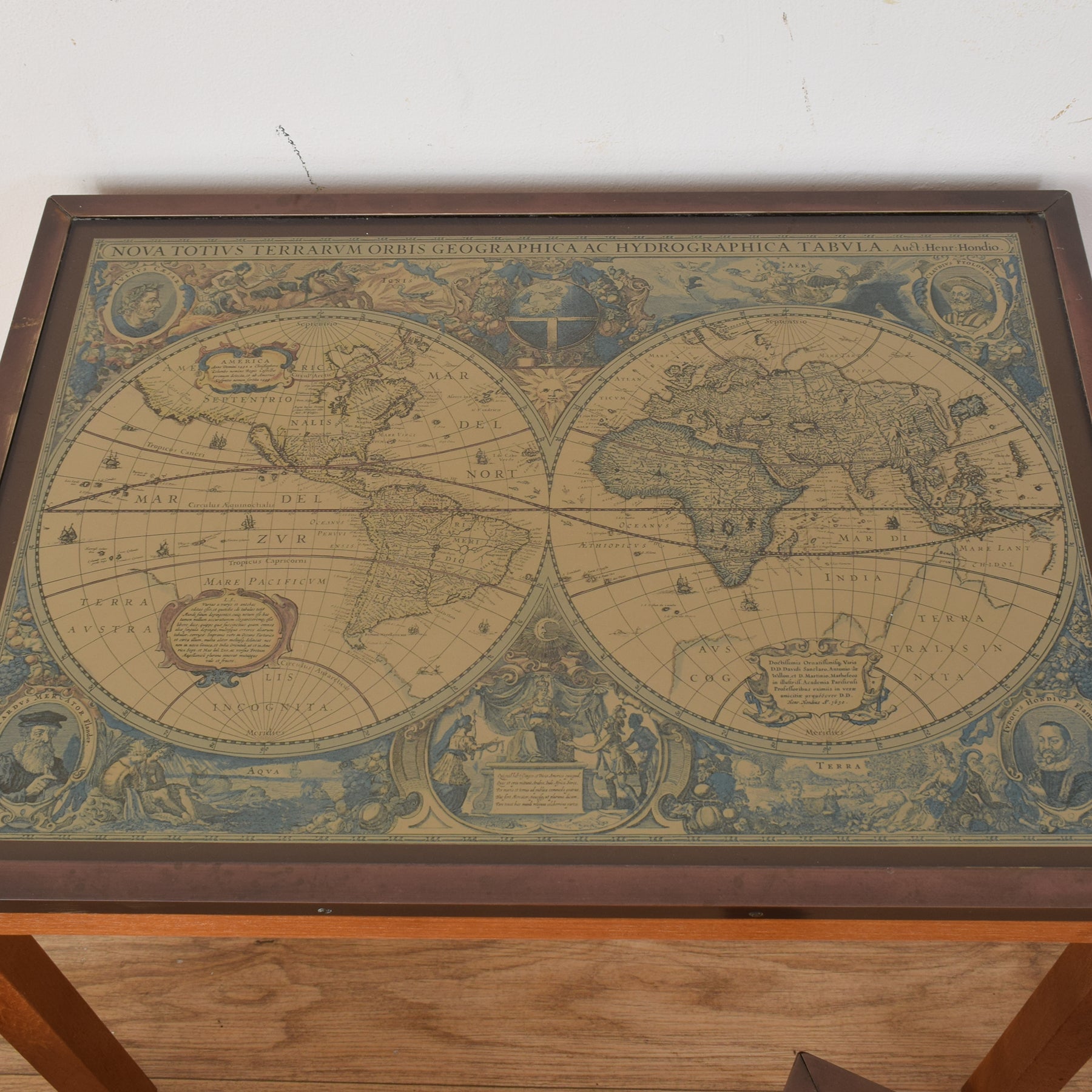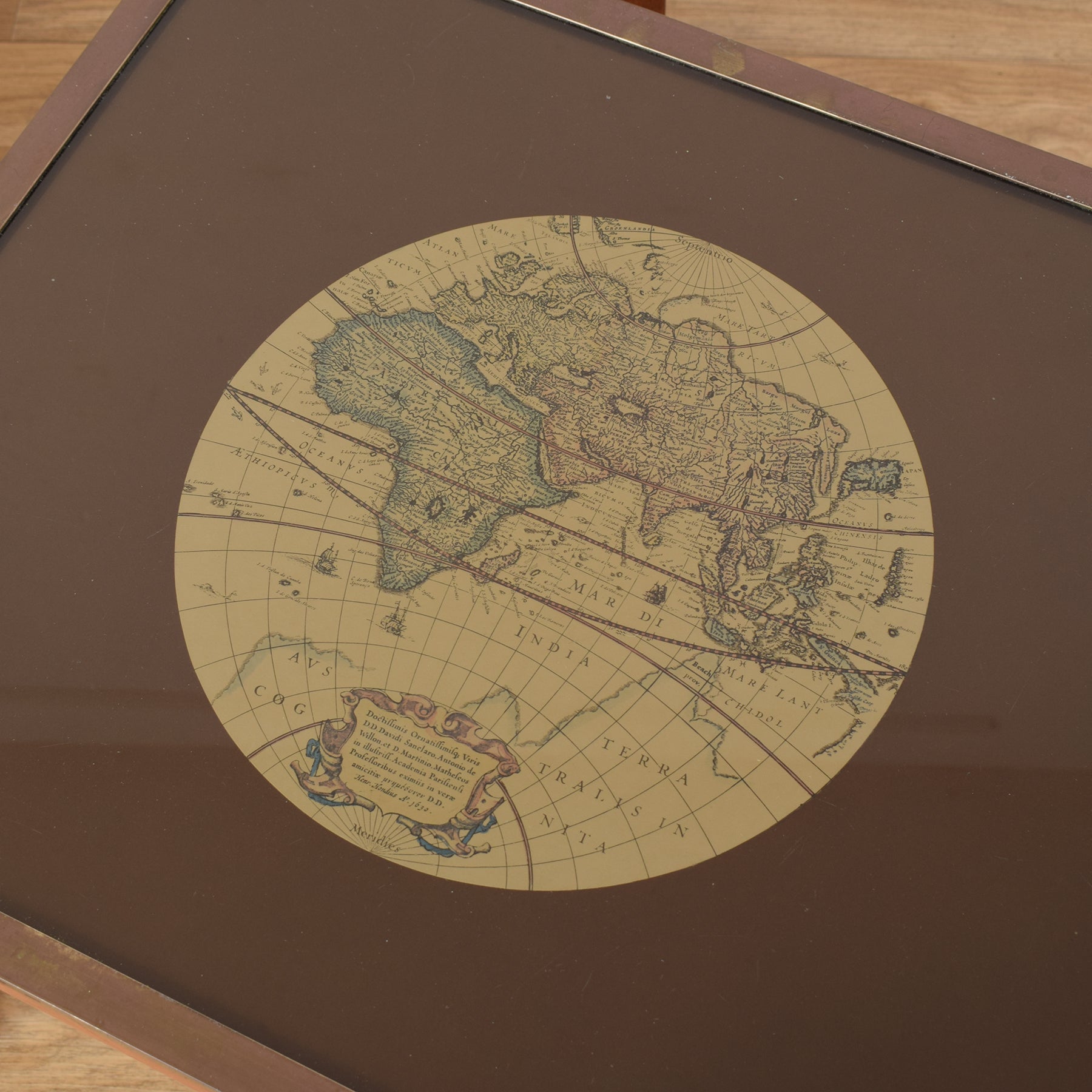 The wooden frames have been carefully stripped of their previous finish and treated with multiple coats of hard-wearing matte lacquer, bringing out the natural warmth of the wood while providing a durable surface. The glass tops and metal trims have been cleaned and polished to restore clarity and enhance the vintage map detail beneath. The table frames are made from a mixture of solid oak and plywood with glass inset tops. There are age related marks on the metal trims and areas of scratching on the glass, this is visible in the accompanying photographs.