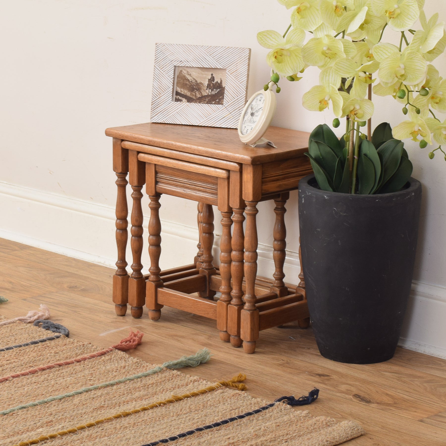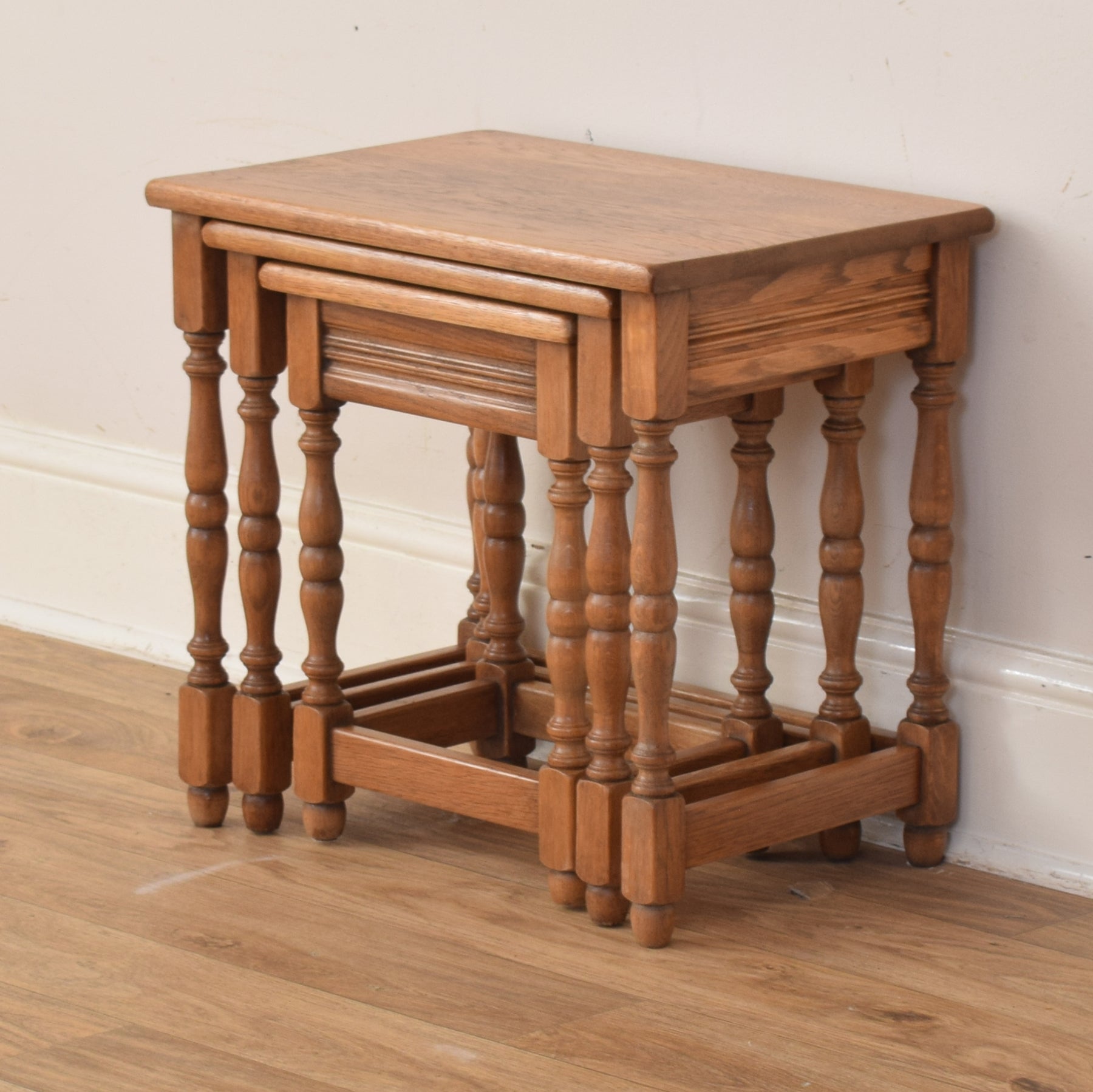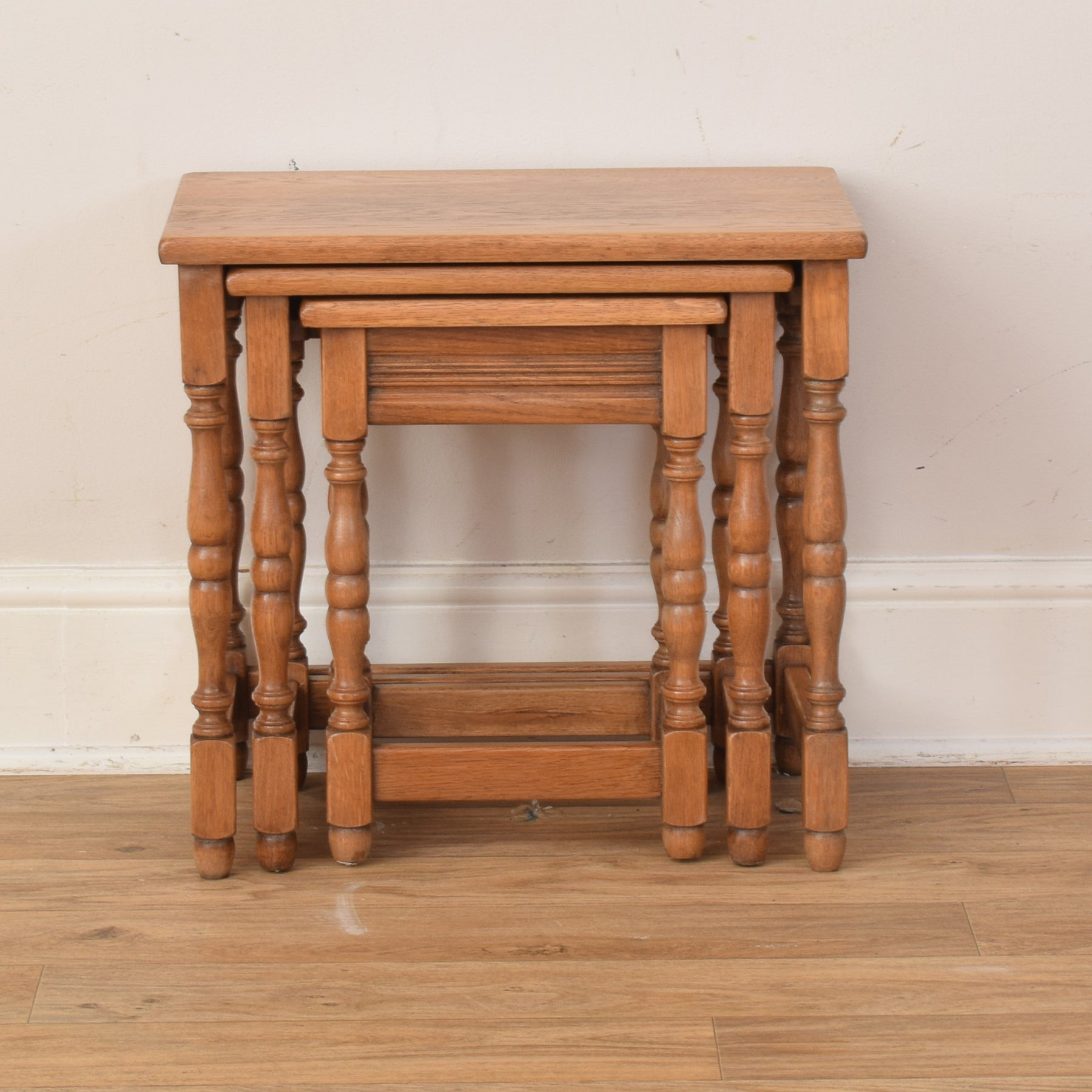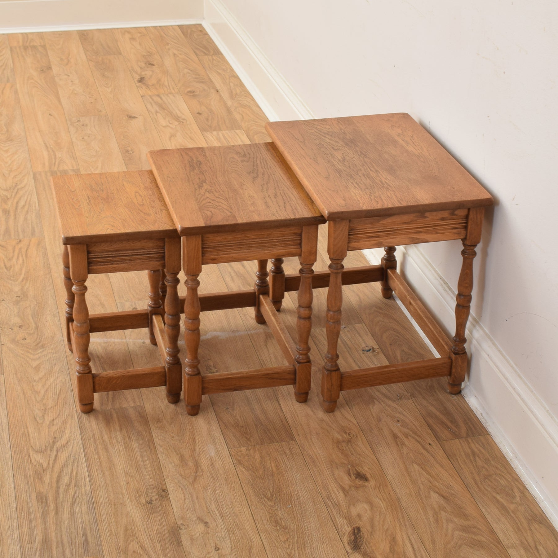 This traditional set of three nesting tables is crafted in solid oak, each one fitting smoothly beneath the next. The tabletops have gently rounded edges, while the turned legs add a touch of classic detail. Despite their compact size, the tables are sturdy and well-balanced, making them useful for a range of everyday tasks.