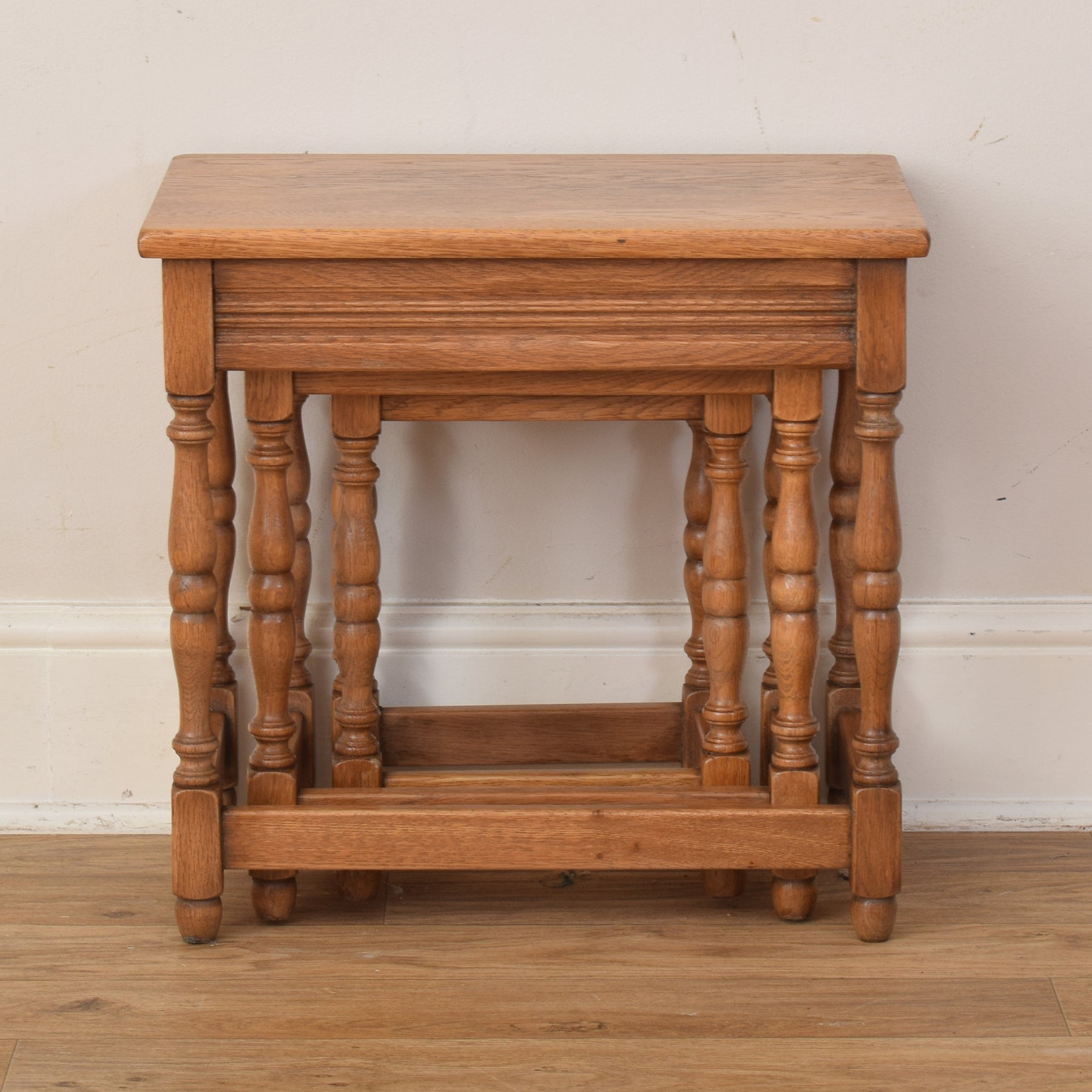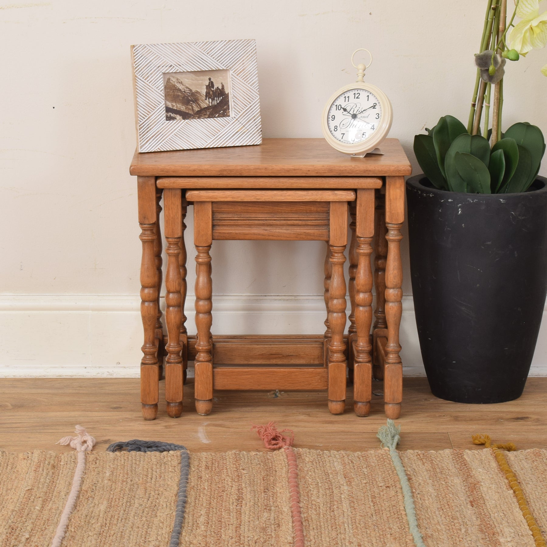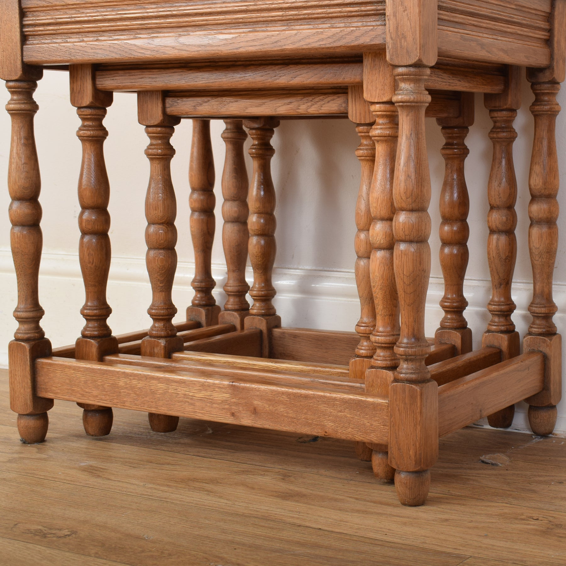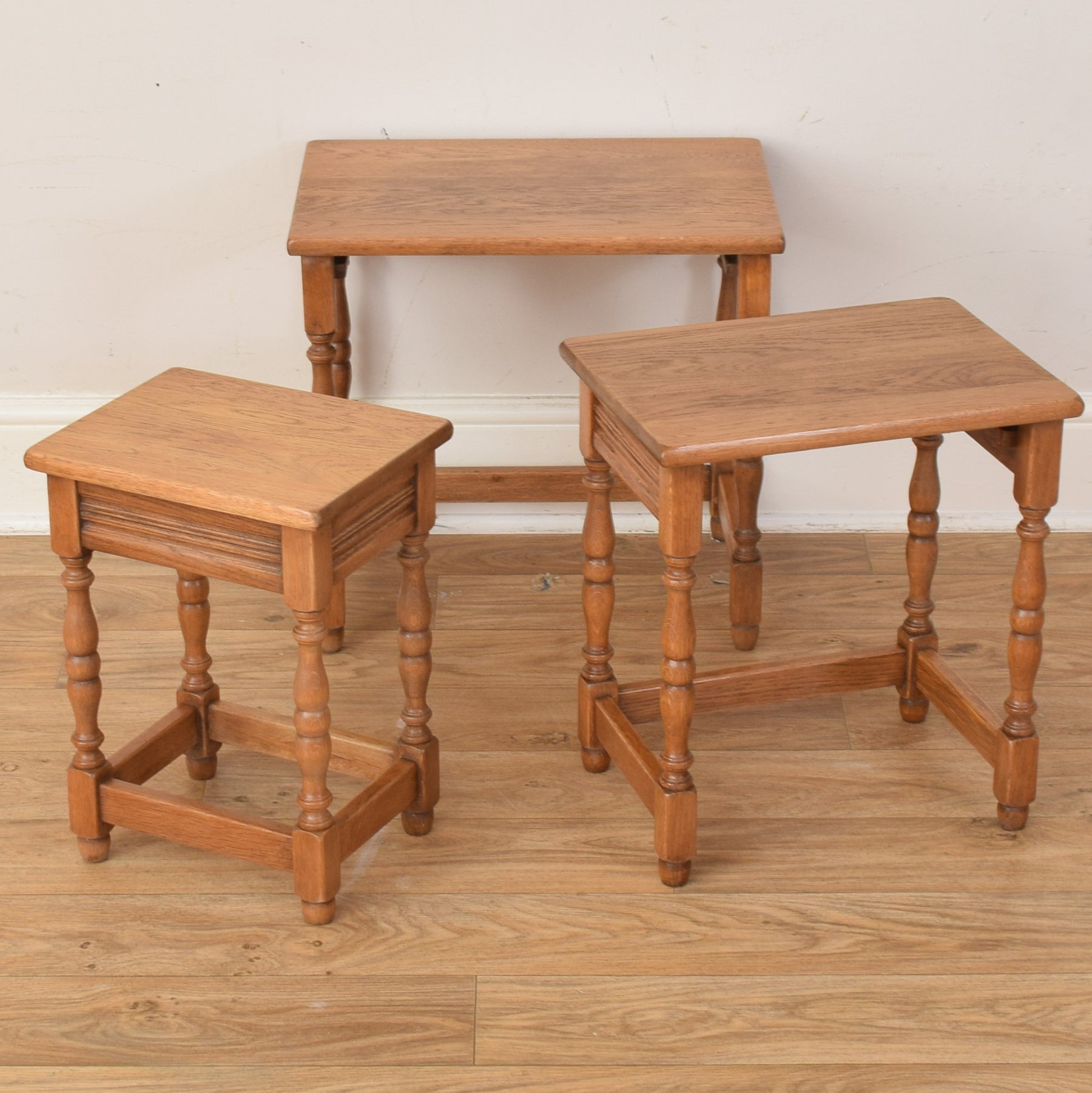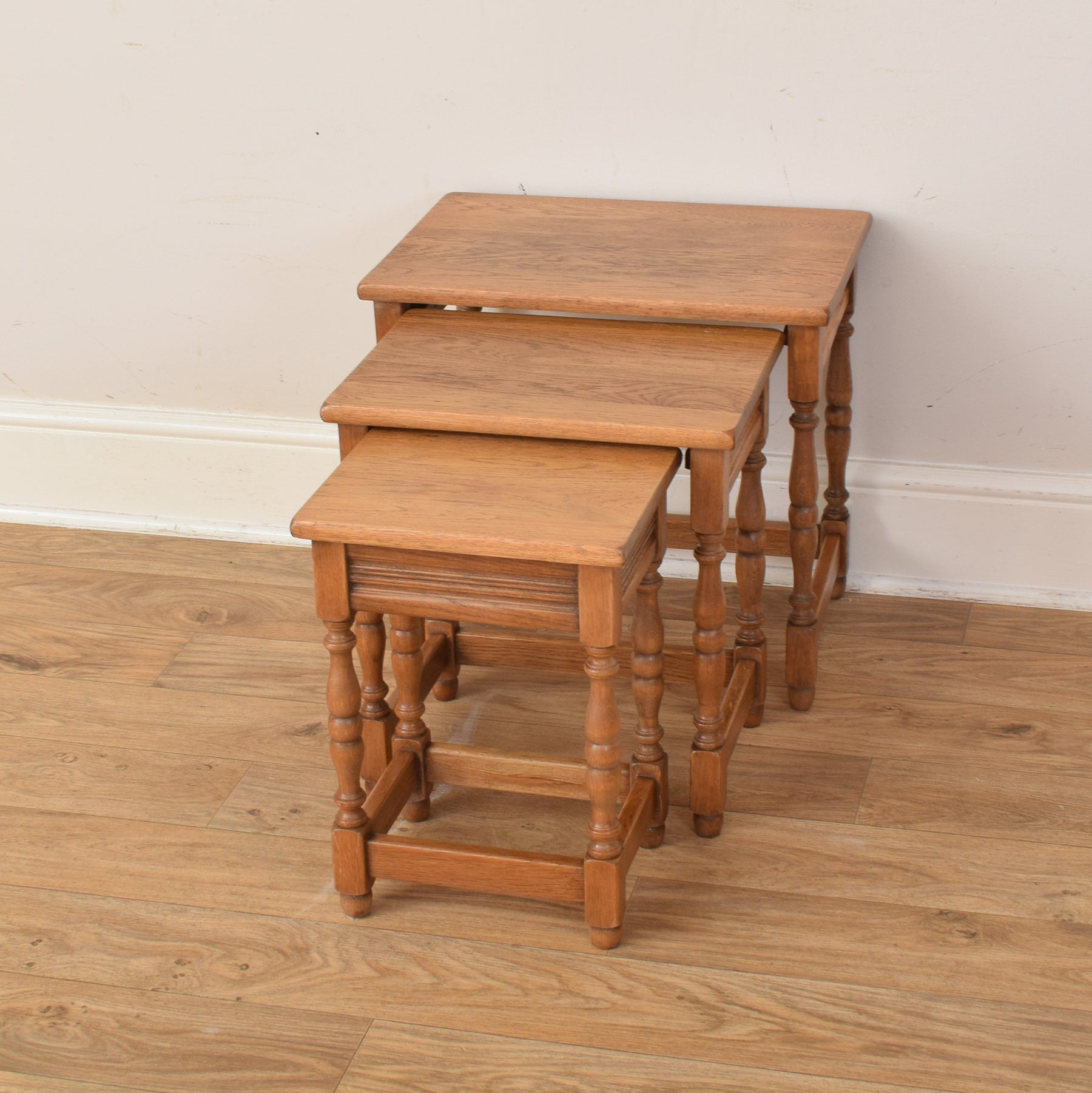 This traditional set of three nesting tables is crafted in solid oak, each one fitting smoothly beneath the next. The tabletops have gently rounded edges, while the turned legs add a touch of classic detail. Despite their compact size, the tables are sturdy and well-balanced, making them useful for a range of everyday tasks.