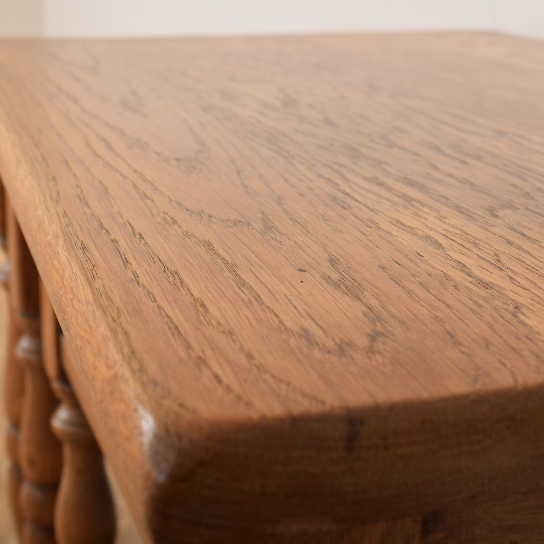 The previous darker finish has been carefully stripped, and multiple coats of hard-wearing matte lacquer have been applied. This not only enhances the visible wood grain but also provides a smooth, durable surface suitable for regular use. This item is made entirely from solid oak.