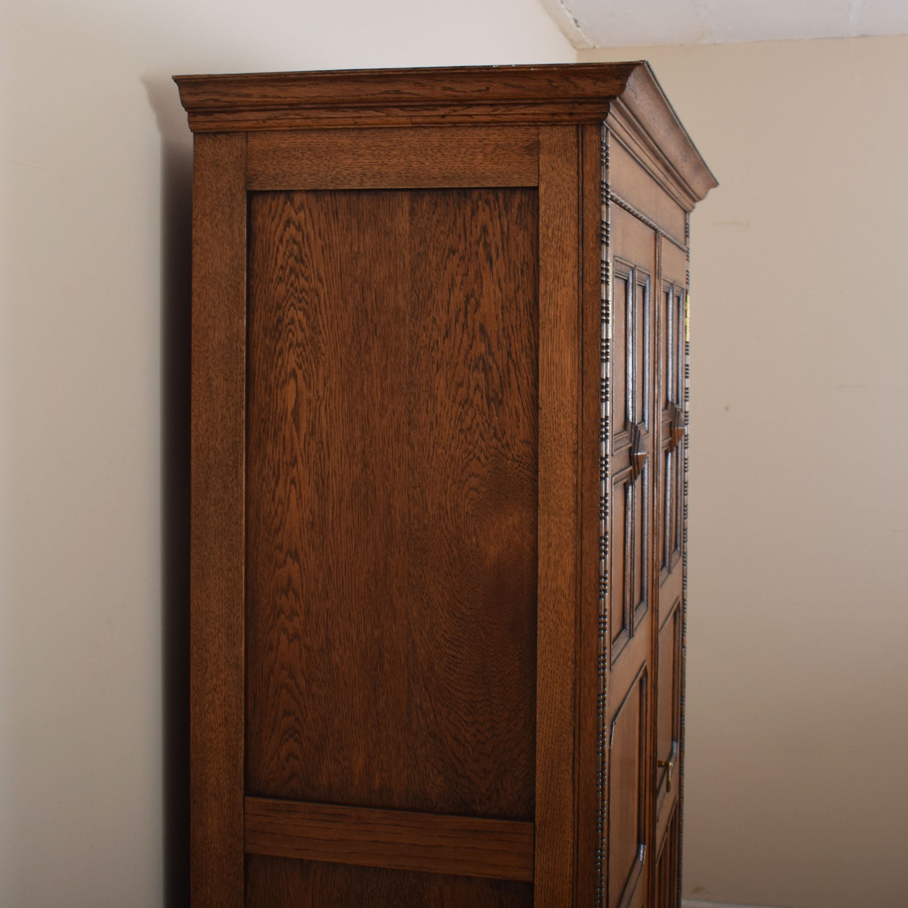 Our restoration workshop has stripped and cleaned this wardrobe before applying a professional matt lacquer that enhances the rich oak colour and grain. The dimensions show the maximum external measurements for this wardrobe. Inside, the hanging rail width is 96cm and gives a free hanging height of 90cm. The internal depth of the hall robe is 40cm, which is not sufficient for a standard coat hanger. It should be noted from the photographs that there is some minor damage to a corner and a split in a panel, but this does not detract from the overall look and appeal of this lovely piece..