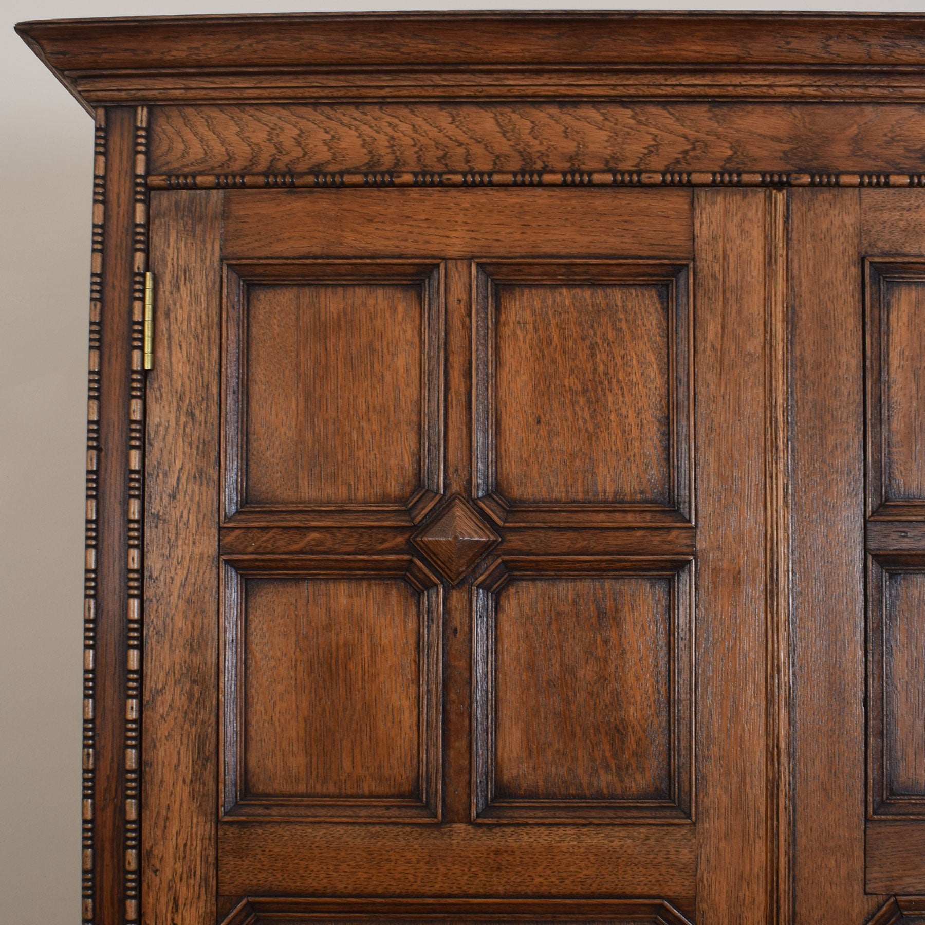Our restoration workshop has stripped and cleaned this wardrobe before applying a professional matt lacquer that enhances the rich oak colour and grain. The dimensions show the maximum external measurements for this wardrobe. Inside, the hanging rail width is 96cm and gives a free hanging height of 90cm. The internal depth of the hall robe is 40cm, which is not sufficient for a standard coat hanger. It should be noted from the photographs that there is some minor damage to a corner and a split in a panel, but this does not detract from the overall look and appeal of this lovely piece..
