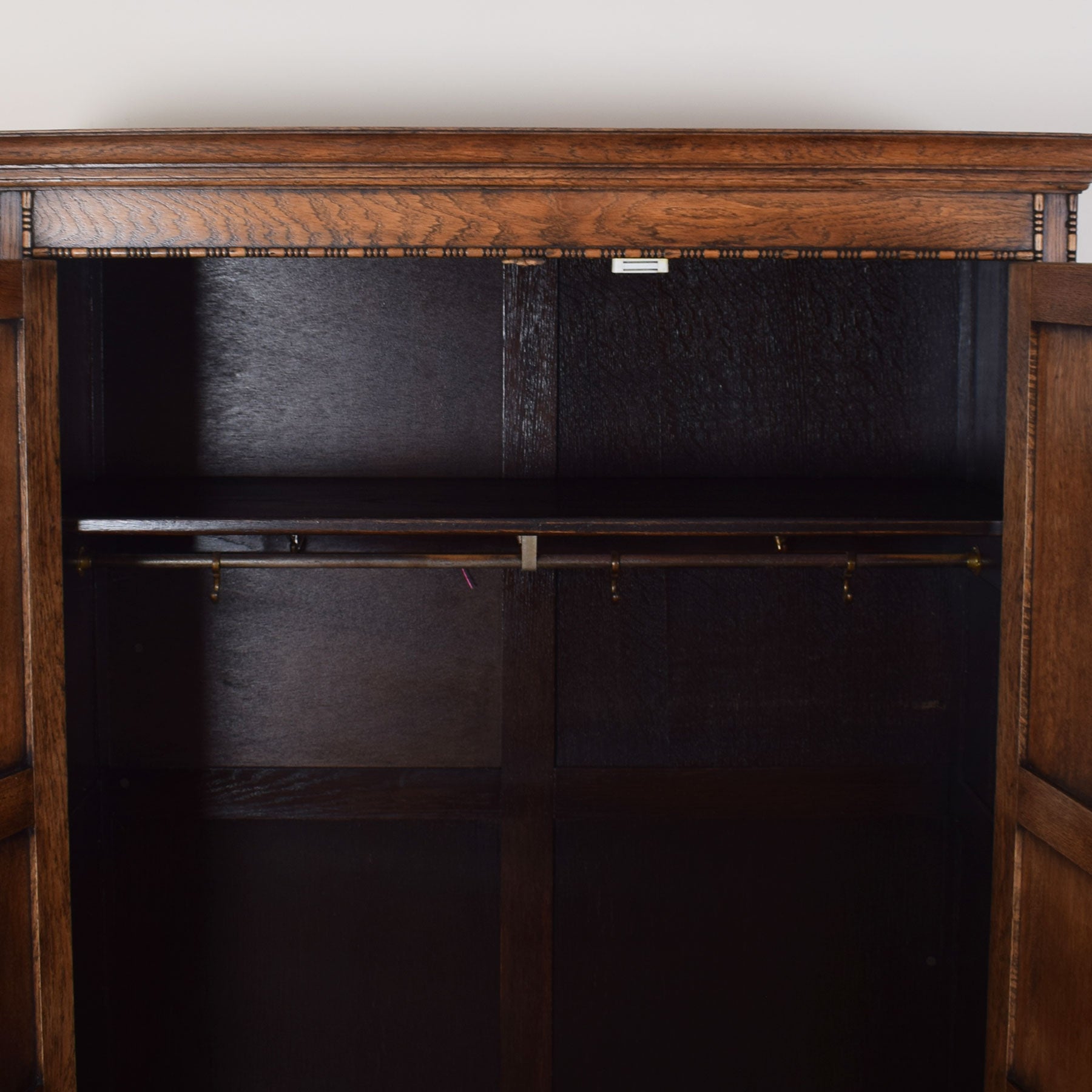 Our restoration workshop has stripped and cleaned this wardrobe before applying a professional matt lacquer that enhances the rich oak colour and grain. The dimensions show the maximum external measurements for this wardrobe. Inside, the hanging rail width is 96cm and gives a free hanging height of 90cm. The internal depth of the hall robe is 40cm, which is not sufficient for a standard coat hanger. It should be noted from the photographs that there is some minor damage to a corner and a split in a panel, but this does not detract from the overall look and appeal of this lovely piece..