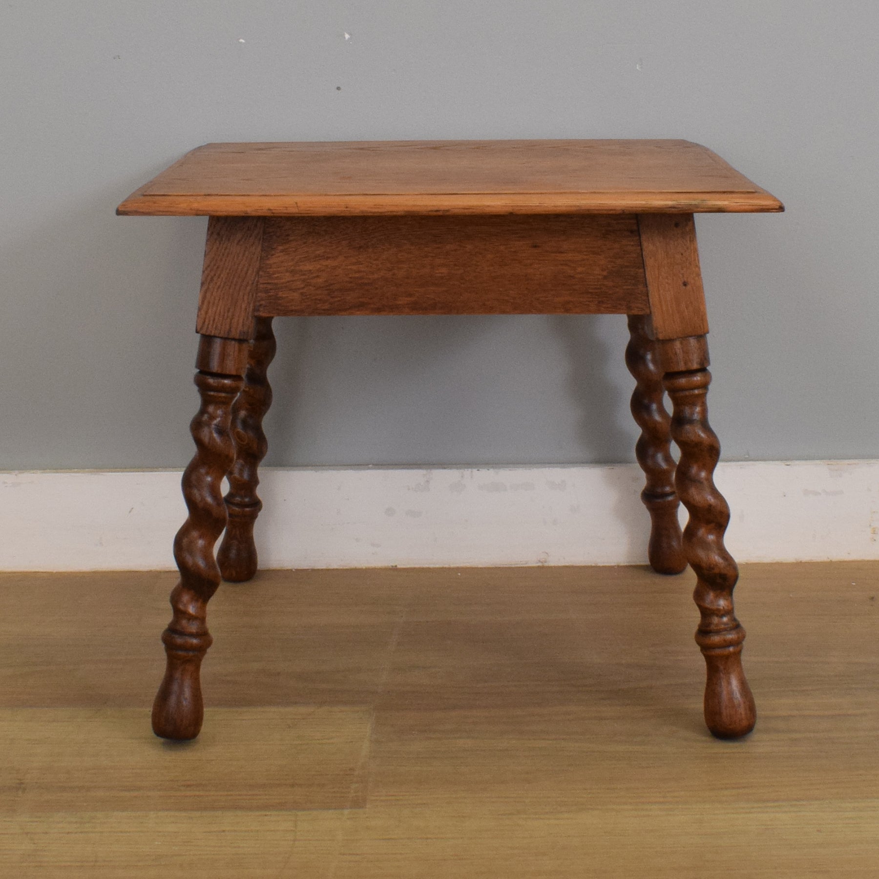 This charming oak side table features classic barley twist legs, bringing a sense of traditional craftsmanship and detail to its otherwise simple silhouette. The square top has gently bevelled edges and sits neatly above a plain apron, allowing the twisted legs to stand out as the defining feature.