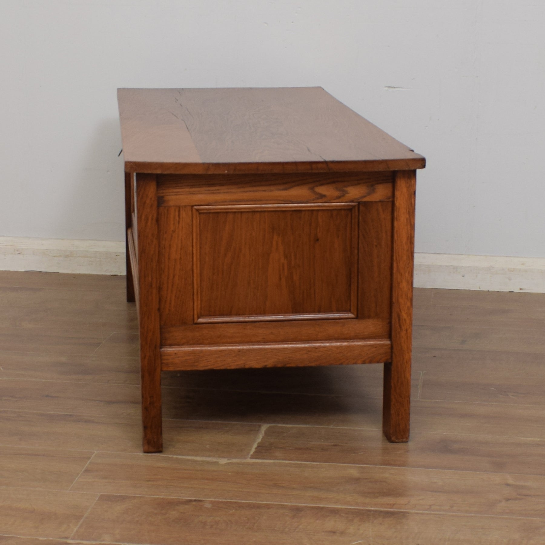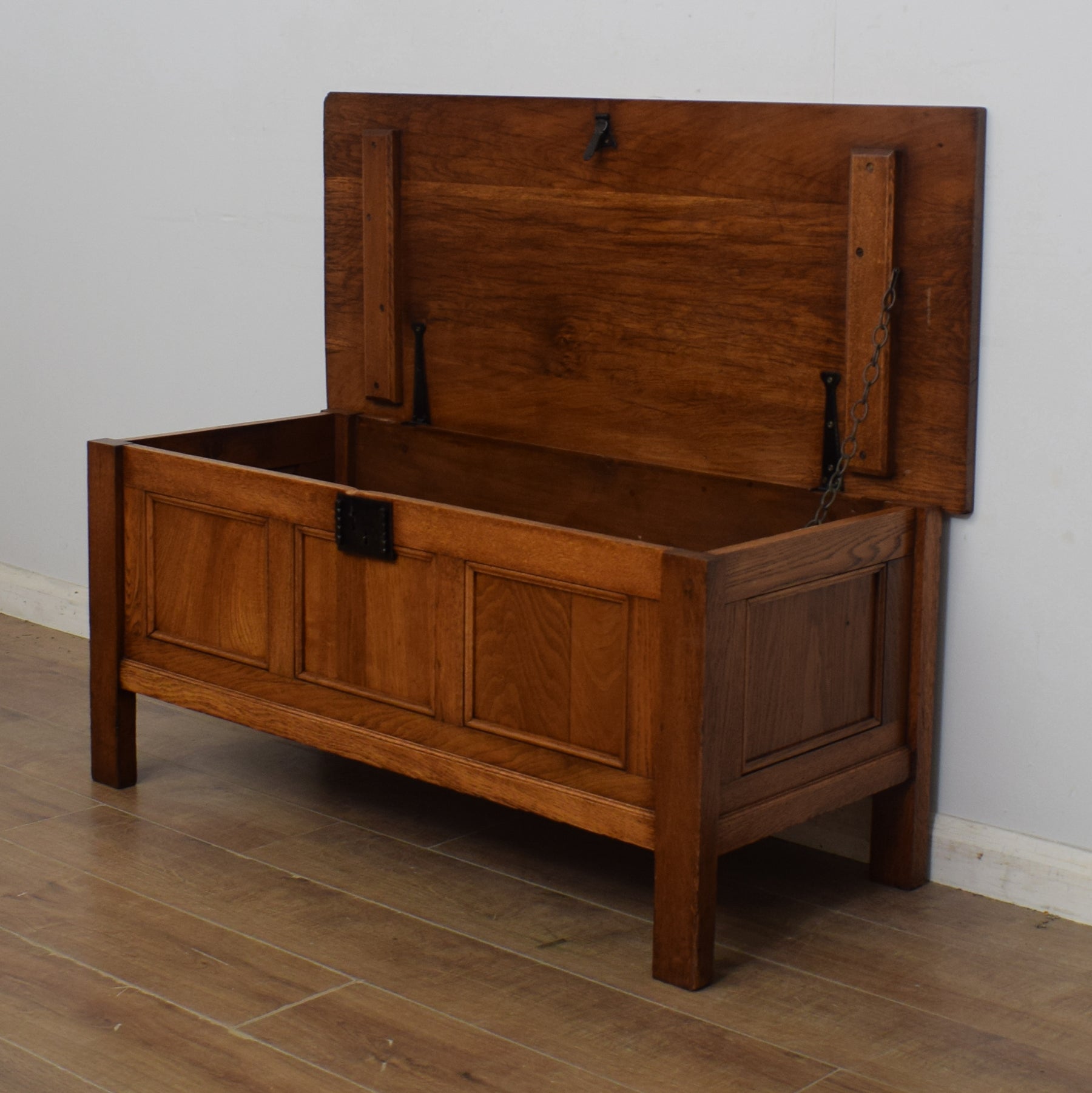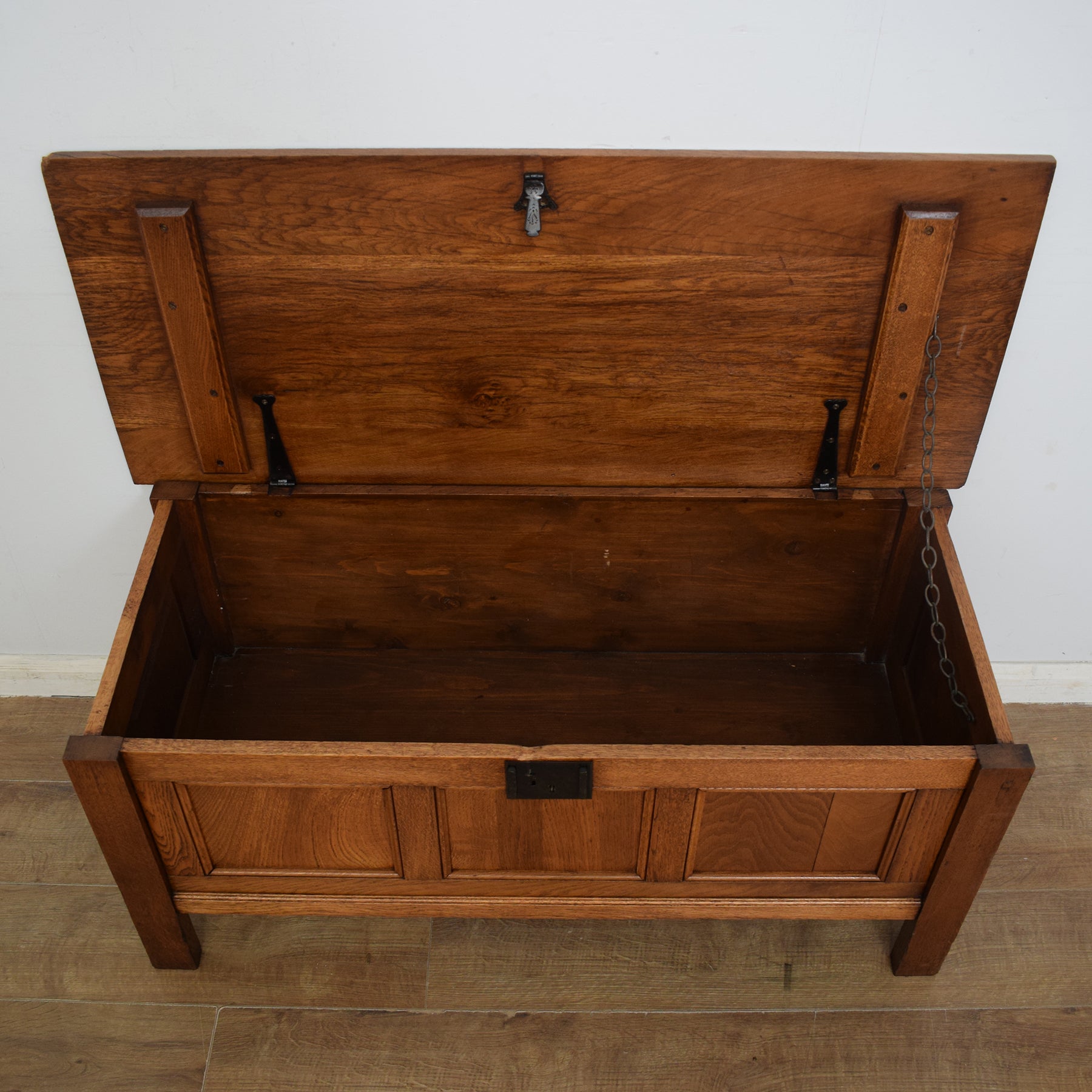 The lid opens to reveal a compartment perfect for tidily storing blankets, spare bedding, shoes, or even toys. A chain is attached to hold the lid open during use. The solid oak construction, combined with the rich tones of the oak grain, gives this box a lovely rustic look and feel throughout. There are some minor cosmetic imperfections on this box, which are consistent with age and use. These can be seen in the final three photos and do not affect the structural integrity of this box.