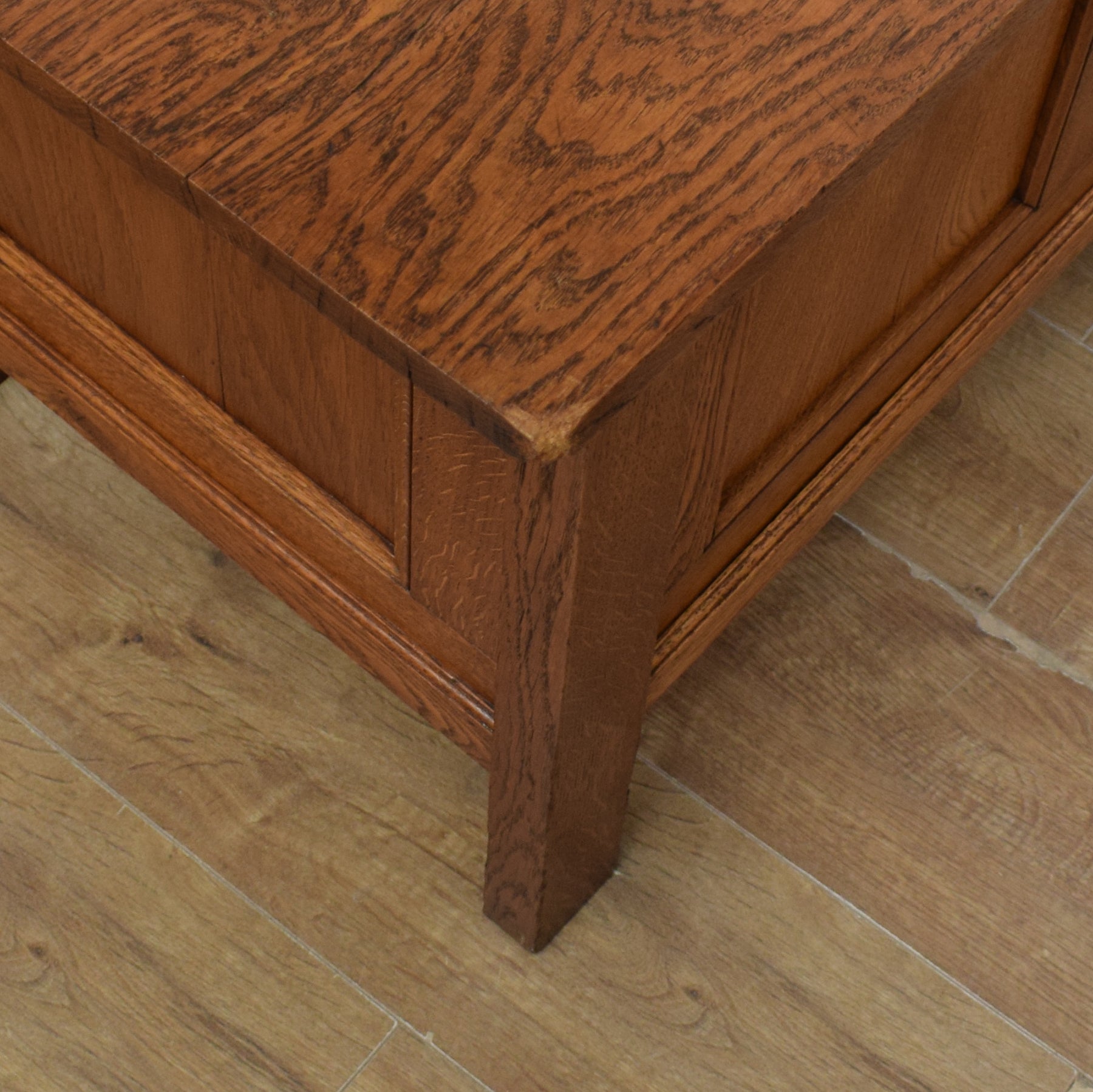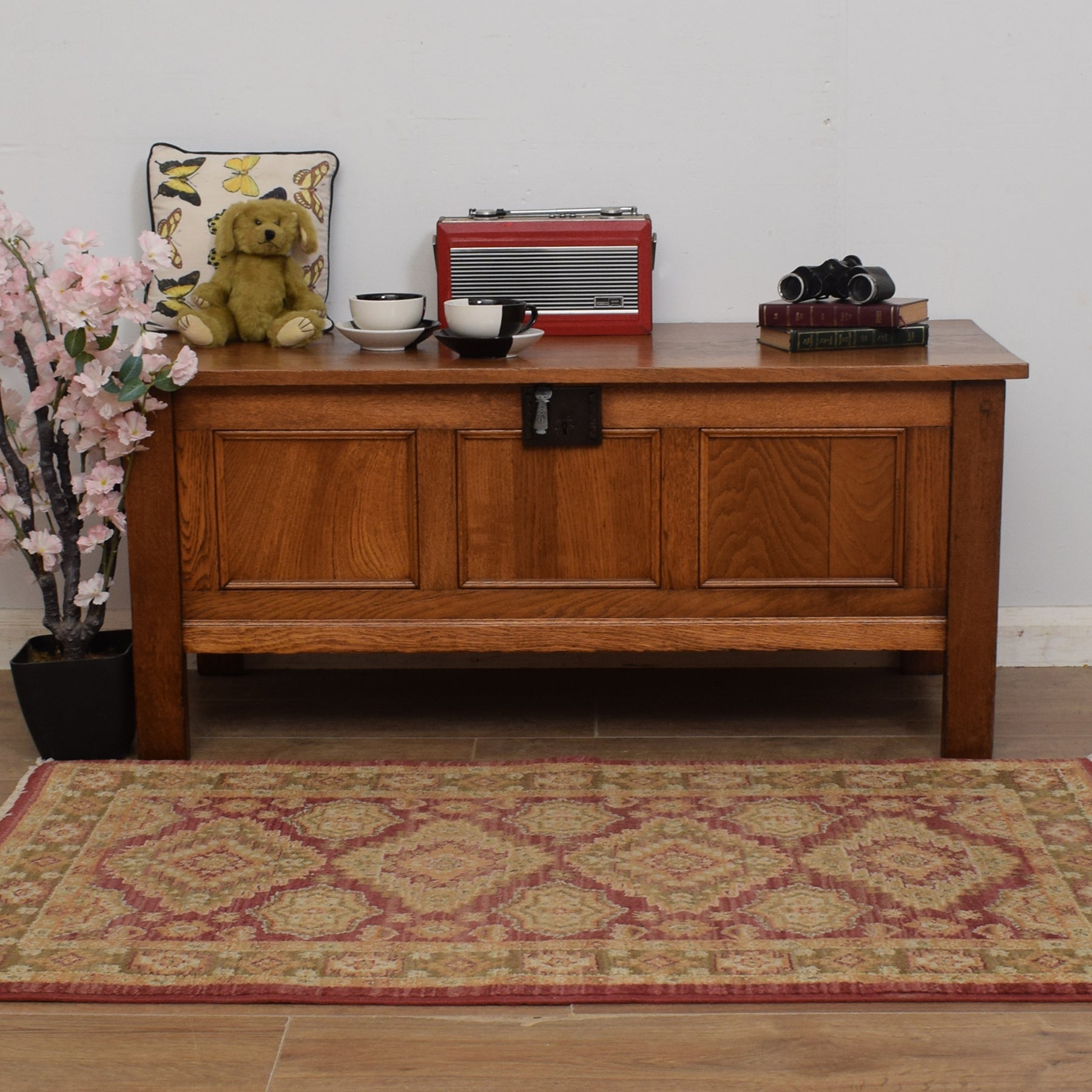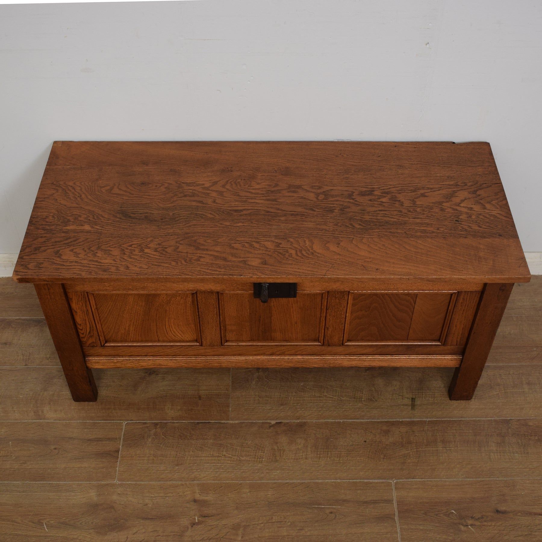 The lid opens to reveal a compartment perfect for tidily storing blankets, spare bedding, shoes, or even toys. A chain is attached to hold the lid open during use. The solid oak construction, combined with the rich tones of the oak grain, gives this box a lovely rustic look and feel throughout. There are some minor cosmetic imperfections on this box, which are consistent with age and use. These can be seen in the final three photos and do not affect the structural integrity of this box.