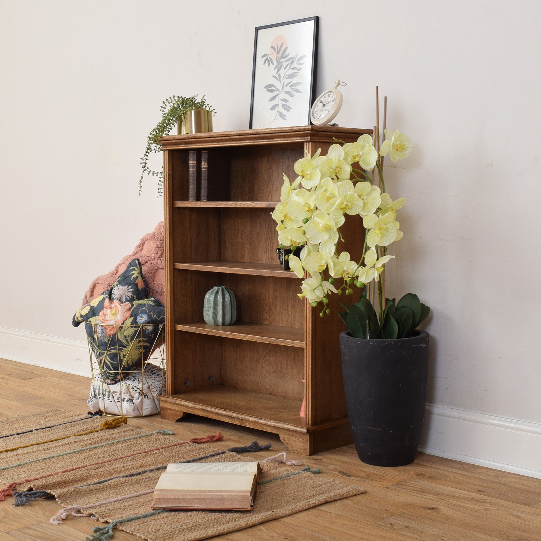 This oak bookcase features a classic, straightforward design with clean lines and a gently moulded top. It offers three spacious shelves, plus the bottom shelf,  providing ample room for books of varying heights as well as decorative items. The warm tone of the oak veneer highlights the natural grain pattern, giving the piece a timeless look that works comfortably in both traditional and modern interiors. Its compact proportions make it suitable for smaller rooms while still offering generous storage.