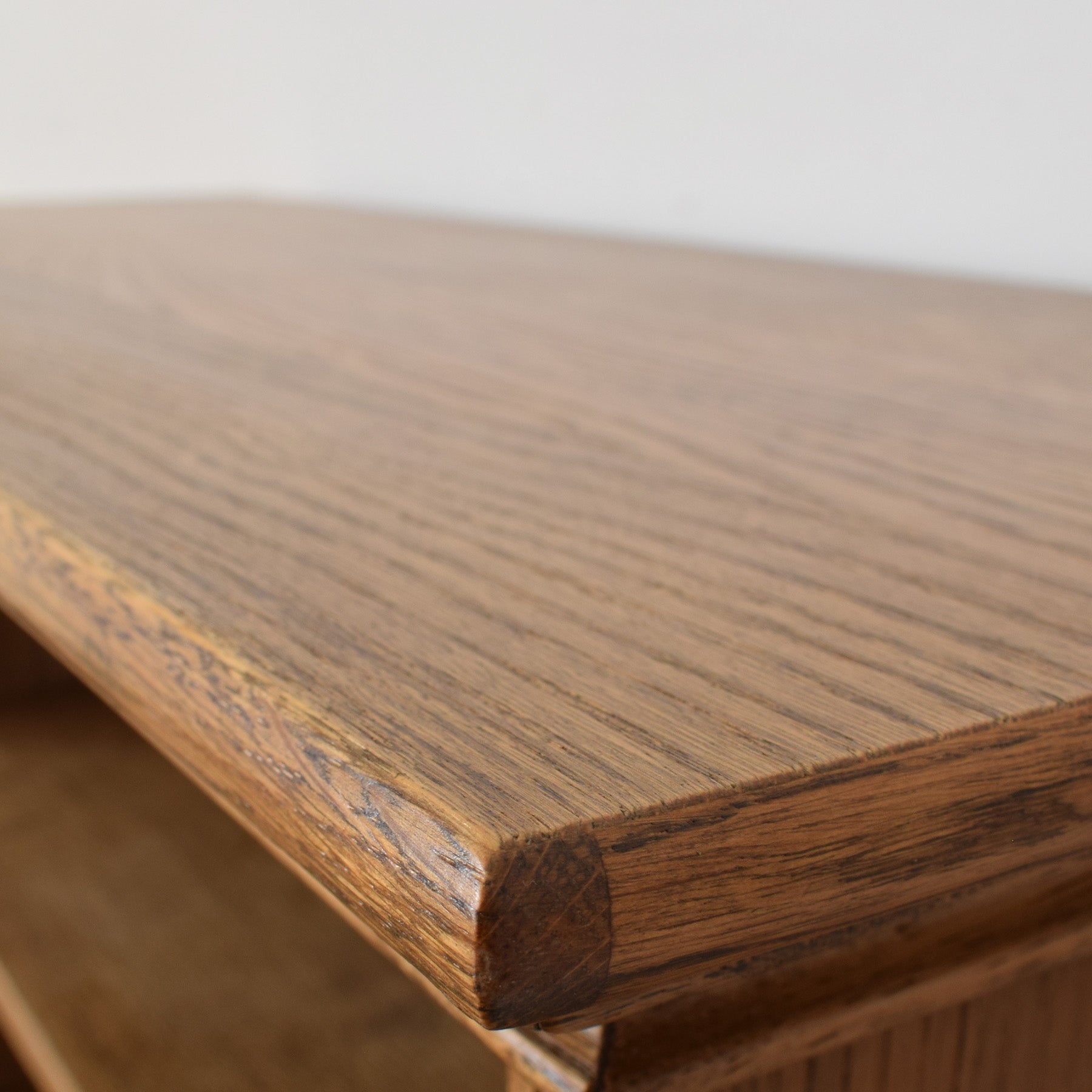 The previous darker stain has been stripped, and then multiple coats of hard-wearing matte lacquer have been applied, providing a durable long-lasting finish, while also accentuating the natural oak grain. This item is made from compressed material, covered with an oak veneer. The back of the item is made from plywood.