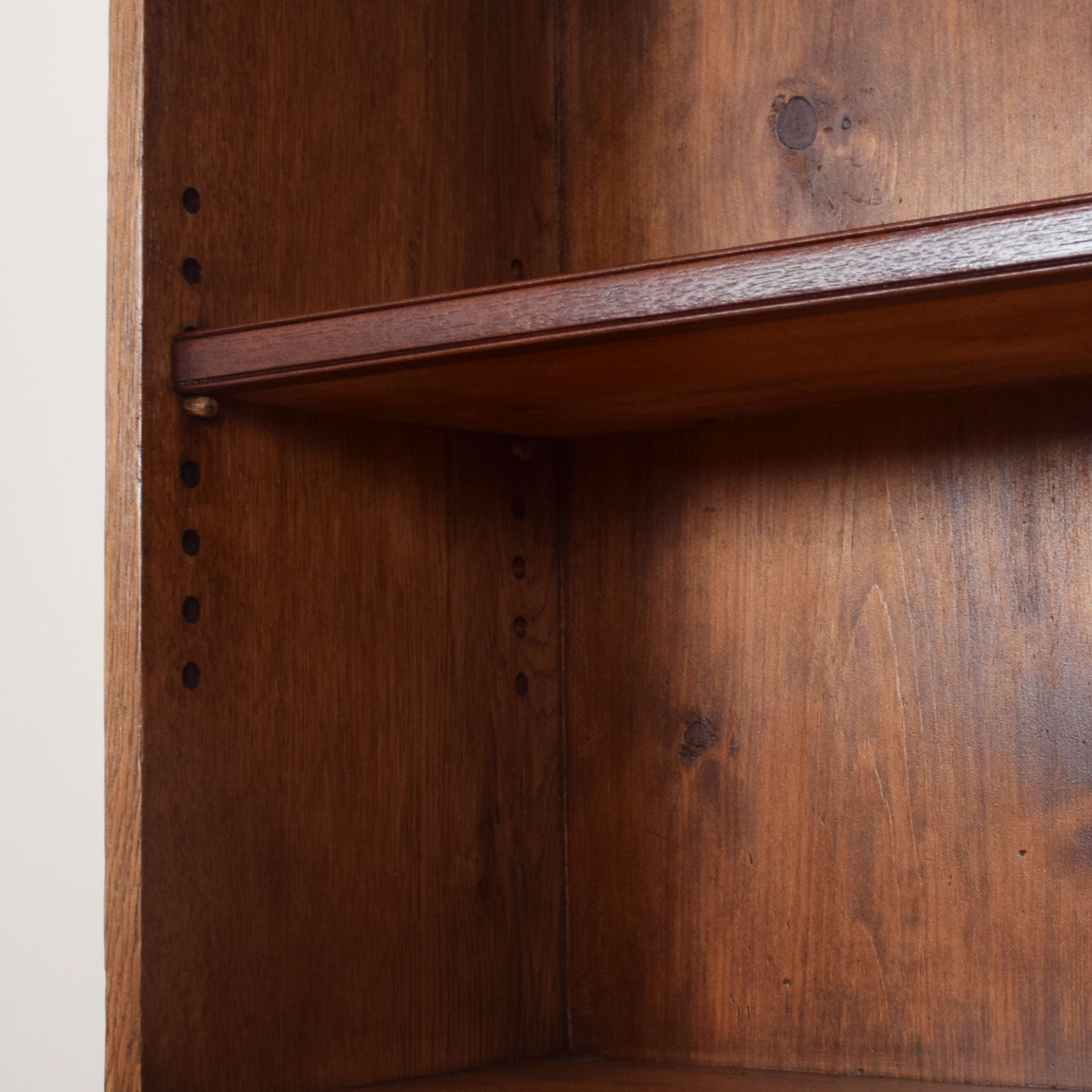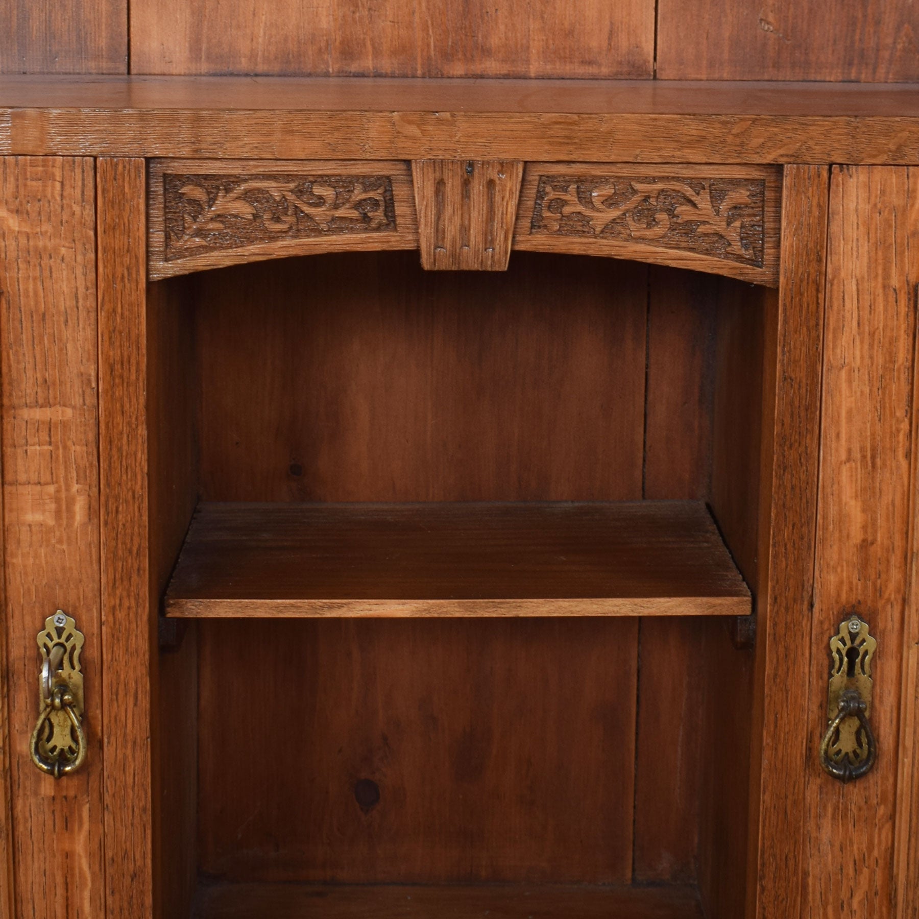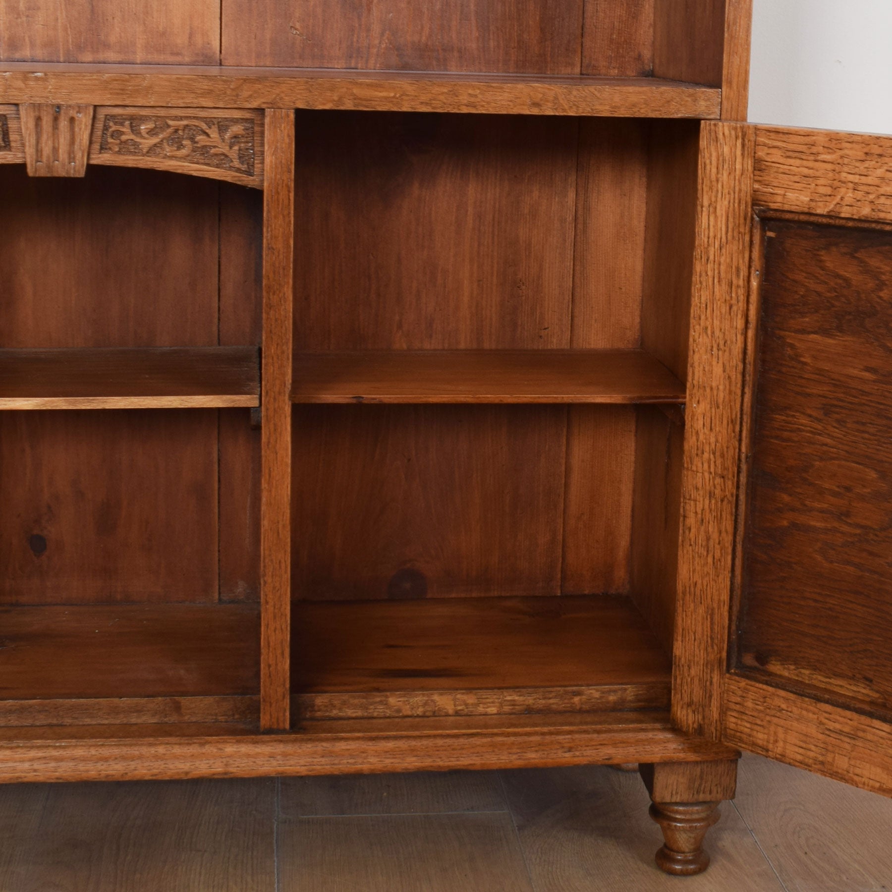 Our restoration workshop has stripped the original varnish from this piece before applying a professional matt lacquer that enhances the natural character of the oak as well as providing a good level of everyday protection. The cupboard door locks both work cleanly with the single key supplied. The dimensions show the maximum height of this bookcase including the carved detail on the top, followed in brackets by the height of the main top surface.